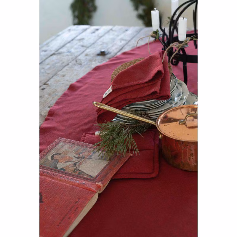 Rund duk Ø160 cm i återvunnen bomull och polyester. Tålig, stilren och miljövänlig – ger bordet en elegant och naturlig känsla.