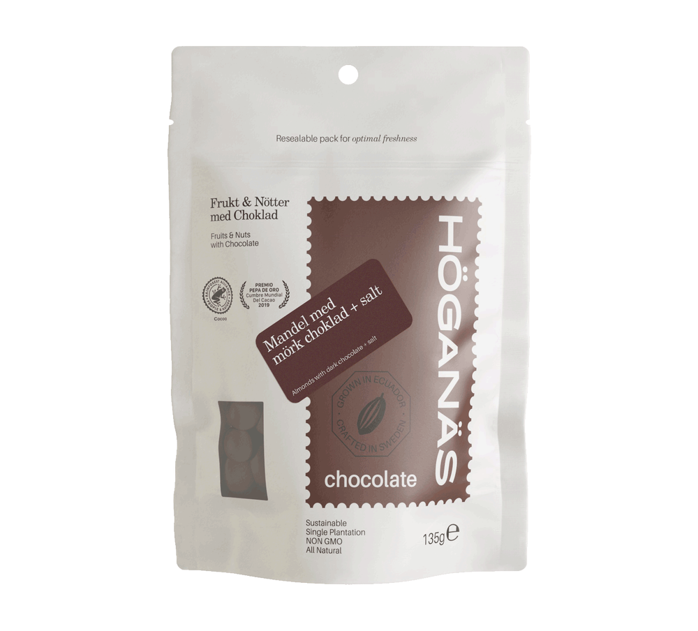 Noggrant utvalda och lätt rostade salta mandlar täckta av lätt bitter 60% mörk choklad, vilket gör det till en av våra svenska favoritkombinationer.