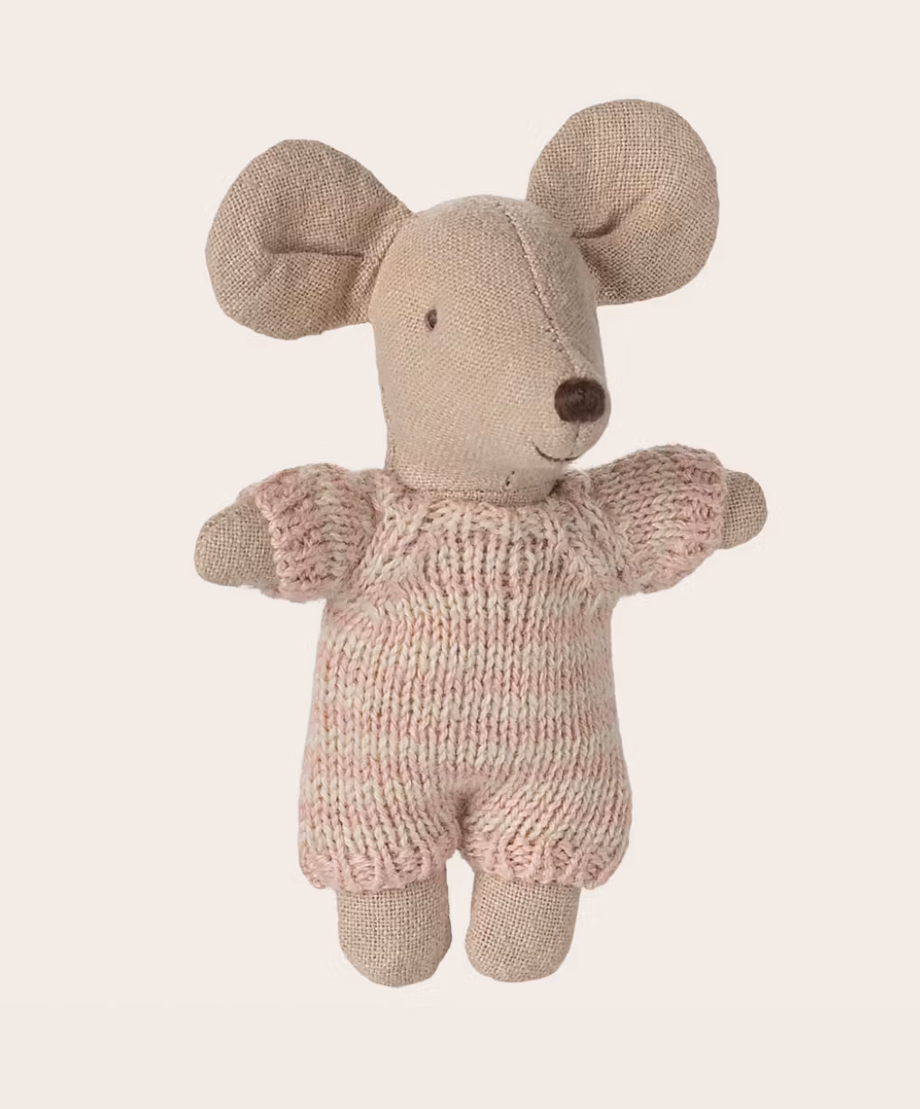 En liten Maileg baby mus klädd i en mjuk, stickad dräkt med ränder – redo för många timmars sömn i sin mysiga, vadderade bärsäng.