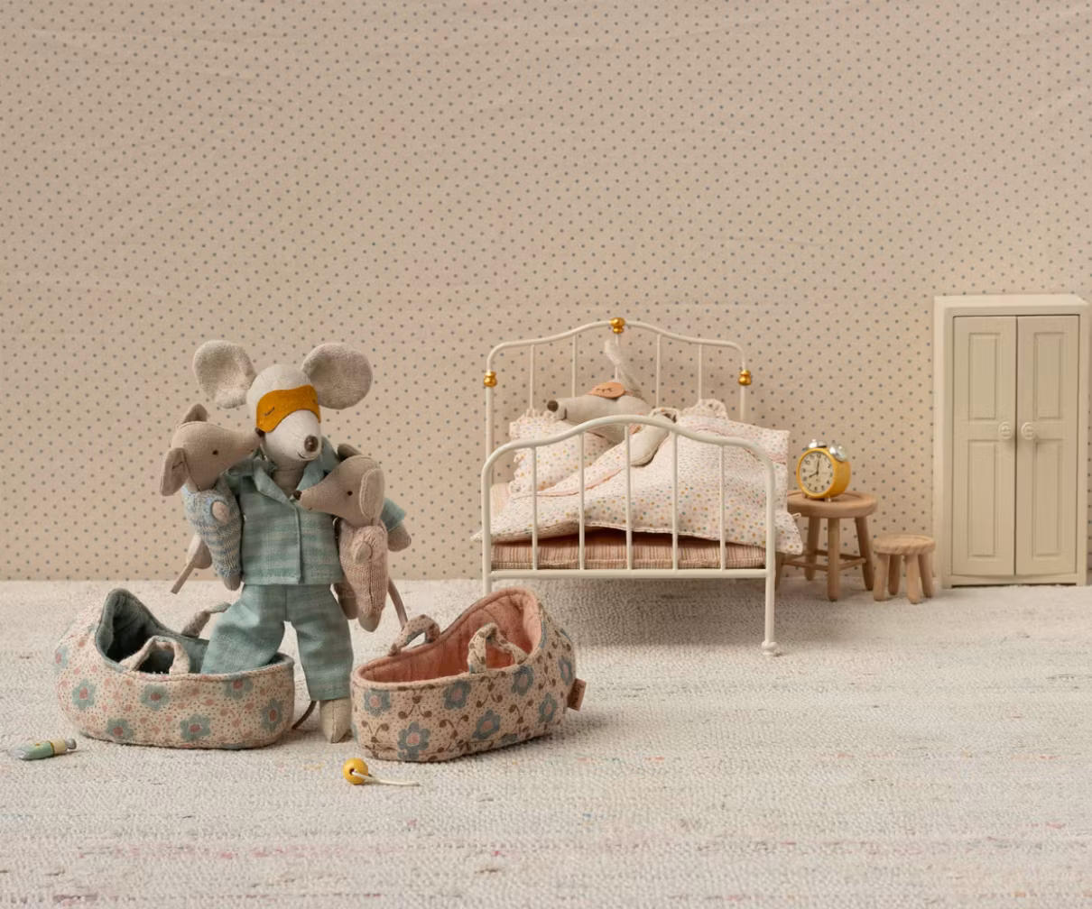 Bedårande Maileg baby mus i stickad dräkt och quiltad bärsäng. Perfekt som gåva eller samlarfigur. Tvättbar och säker från 3 år.