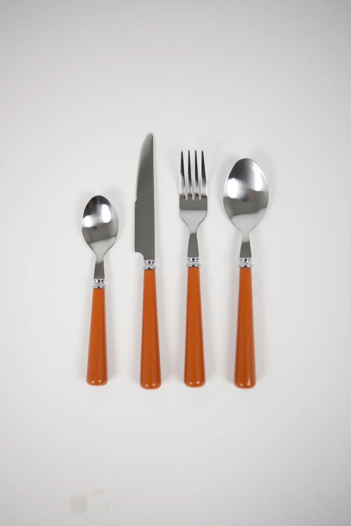 Ett livfullt bestickset som genast sätter tonen kring bordet. Den varma, orange nyansen ger en lekfull kontrast till det blanka stålet och skapar en dukning som känns både inbjudande och personlig.