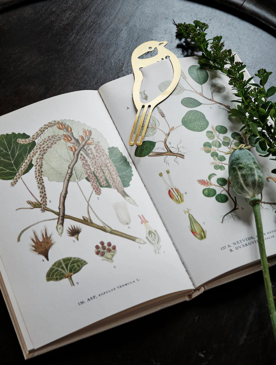 Detta bokmärke i form av en fågel är en liten men uttrycksfull detalj, skapad i metall med en varm mässingsfinish. Formen är enkel och mjuk, men bär på en känsla av rörelse – som om fågeln just slagit sig till ro mellan sidorna.