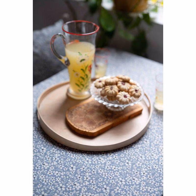 En duk som för tankarna till sommarbord vid öppna fönster, där ljuset silas in och tiden får gå lite långsammare. Det småblommiga mönstret ger ett mjukt och levande uttryck, medan den blå nyansen tillför en sval och rogivande känsla till dukningen.