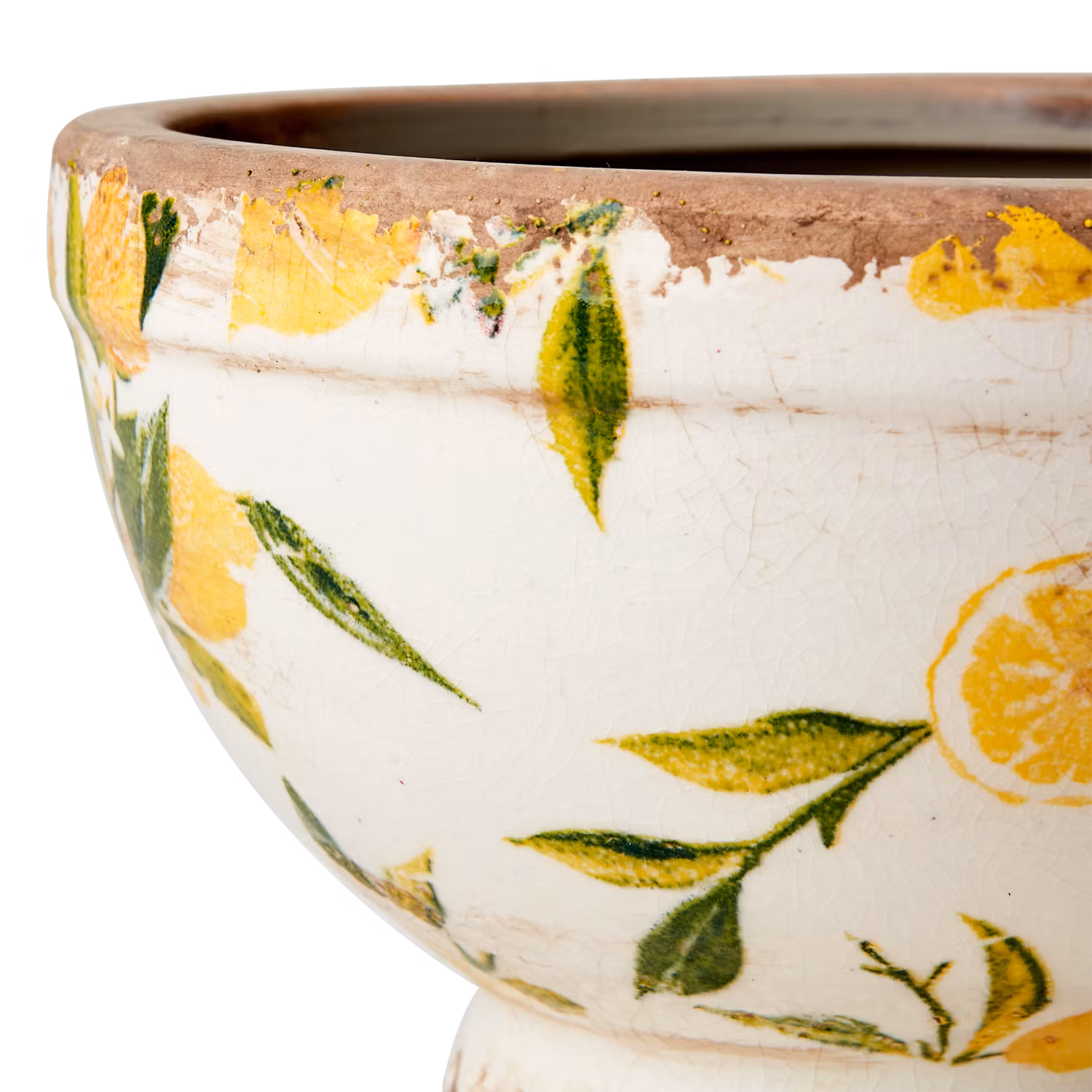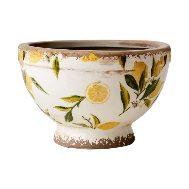 Kruka LEMONA liten – stengodskruka i vit/grön/gul. Innermått Ø14 cm, höjd 11 cm. Passar små växter och dekorativa planteringar.