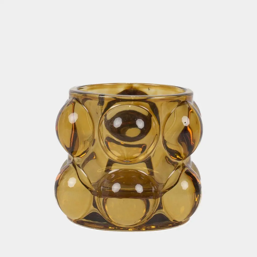 Liten ljuslykta i bärnstensfärgat glas med dekorativa bubblor. Sprider ett varmt, mjukt sken och skapar en stämningsfull känsla i hemmet. Höjd 7 cm.