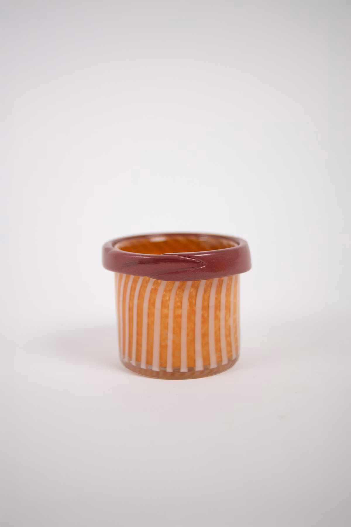 Ray ljuslykta i persika. Handgjord randig glaslykta med lekfull design som sprider glädje och ljus. Varje lykta är unik och ger ett varmt sken.