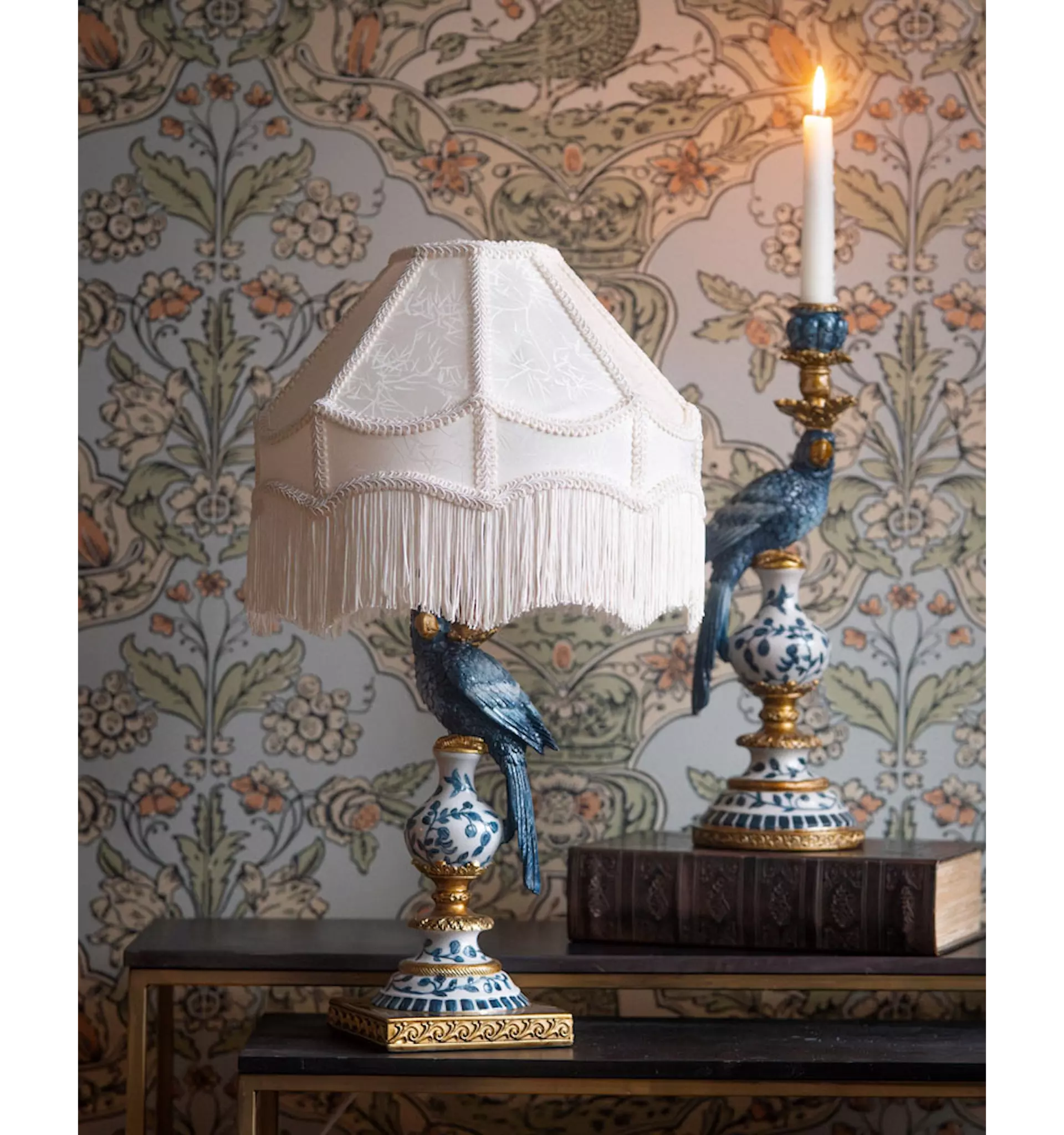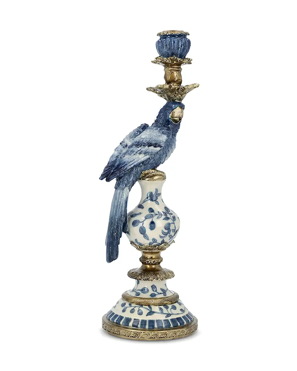 Blå ljusstake med papegoja. En exotisk detalj som sätter färg och personlighet på rummet.