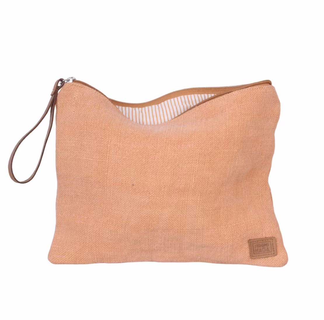 En stilren necessär i jute med en mjuk, fin persikoton – perfekt som följeslagare på resor eller för vardagligt bruk.