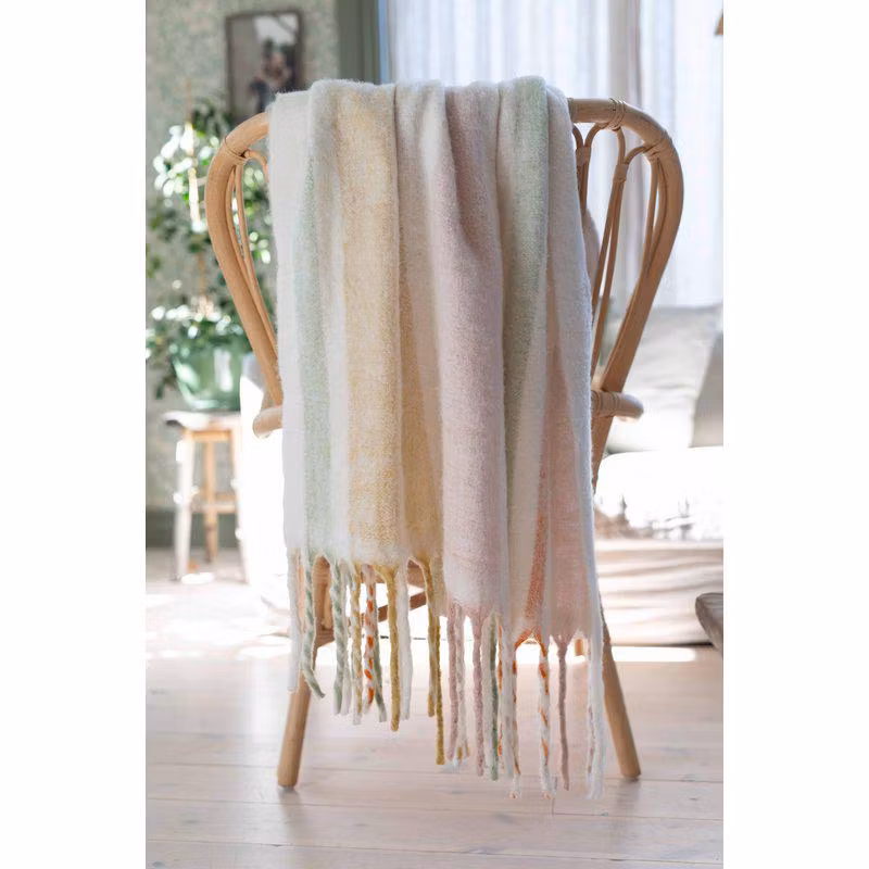 Mjuk och fluffig pläd i multi med vårfärger och fransar. 130x170 cm i akryl och ull – varm, dekorativ och inbjudande.