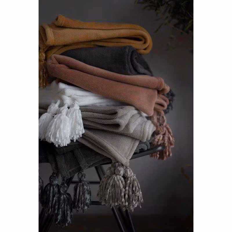 Denna fleecepläd har en unik touch av elegans med chenille tofsar i hörnen, vilket ger den en extra charmig och lyxig look.