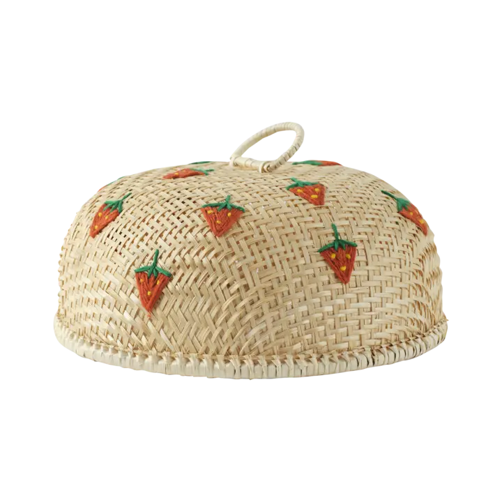 Dekorativt tårtskydd i bambu med naturfärg och röda detaljer. Perfekt för att skydda kakor och tårtor vid fika, kalas eller sommarens dukningar.