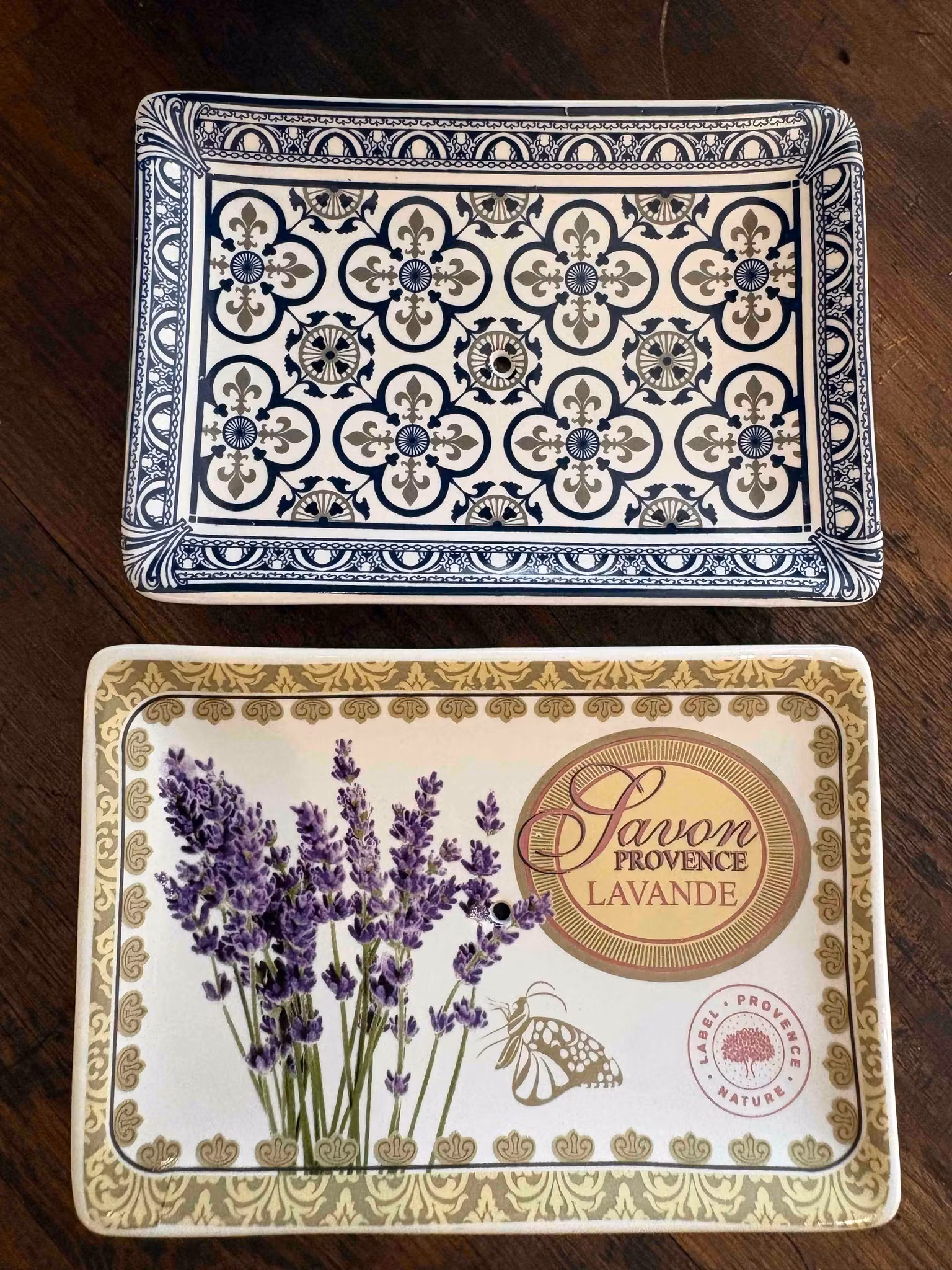 Rektangulärt tvålfat i porslin som finns i lavendel och mosaik blå. En dekorativ detalj till badrum eller kök.