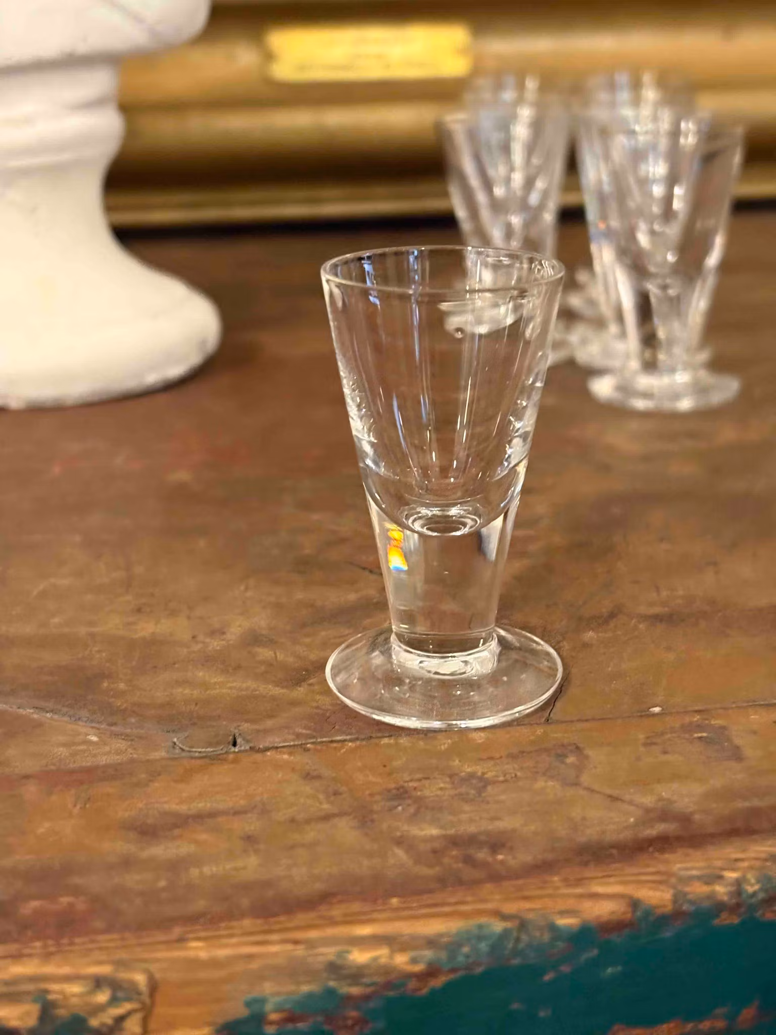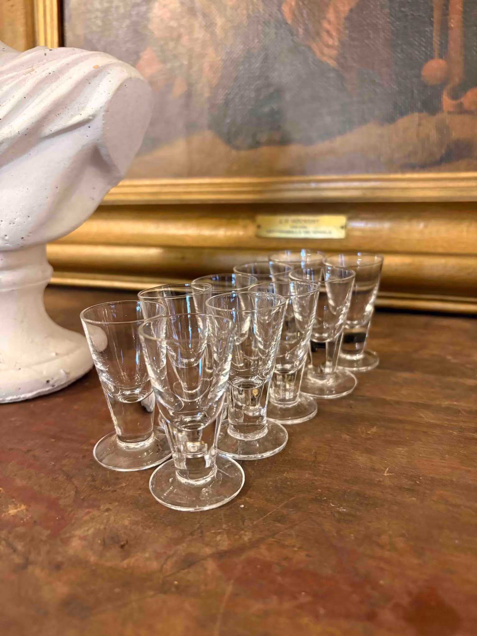 Tio små snapsglas på fot, ca 2 cl vardera, med elegant och enkel form. Glasen är i fint skick och passar perfekt till snaps, likör eller andra små drycker vid dukningen.
