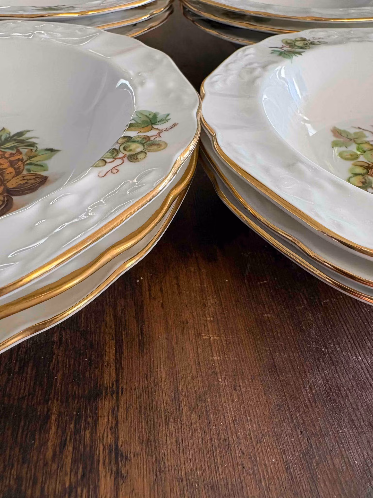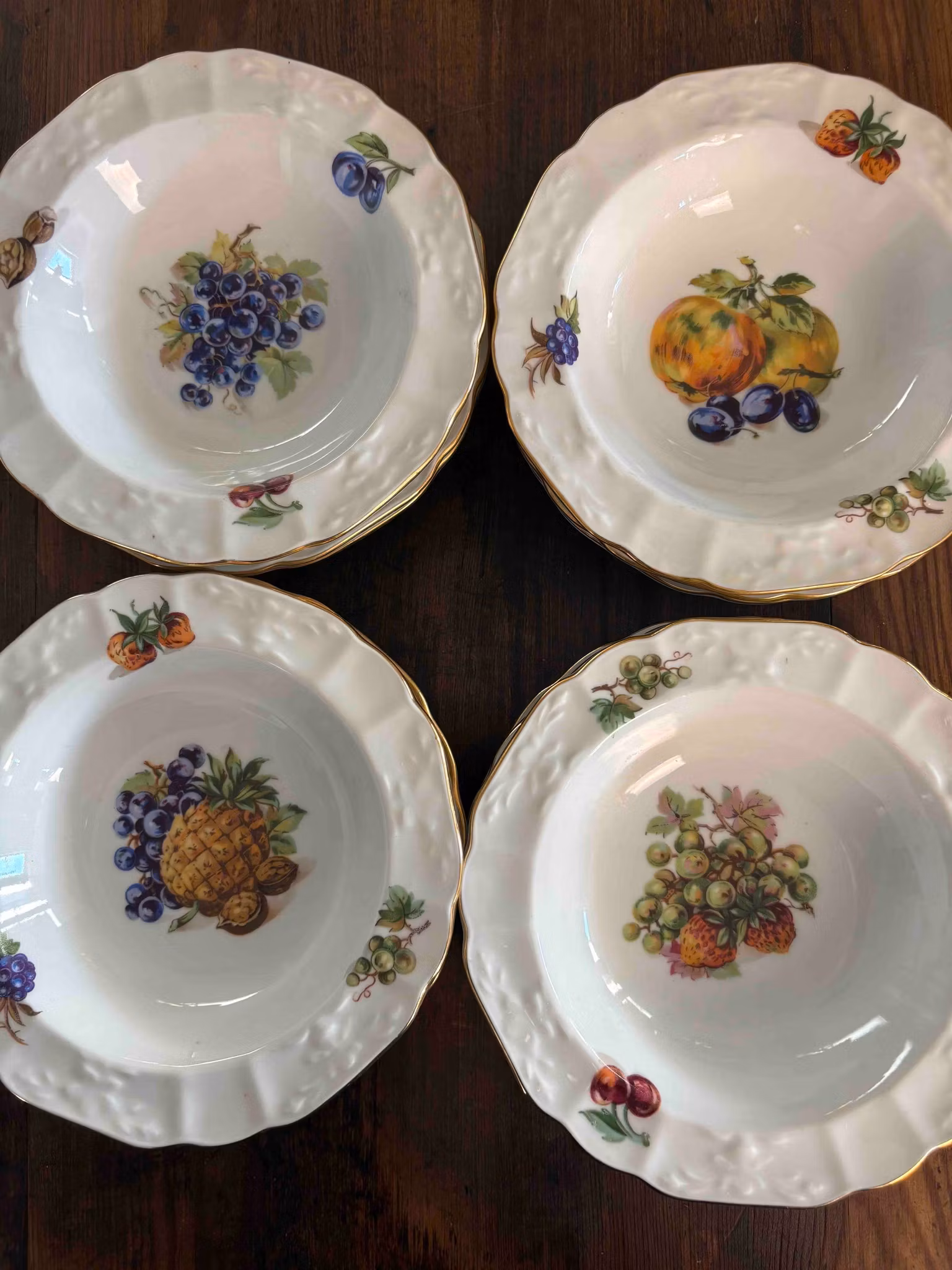 12 st dessertskålar i fint skick – fyra olika motiv, tre av varje. Ø ca 16 cm. Perfekta för en levande och personlig dukning.