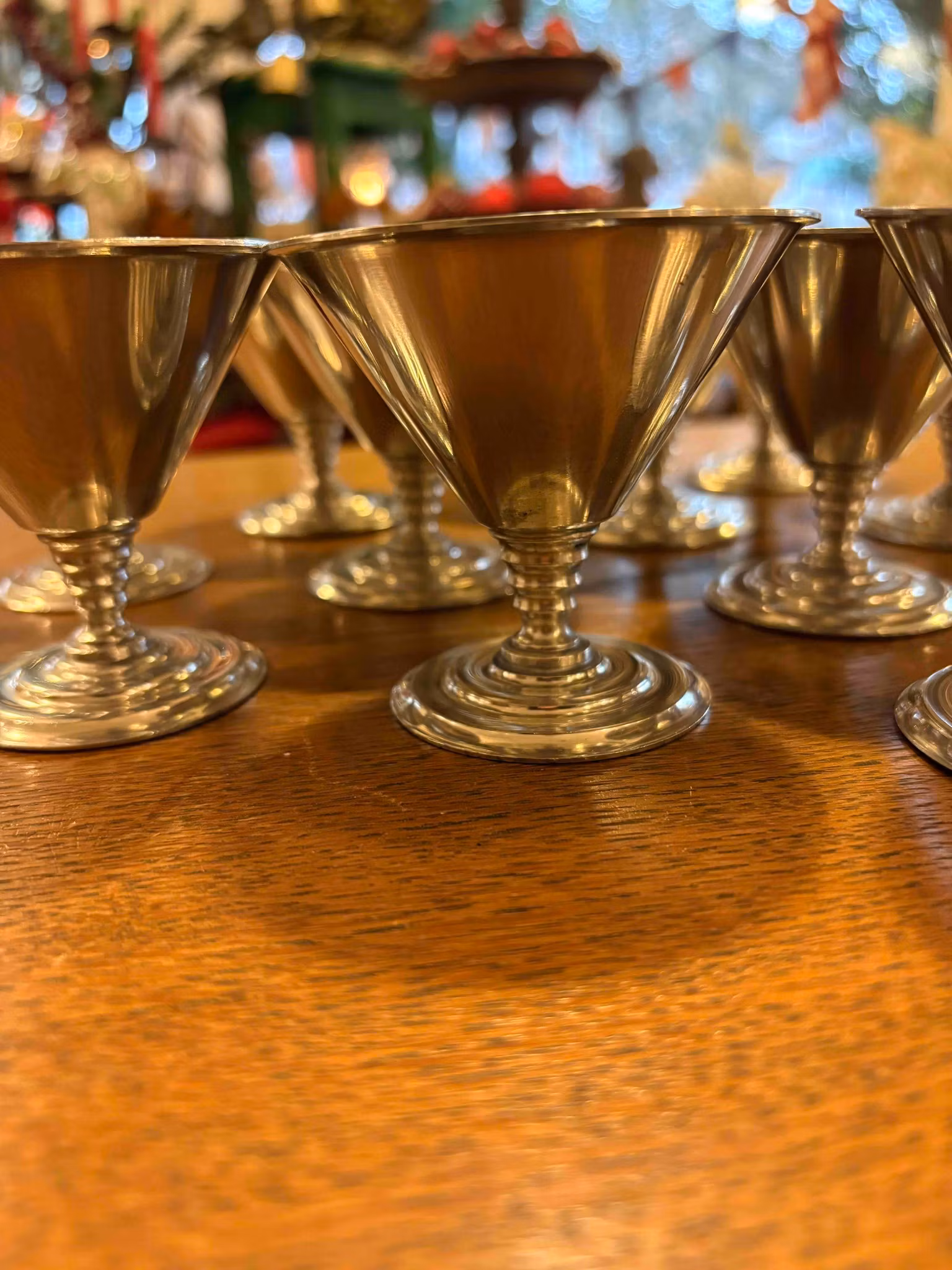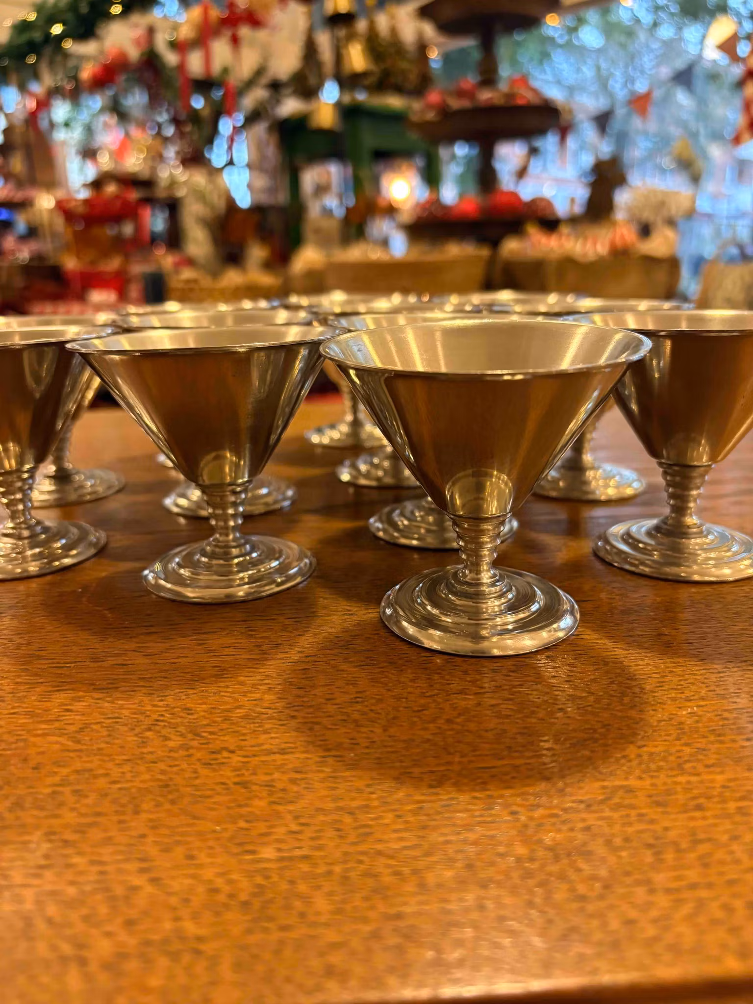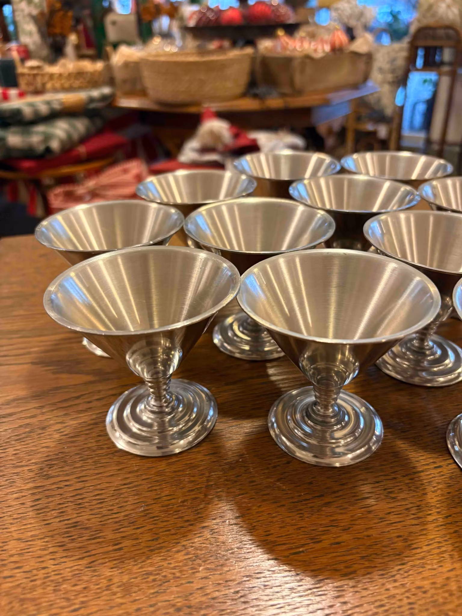 Här har du ett set om tolv martiniglas tillverkade i vitmetall av BM Pewter, Norway. De har ett härligt bruksskick som ger dem karaktär, och den lilla formen gör dem perfekta för att servera en kula glass, sorbet eller små förrätter. Robust, vackert och med den där lite högtidliga känslan som bara äldre metallföremål kan bära.