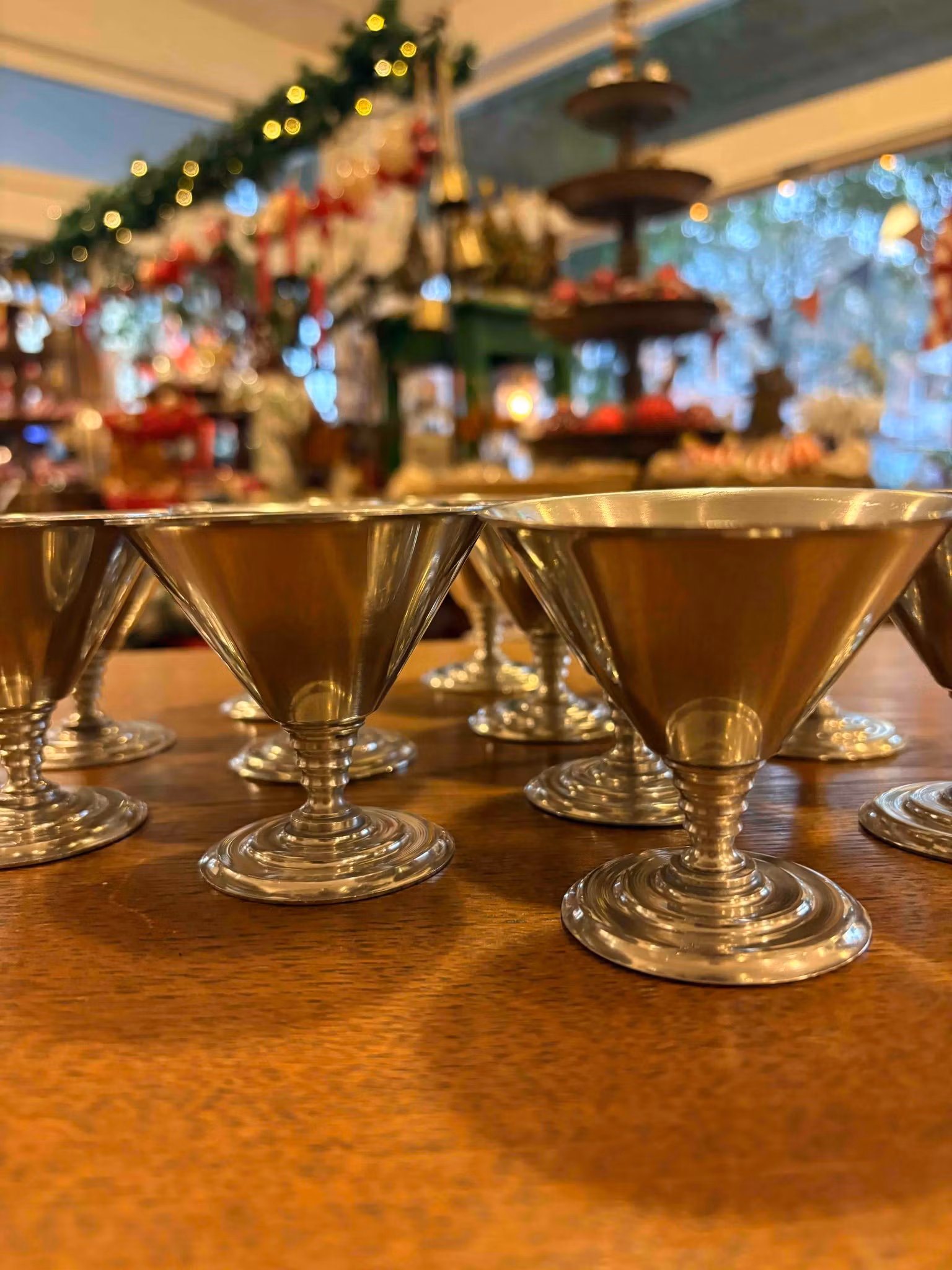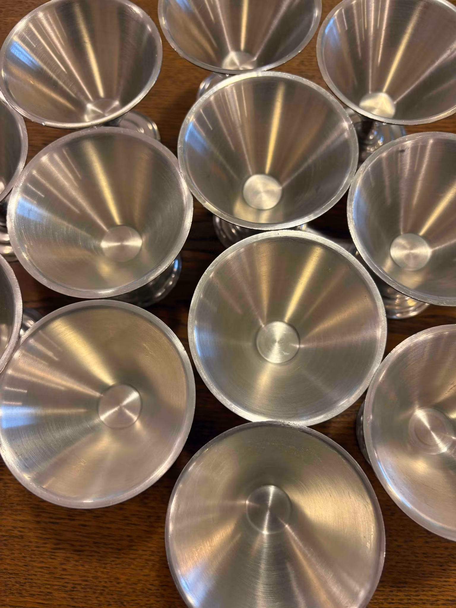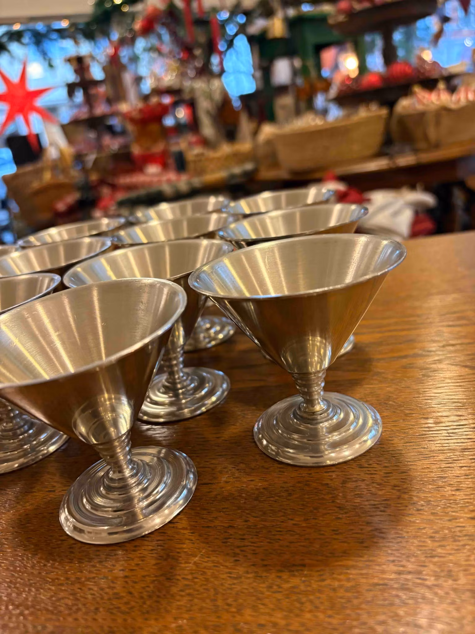 Här har du ett set om tolv martiniglas tillverkade i vitmetall av BM Pewter, Norway. De har ett härligt bruksskick som ger dem karaktär, och den lilla formen gör dem perfekta för att servera en kula glass, sorbet eller små förrätter. Robust, vackert och med den där lite högtidliga känslan som bara äldre metallföremål kan bära.