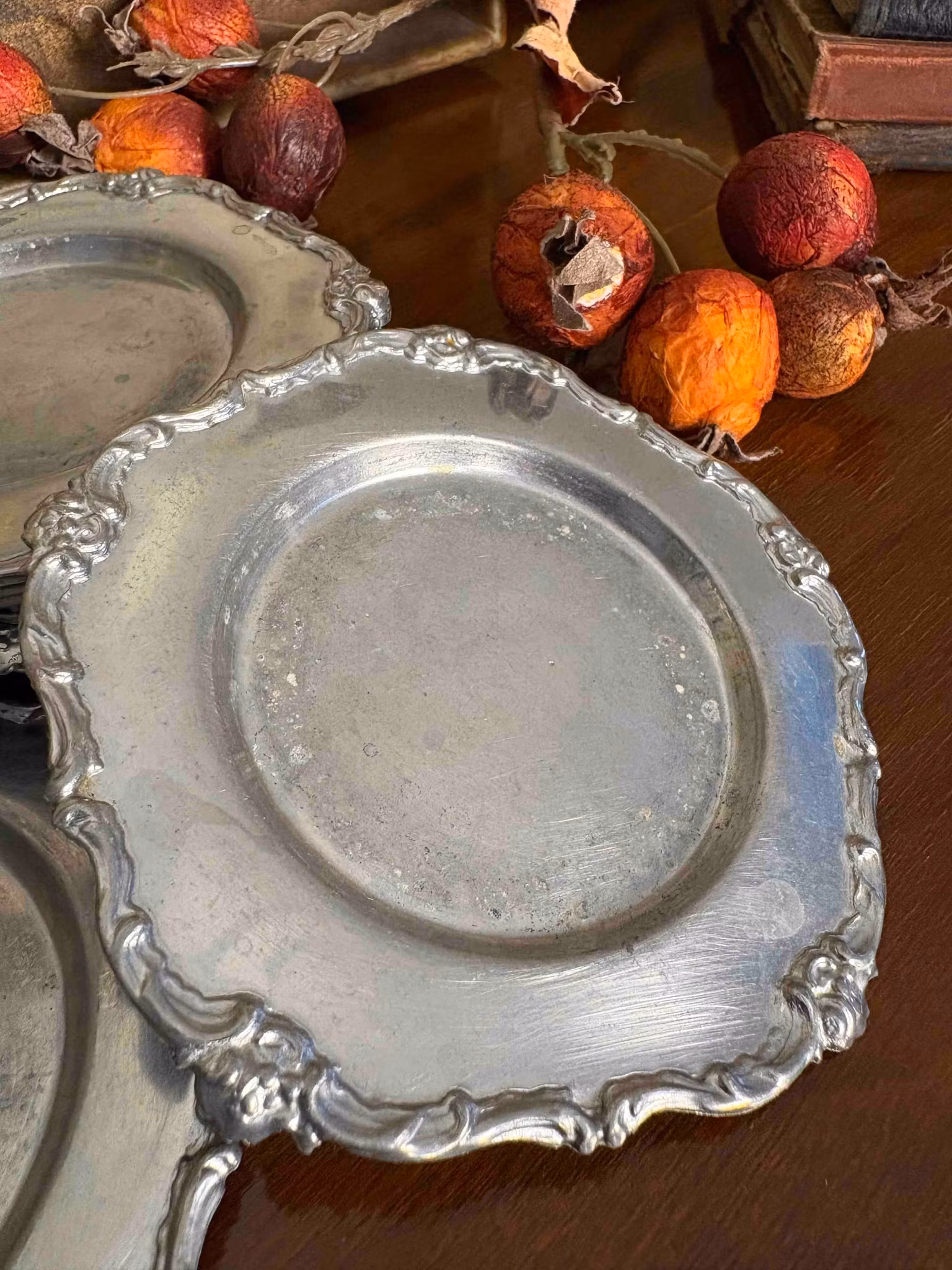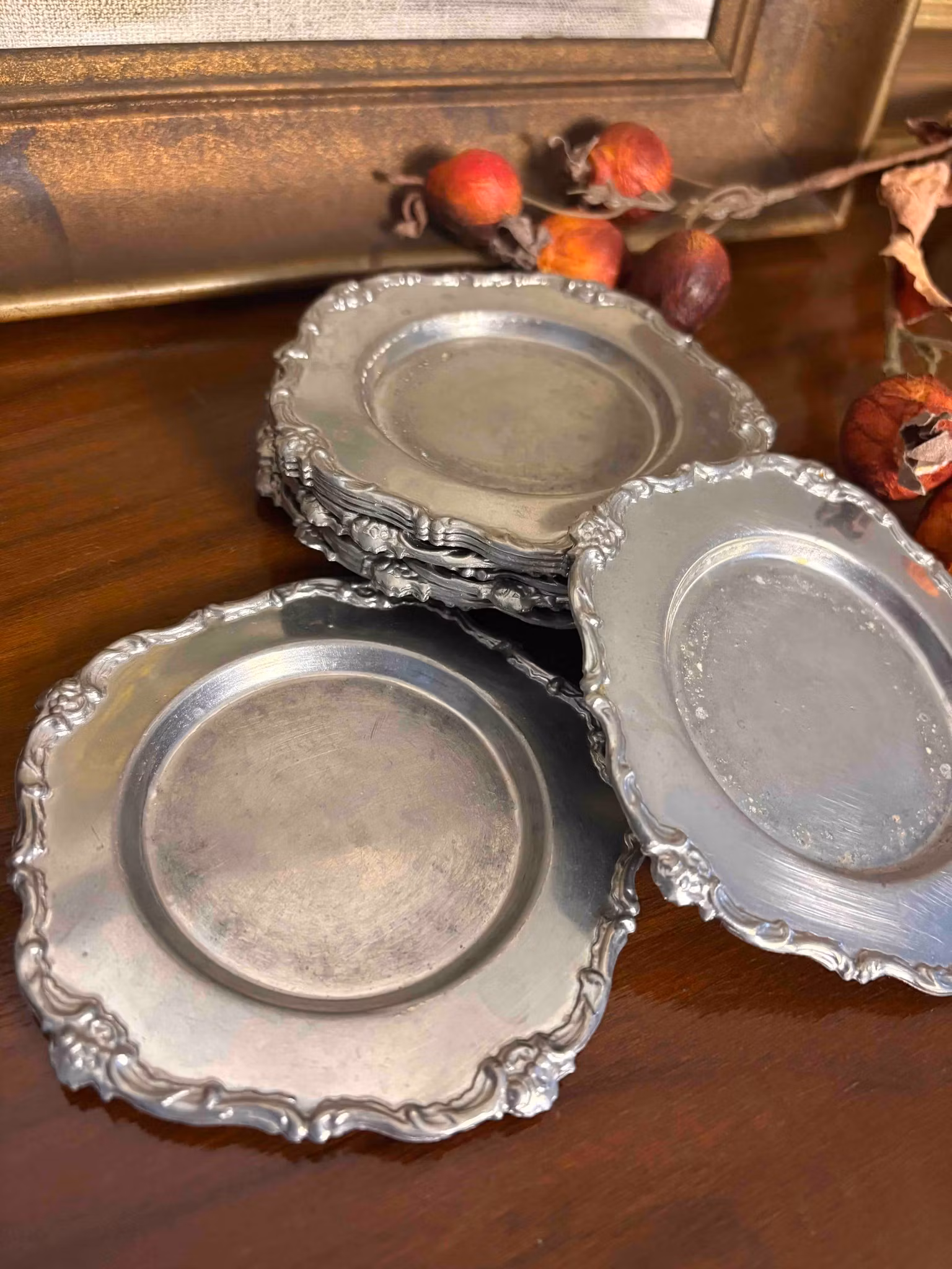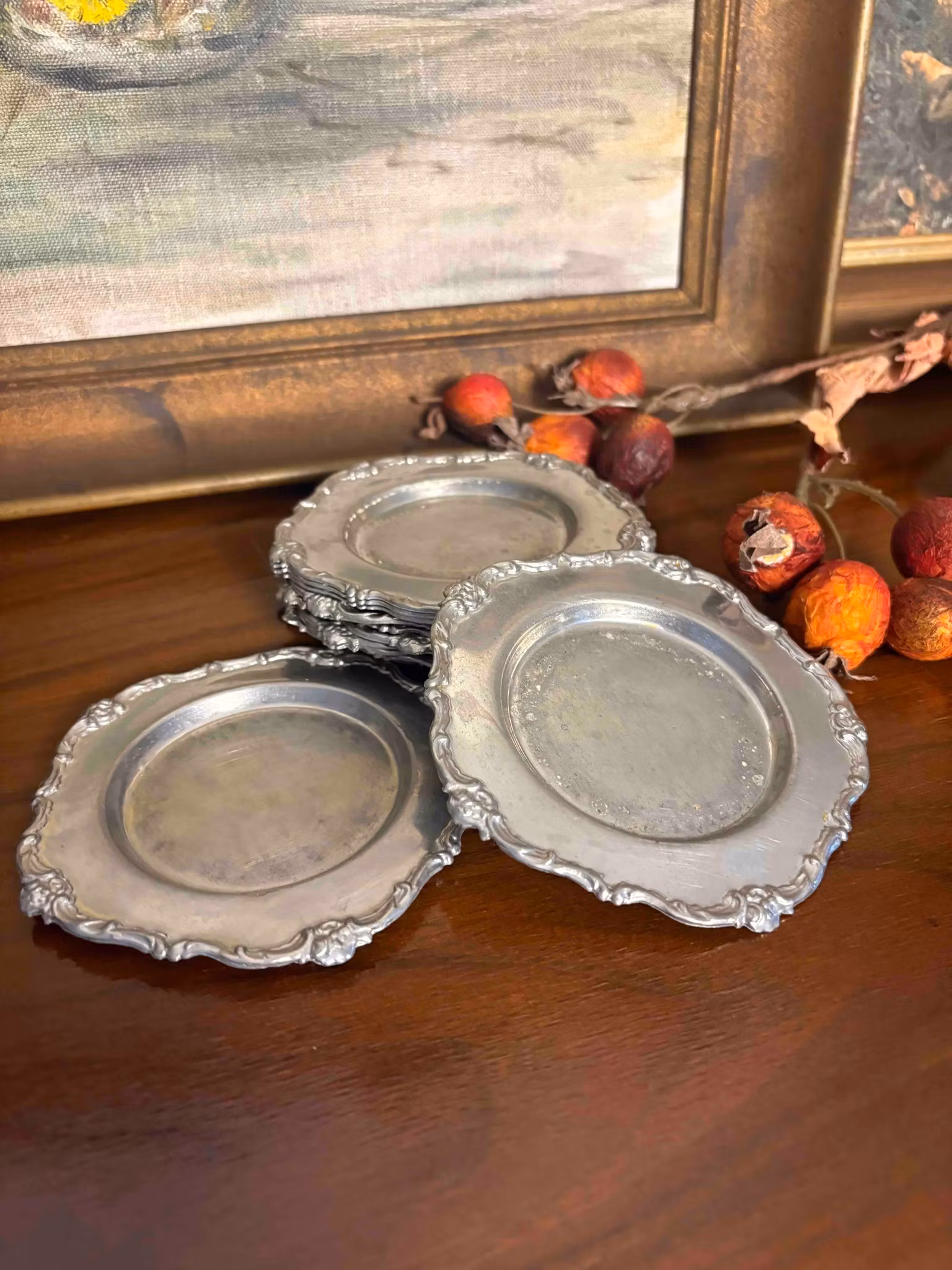Eleganta glasunderlägg i tenn, ca 11 cm i diameter, med dekorativ design och i fint bruksskick. Skyddar bordet och tillför en tidlös inredningsdetalj.