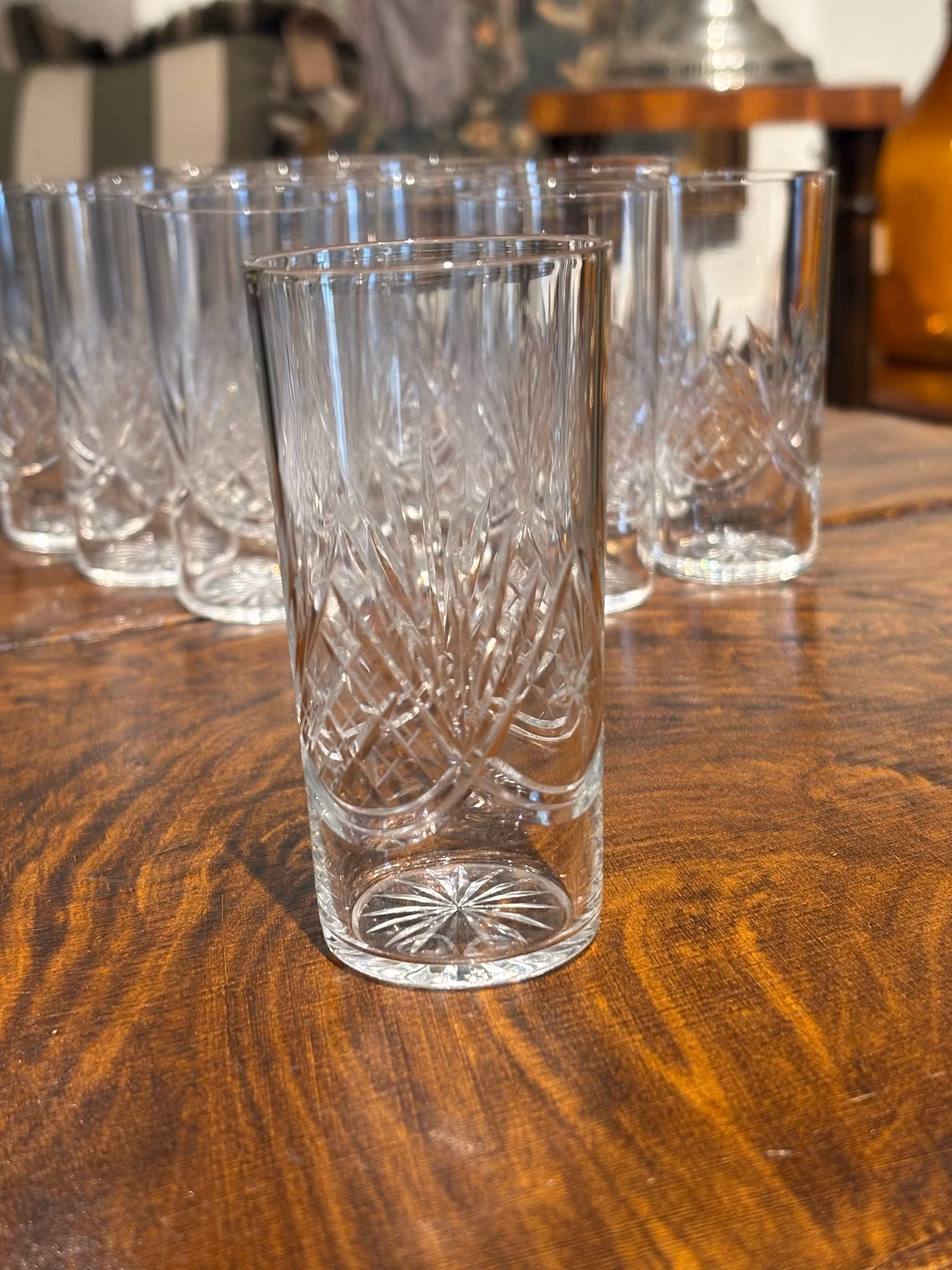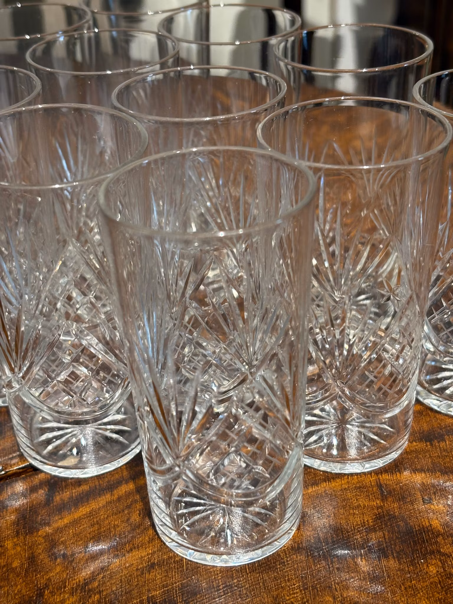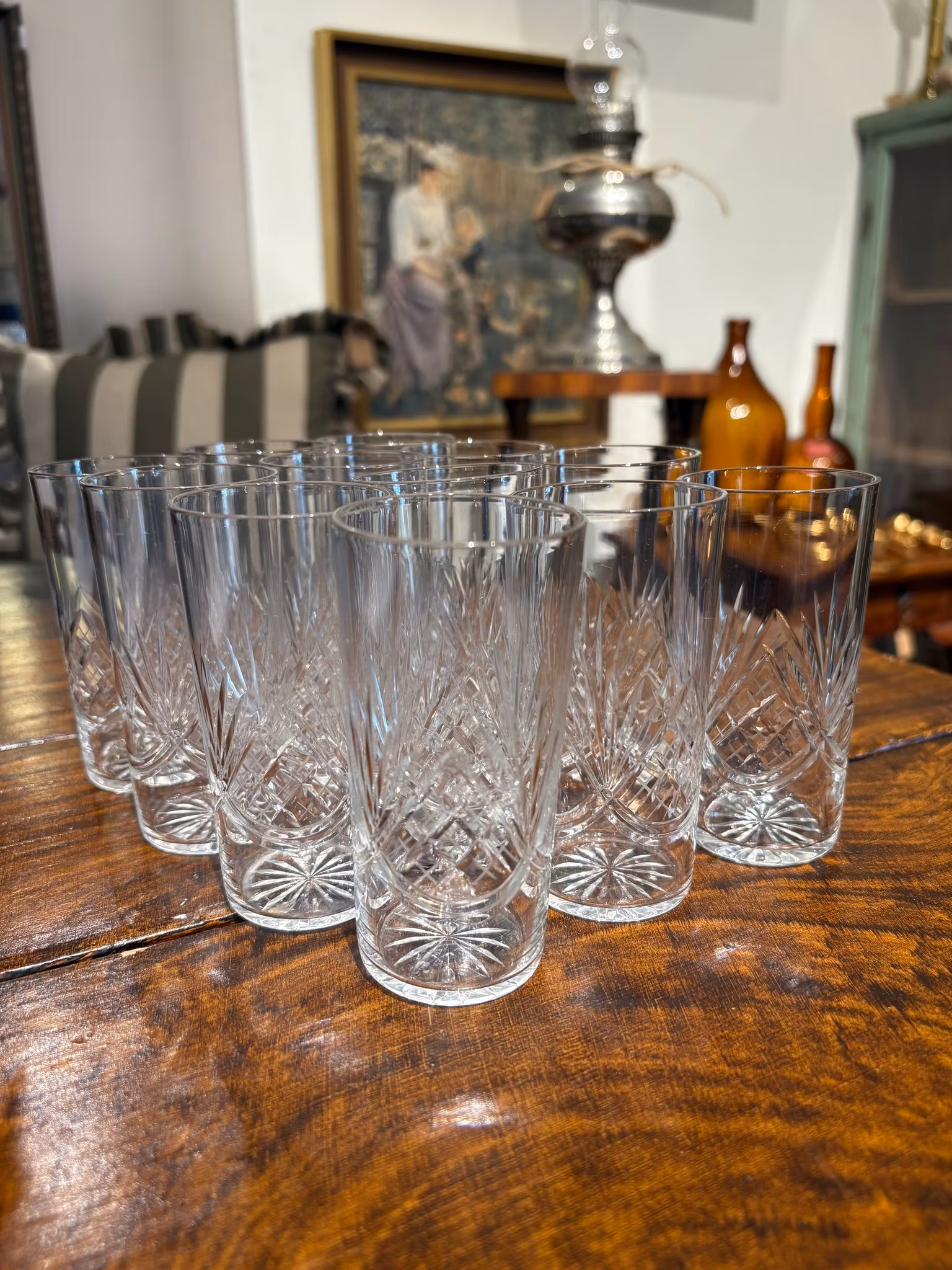Ett vackert set med tolv seltersglas med elegant slipad dekor. Glasen har en klassisk form och lagom storlek för vatten, saft eller andra drycker, och den slipade ytan ger en tidlös och sofistikerad känsla.