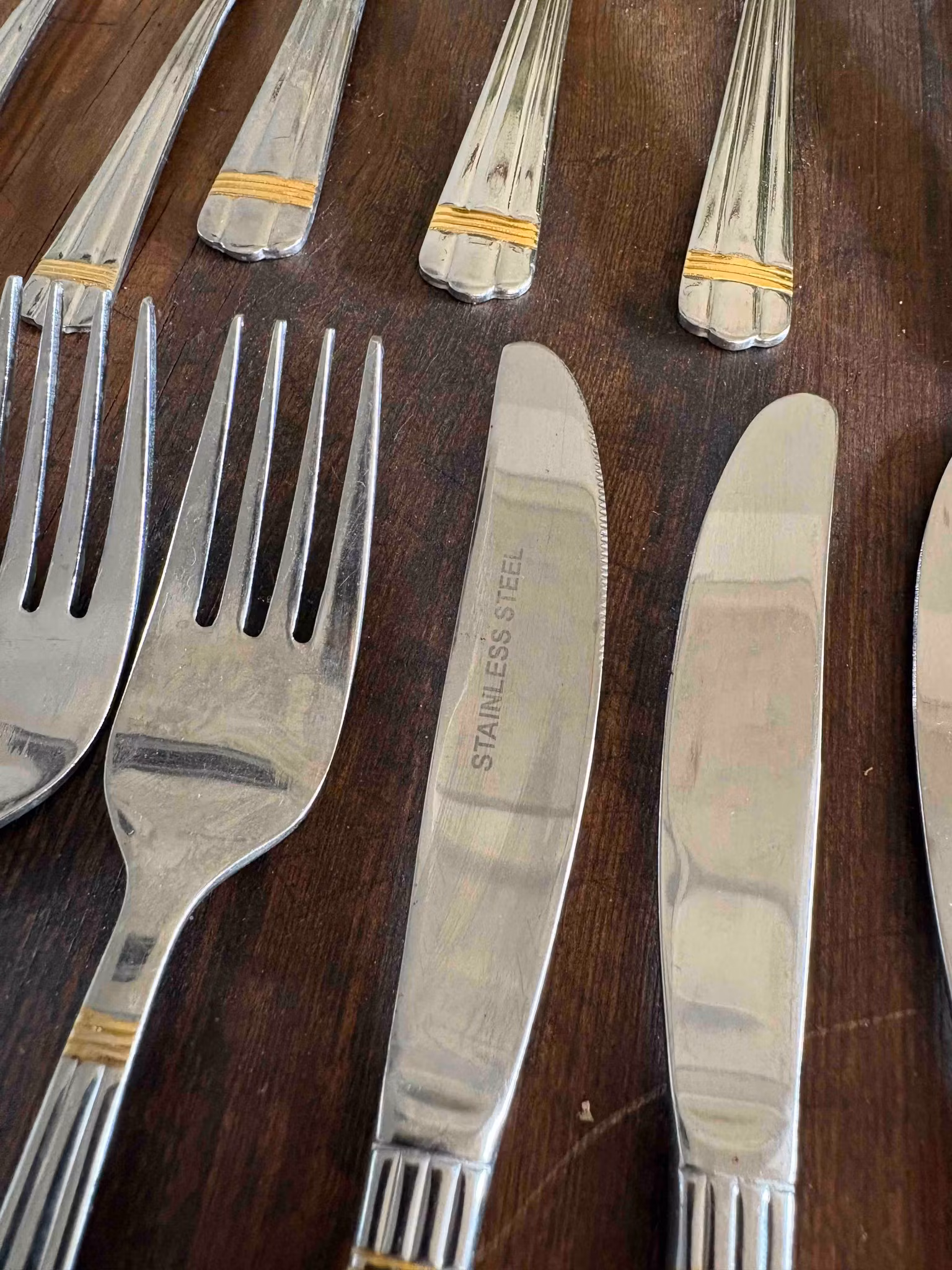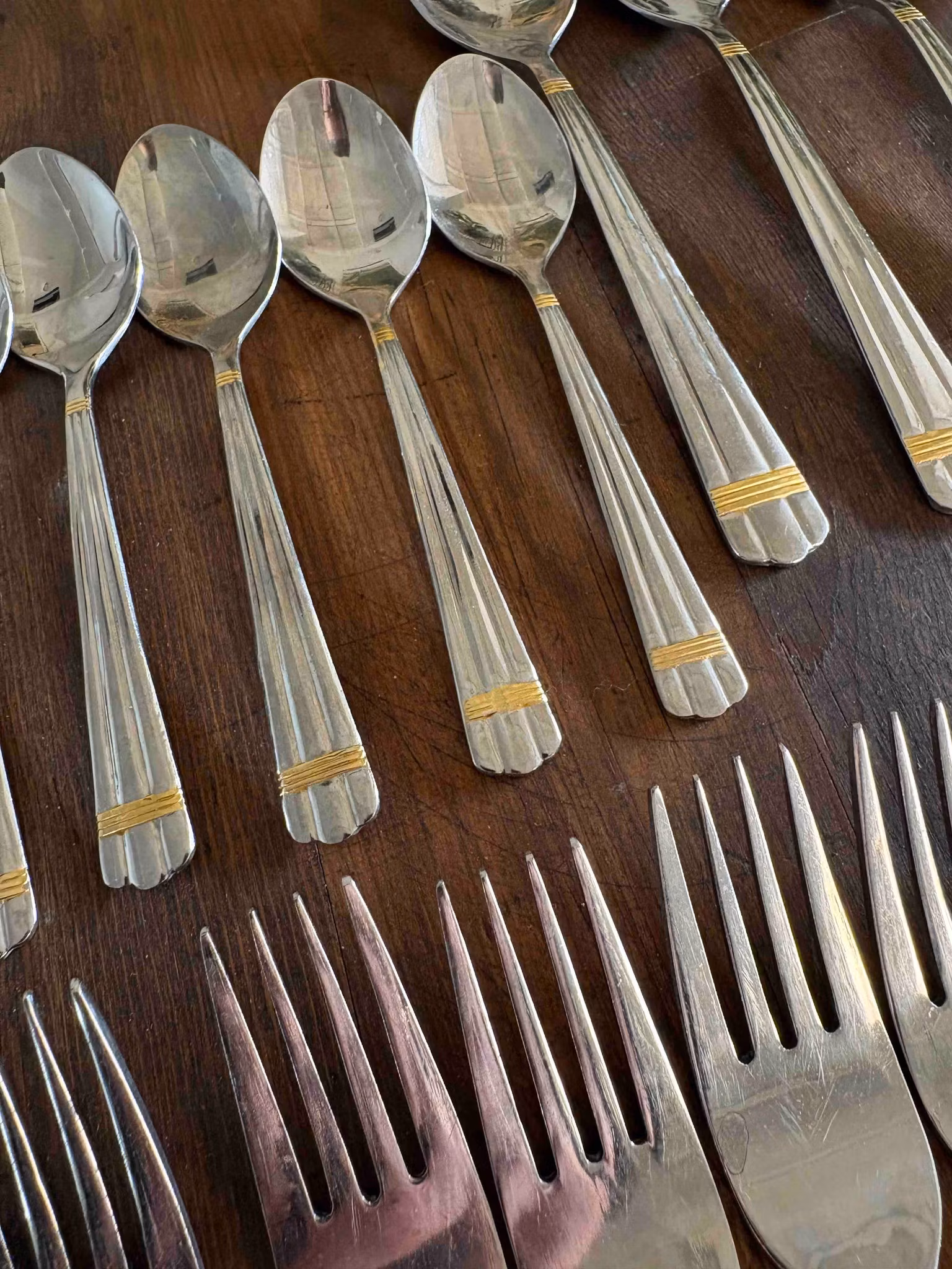 Bestickset i 23 delar med guldfärgad detalj. Rostfritt stål, 5 teskedar, 6 gafflar, 6 knivar och 6 skedar. Fint bruksskick.
