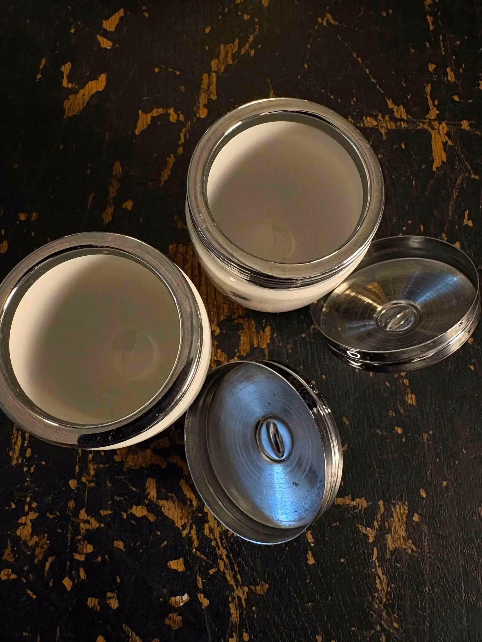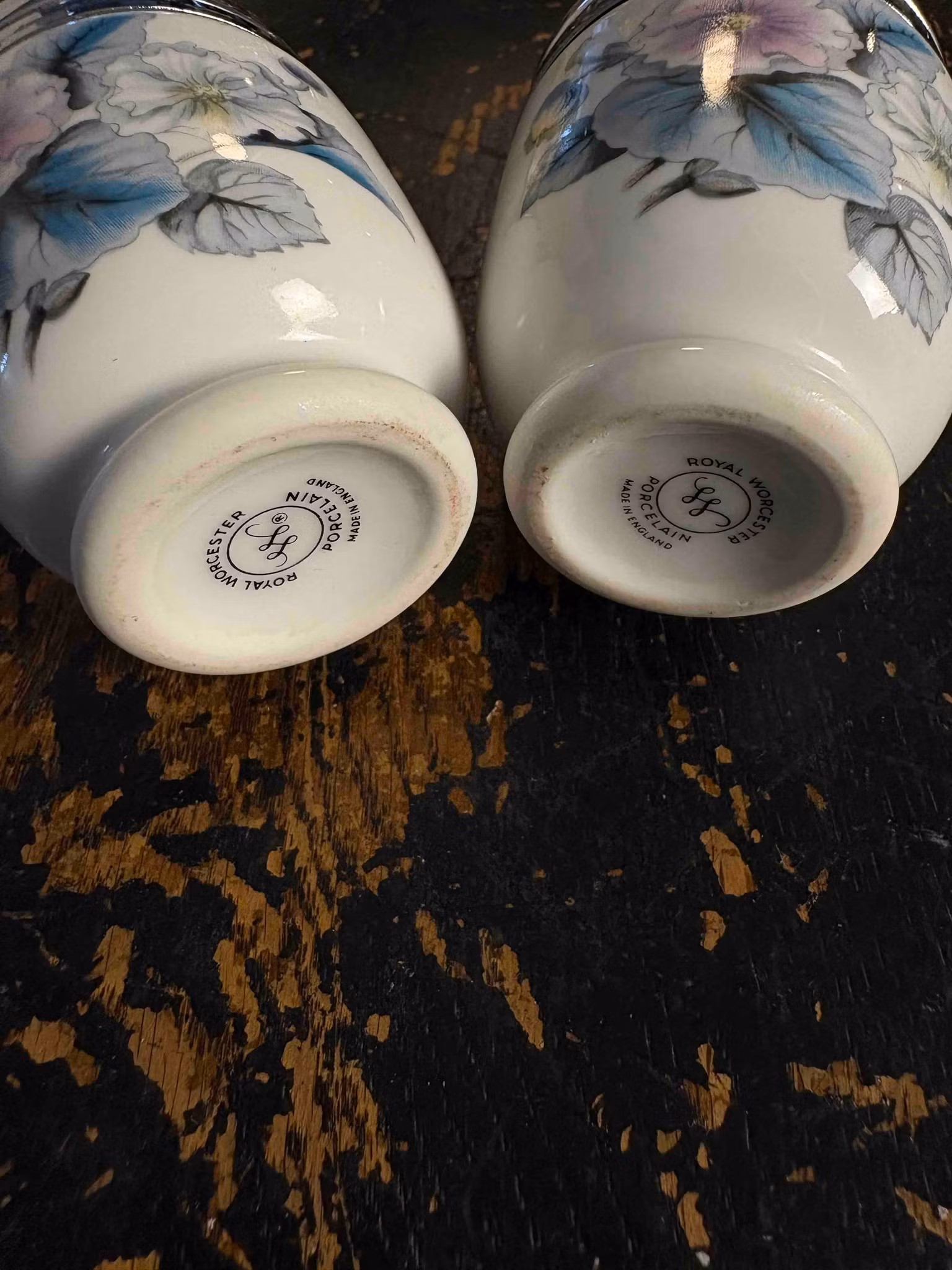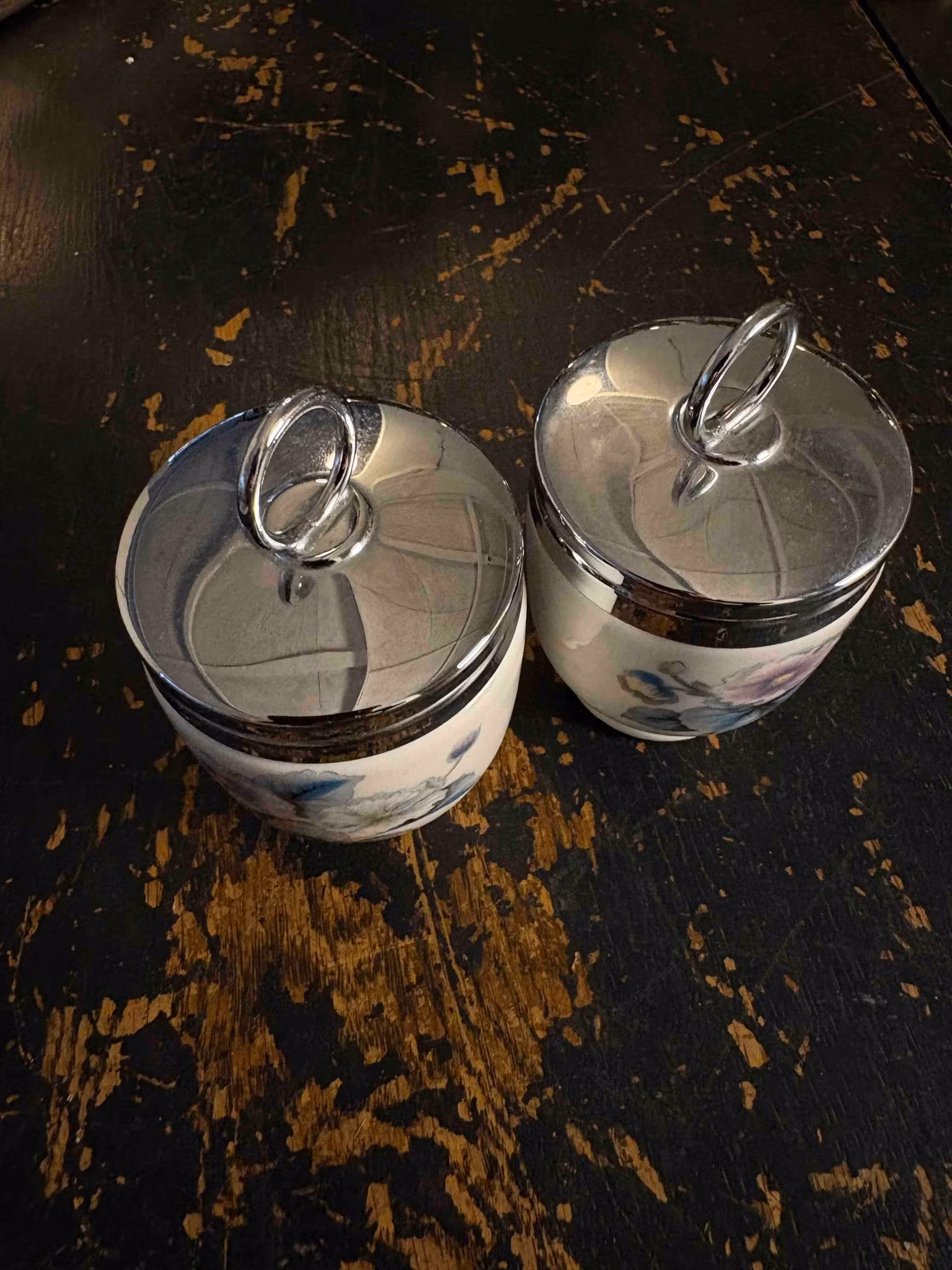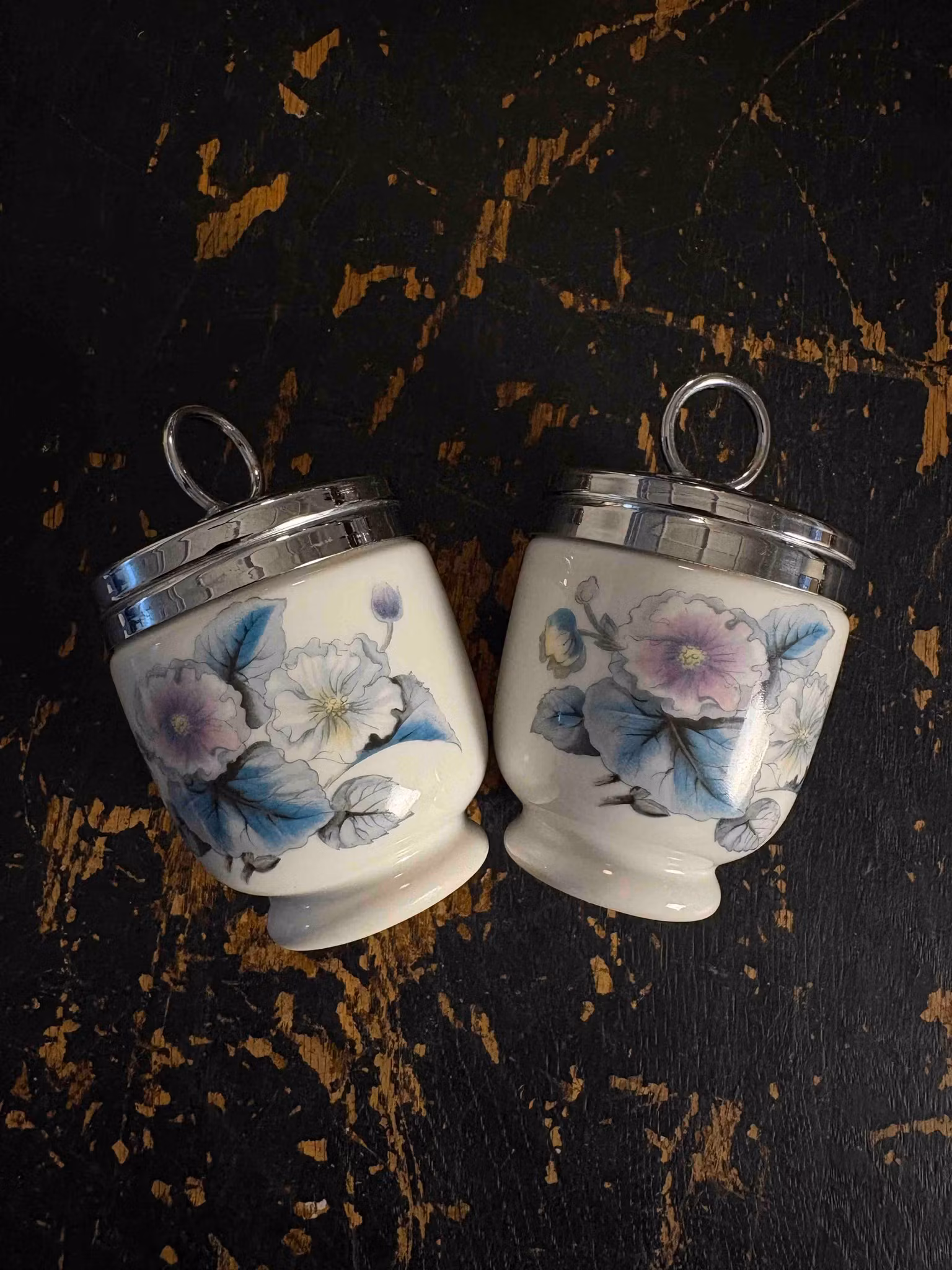 Ett par vackra äggkoppar från klassiska Royal Worcester, England. Dessa så kallade egg coddlers är ett traditionellt engelskt sätt att tillaga ägg, där ägget ångkokas långsamt i porslinsbehållaren. Resultatet blir mjukare och krämigare än ett vanligt kokt ägg – en riktig frukostklassiker.