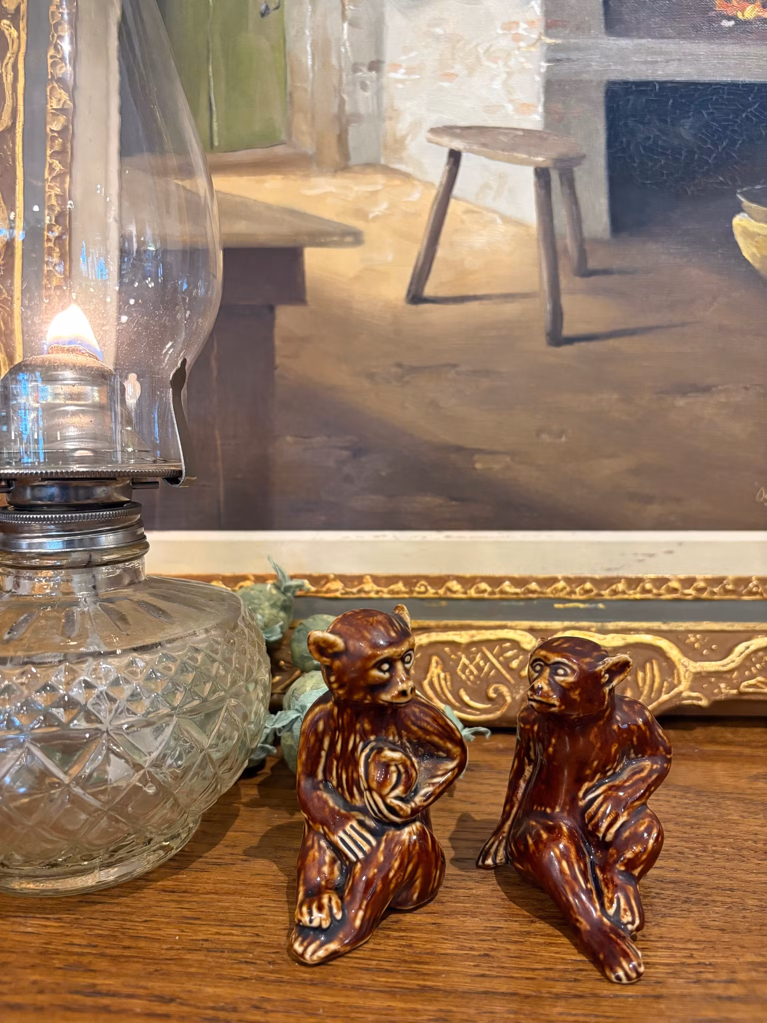 Två underbara apor i keramik med härlig karaktär och charm. De dekorativa figurerna är fint utformade med vackra detaljer och en glansfull yta som ger liv åt varje inredning. Perfekta som lekfull dekoration i hemmet eller som en personlig gåva.