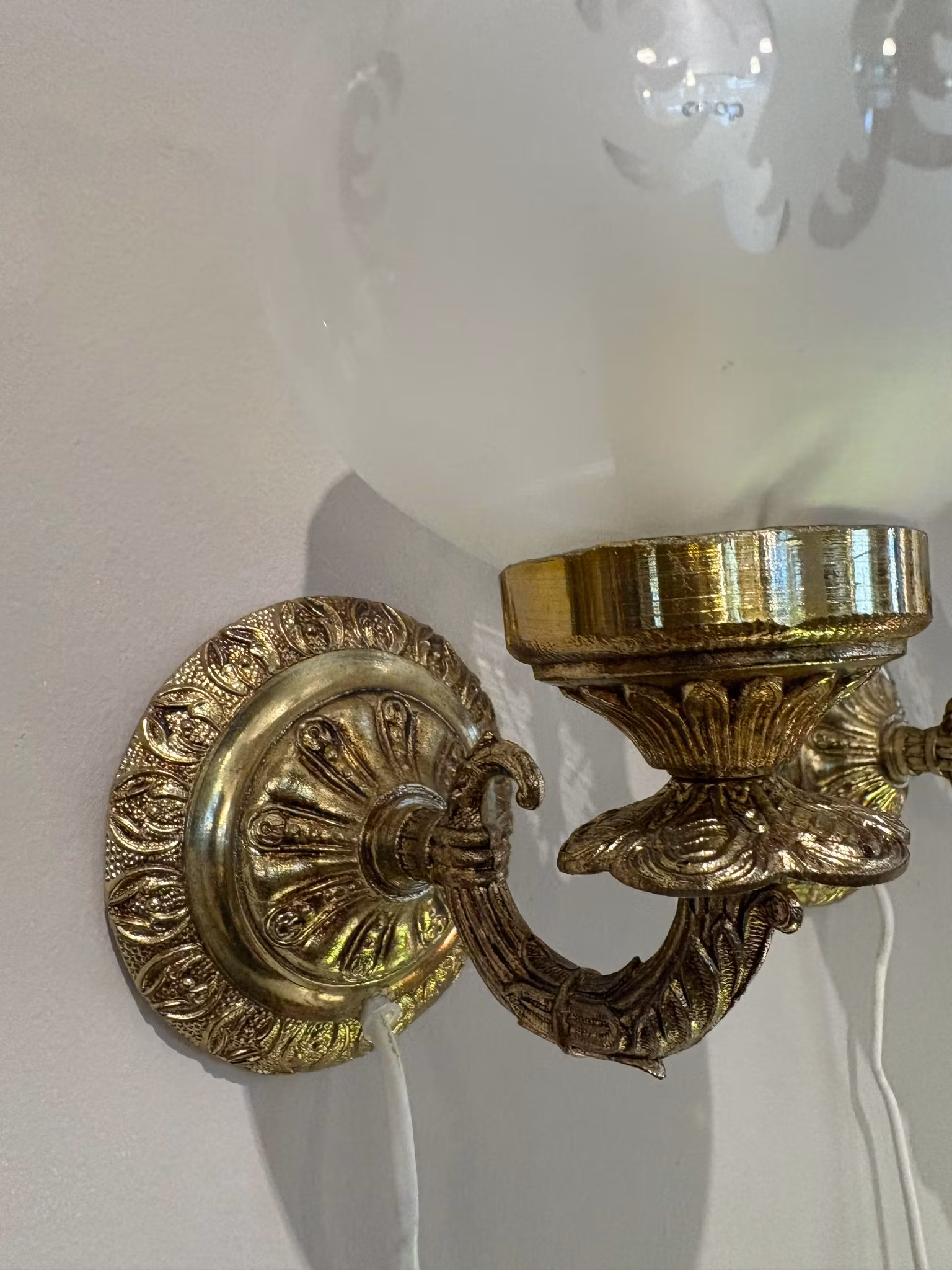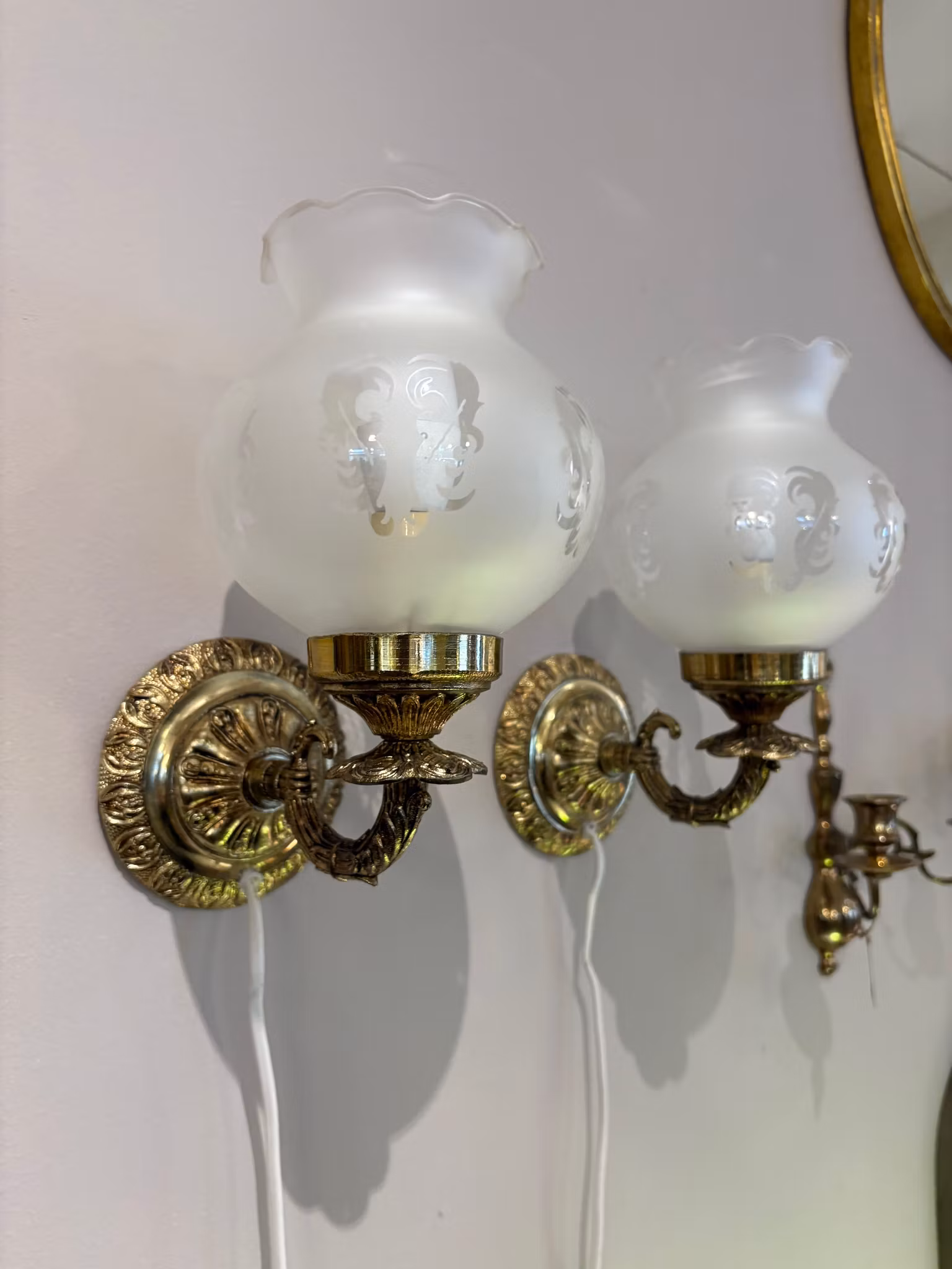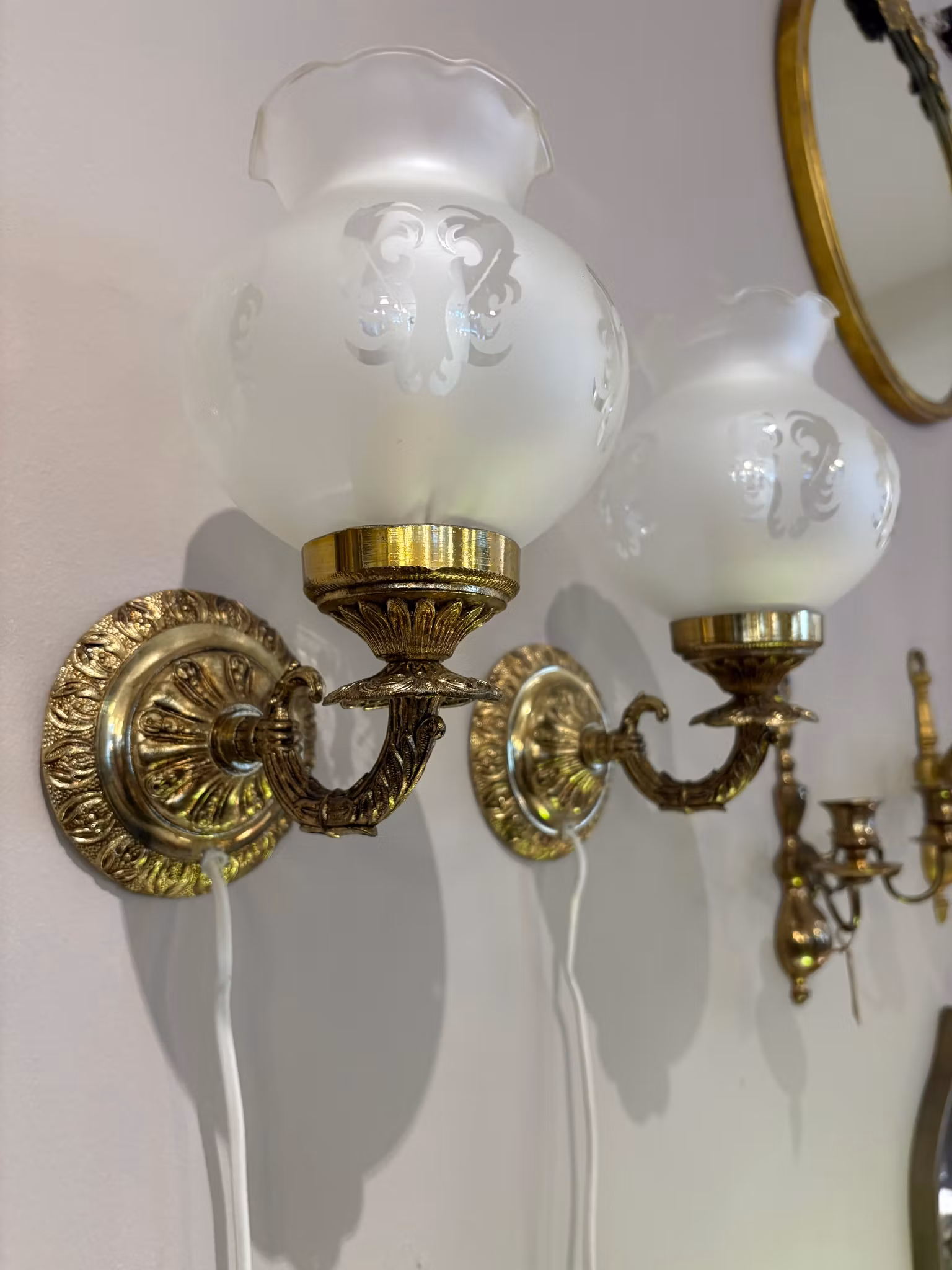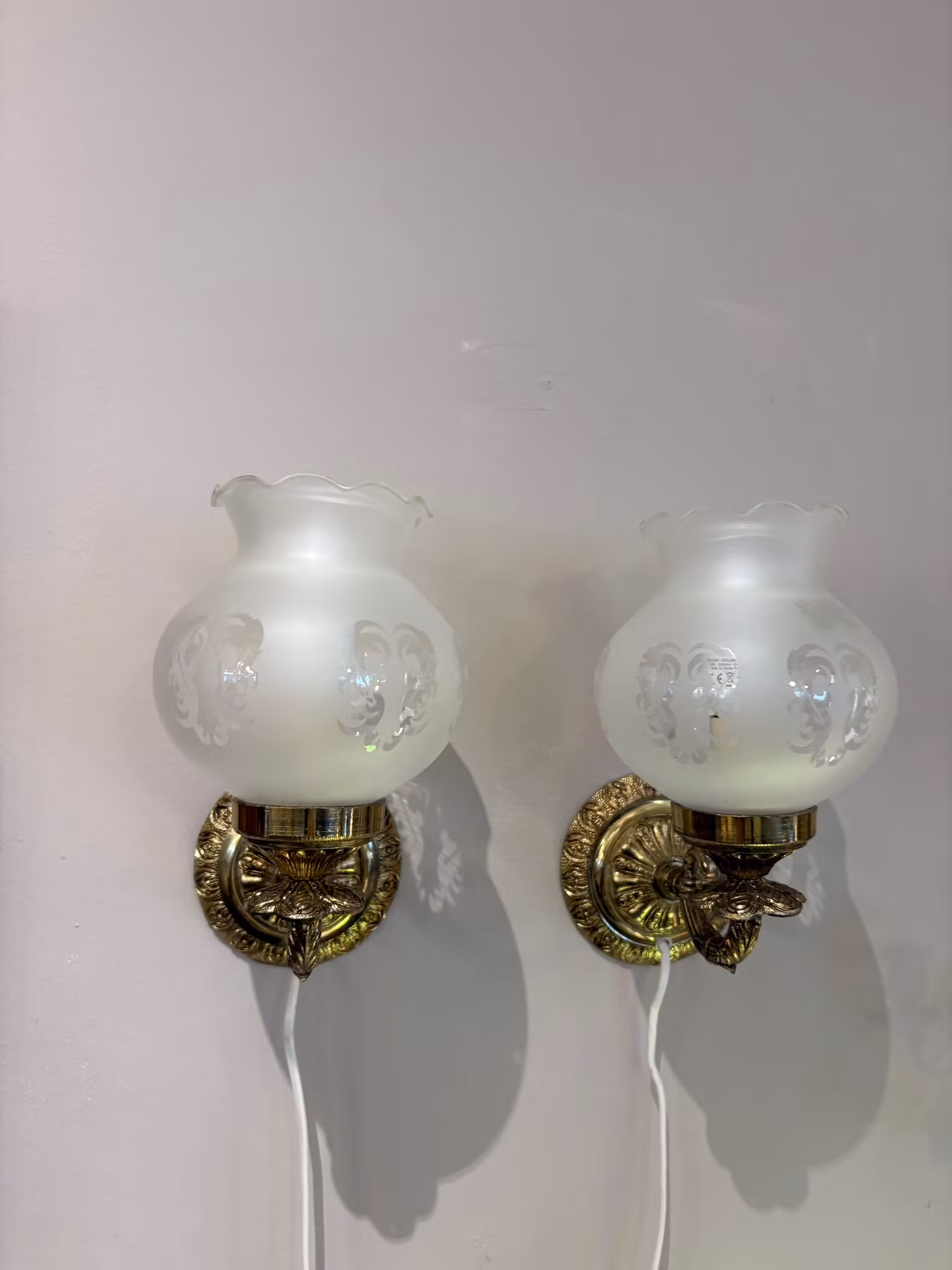 2 vackra vägglampor i metall och glas. Ca 24 cm höga och 19 cm djupa. Fint bruksskick. Vintagebelysning med tidlös charm för hem med karaktär.
