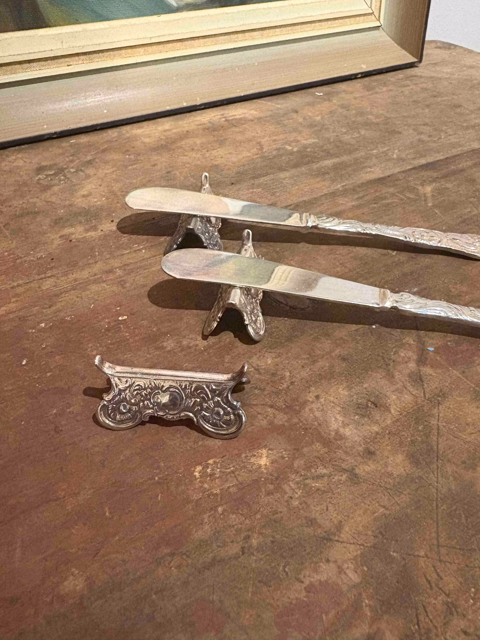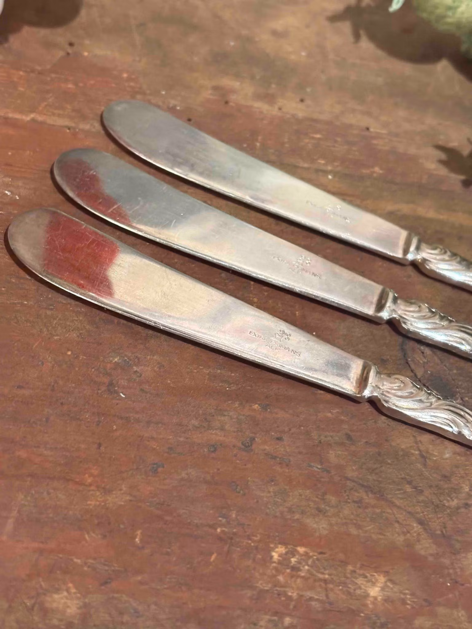 Tre smörknivar med tillhörande knivlägg från Nils Johan, modell Amsterdam. En vacker och välgjord serie i tidstypisk design. Knivarna ligger fint i handen och de små knivläggen gör dukningen komplett – både praktiskt och charmigt.