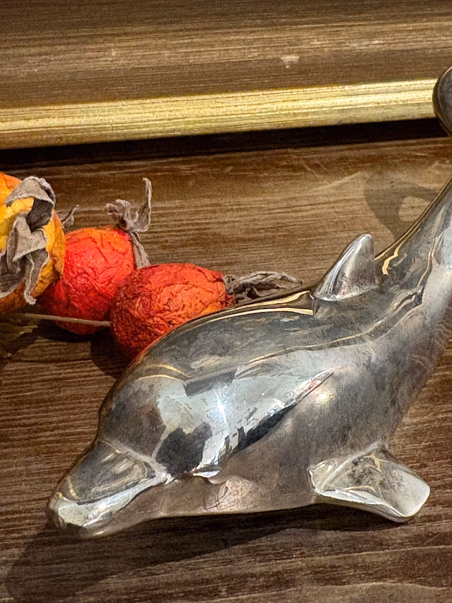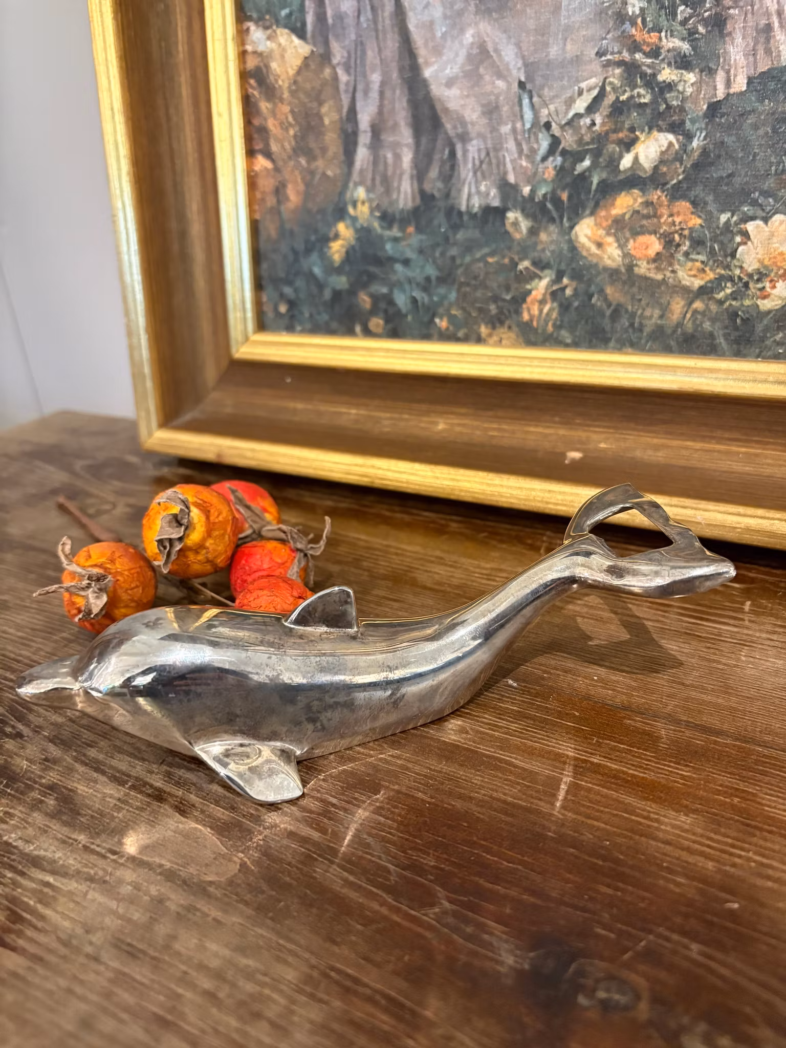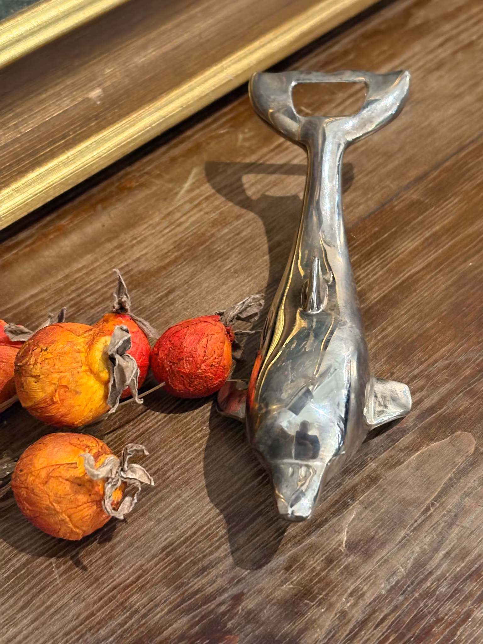 En dekorativ kapsylöppnare i form av en delfin – både praktisk och charmig detalj i köket eller på barvagnen.