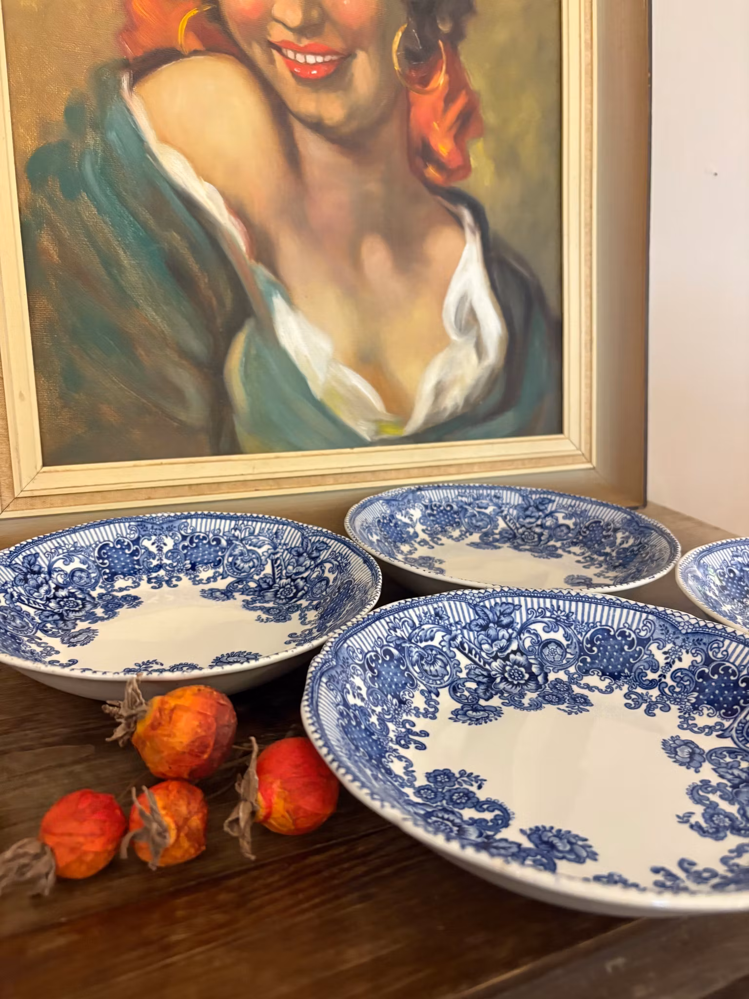 Fyra vackra djupa tallrikar/skålar i klassiskt blåvitt porslin från Enoch Wedgwood, England.