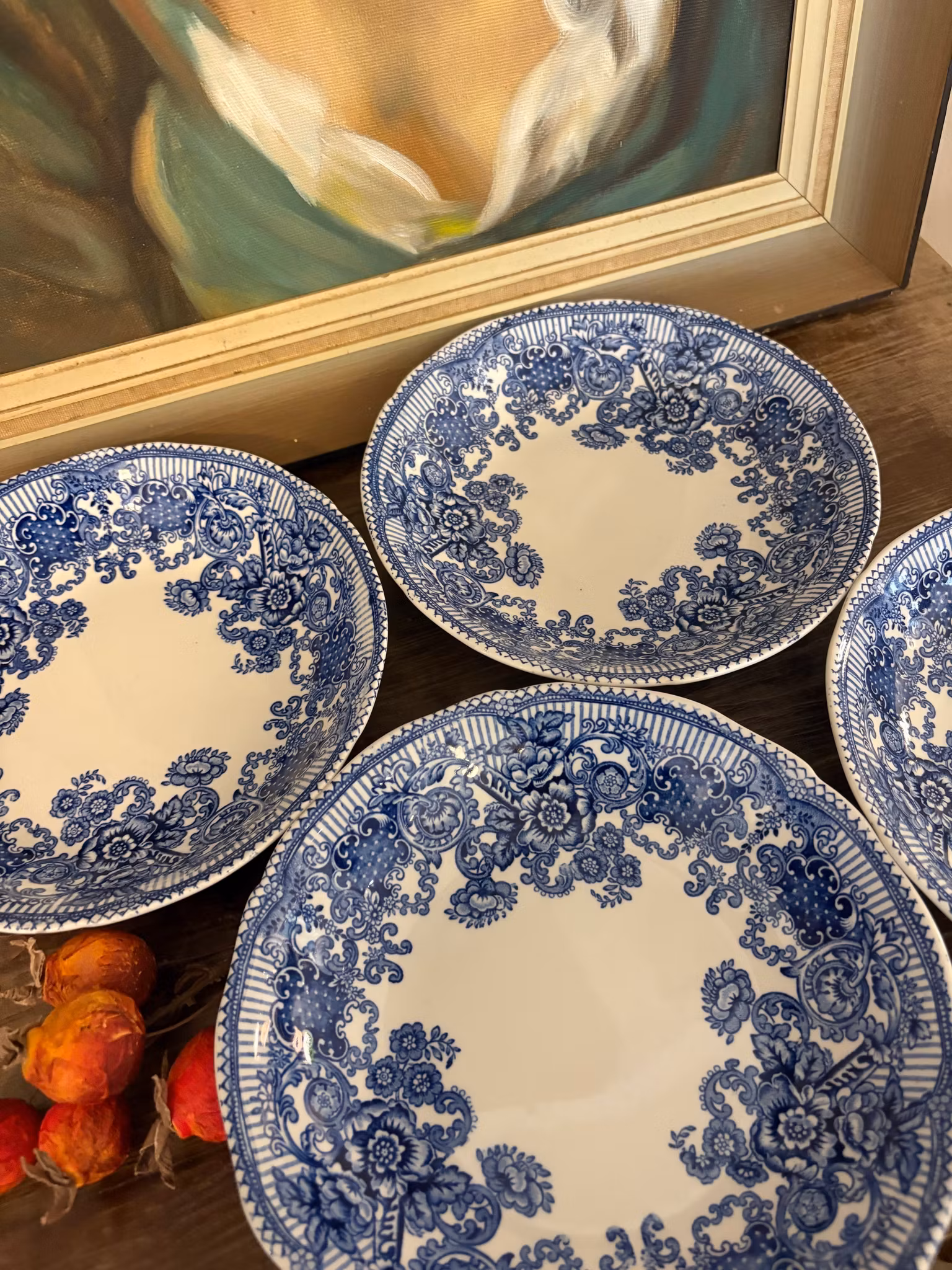 Fyra djupa tallrikar i blåvitt porslin från Enoch Wedgwood, England.