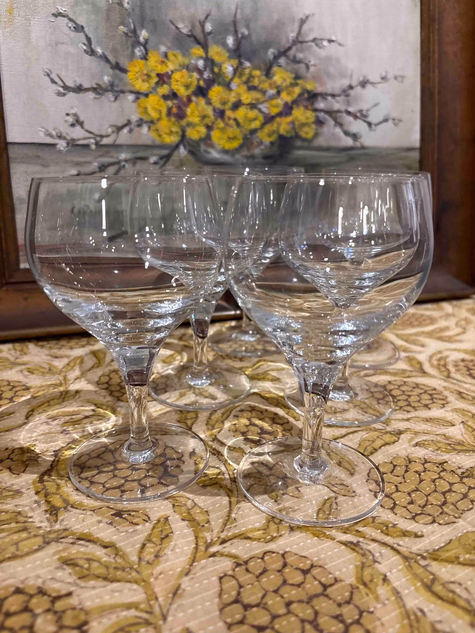 Sex vackra vinglas med mjuk form och en diskret elegans som gör dem lika passande till vardag som till fest. Glasen är i fint skick och ger dukningen ett ombonat och personligt uttryck.