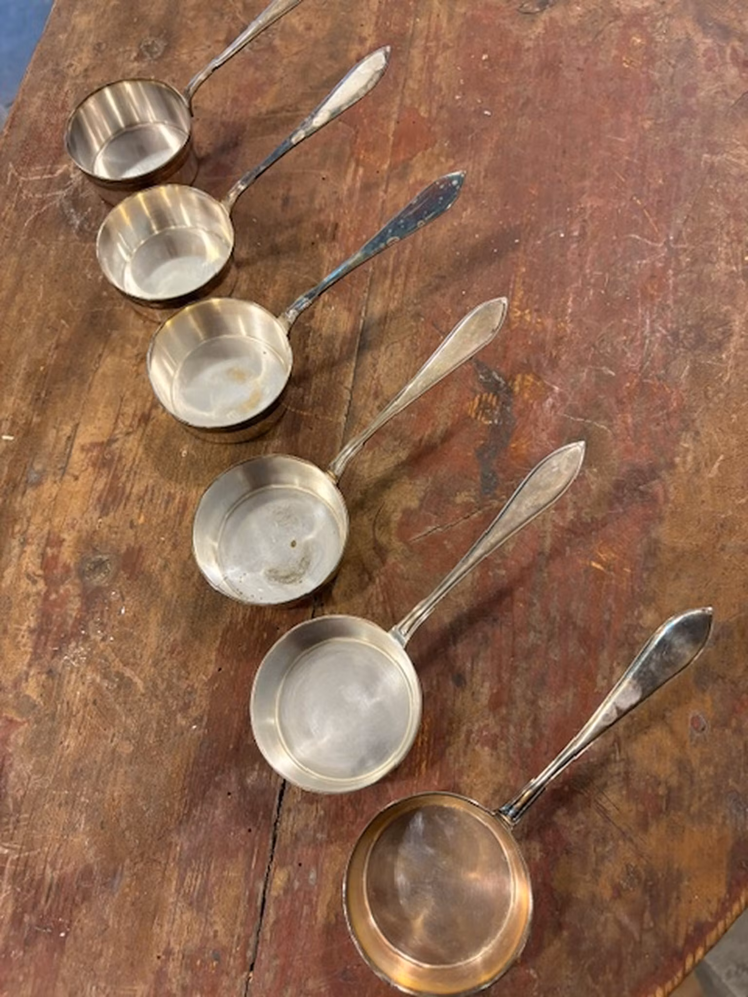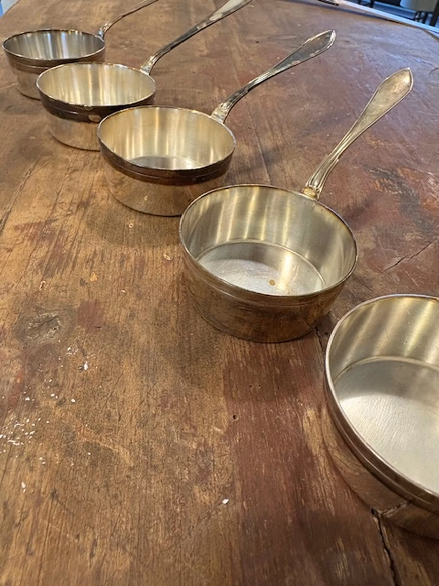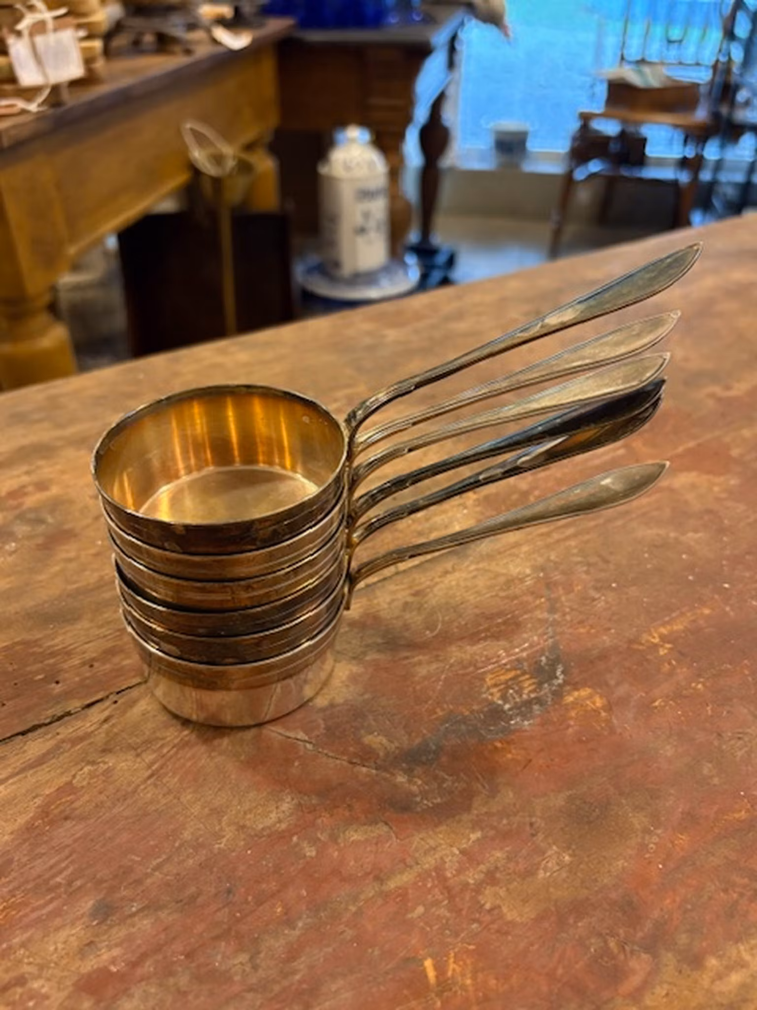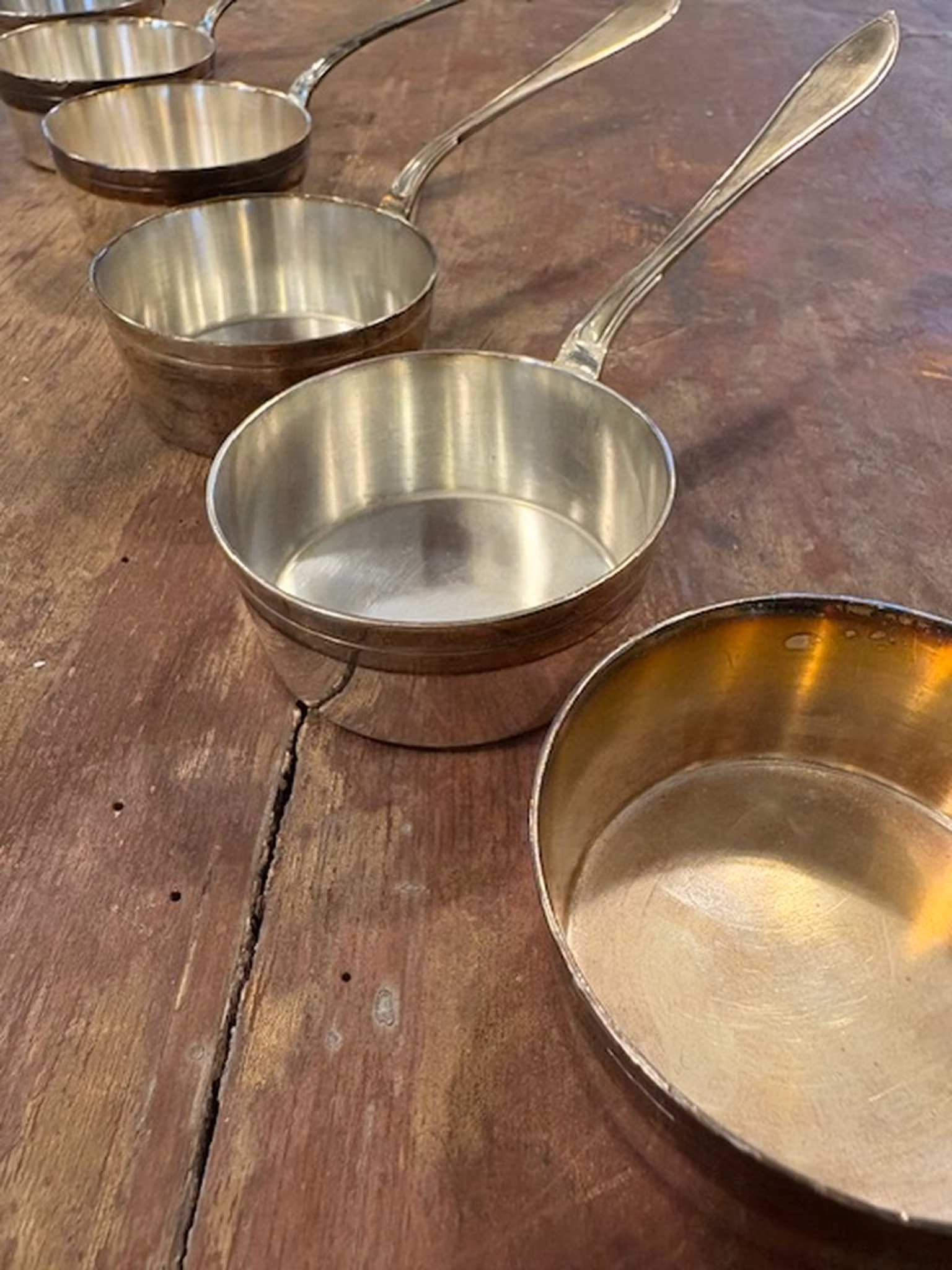 Längd ca 16 cm, höjd ca 3 cm. Bruksskick med vacker patina. Perfekta för att värma konjak – och går även att servera sås i.