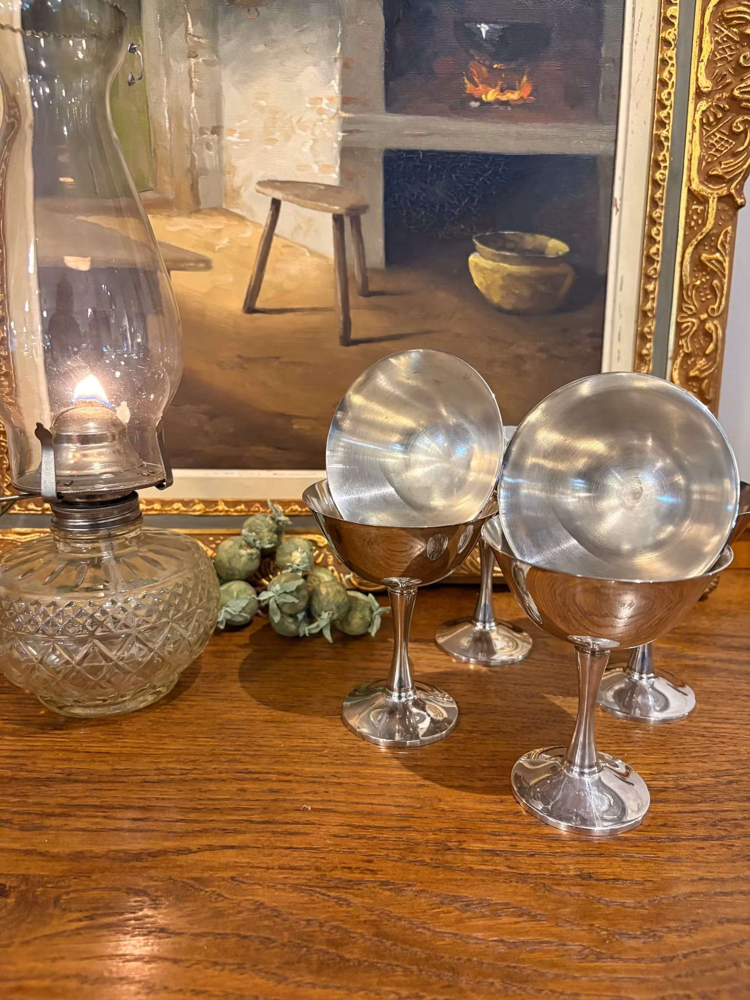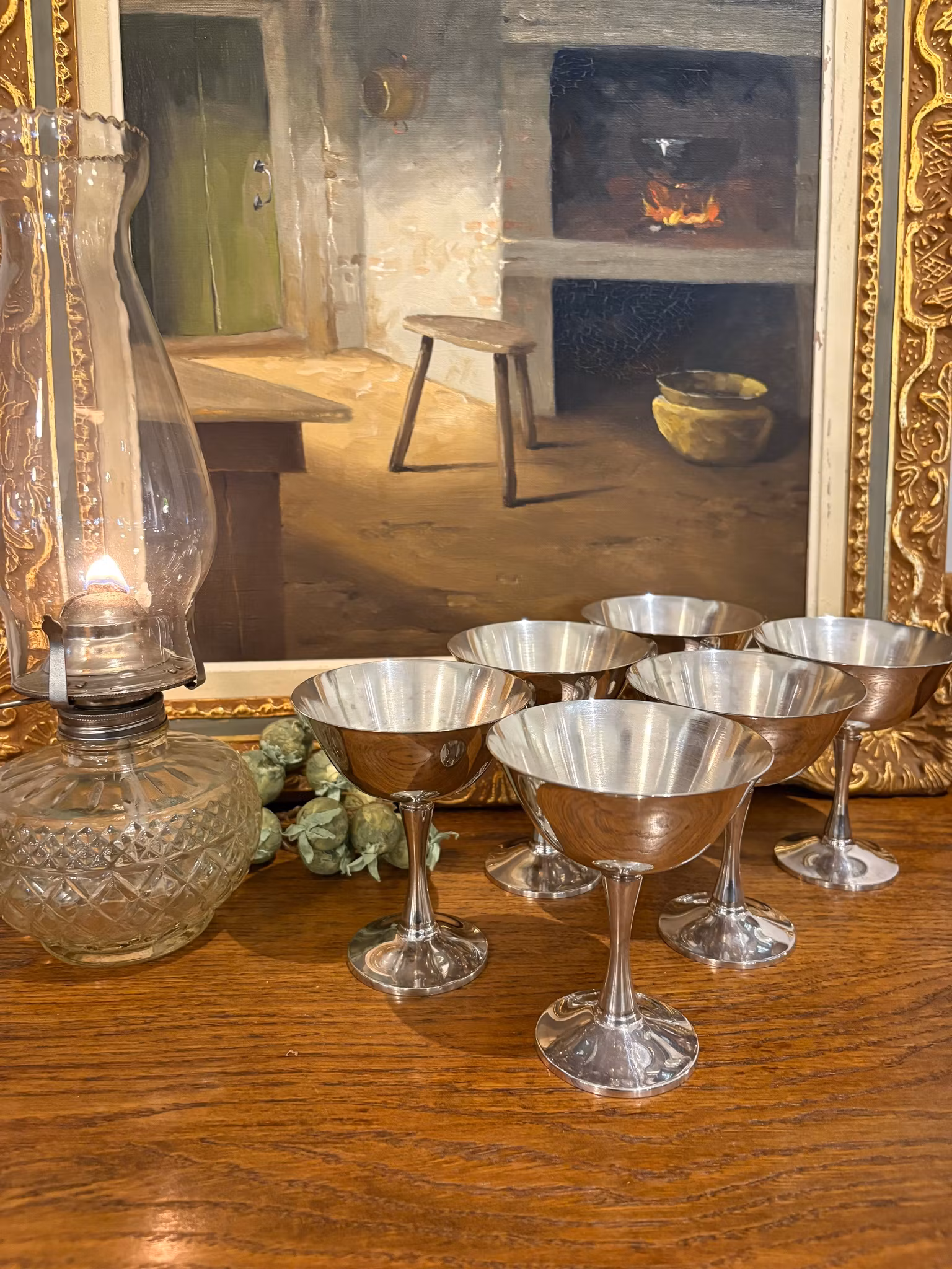 Sex otroliga cocktailglas i silverplätering från Portugal. De har en elegant form och en vacker glans som för tankarna till klassiska serveringar och festliga tillfällen. Perfekta att servera en kula glass, en liten dessert eller en lyxig bakelse i. Ett unikt tillskott till dukningen som kombinerar elegans och lekfull nostalgi.