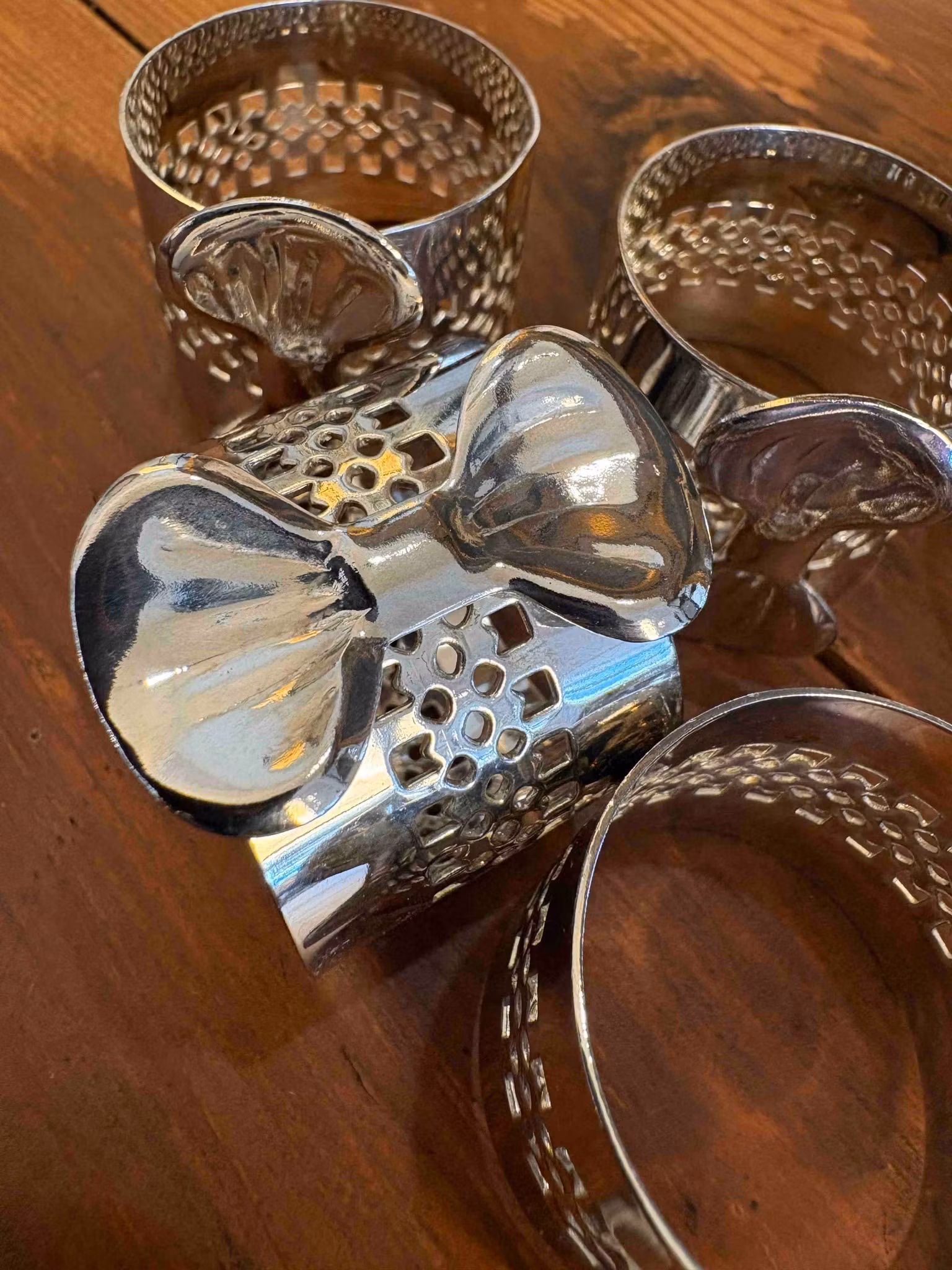 En uppsättning servettringar där den lilla rosetten ger liv och karaktär åt varje kuvert. Den silverpläterade ytan fångar ljuset mjukt, medan rosettens form tillför något mer personligt – nästan som en liten gest av omtanke runt varje servett.