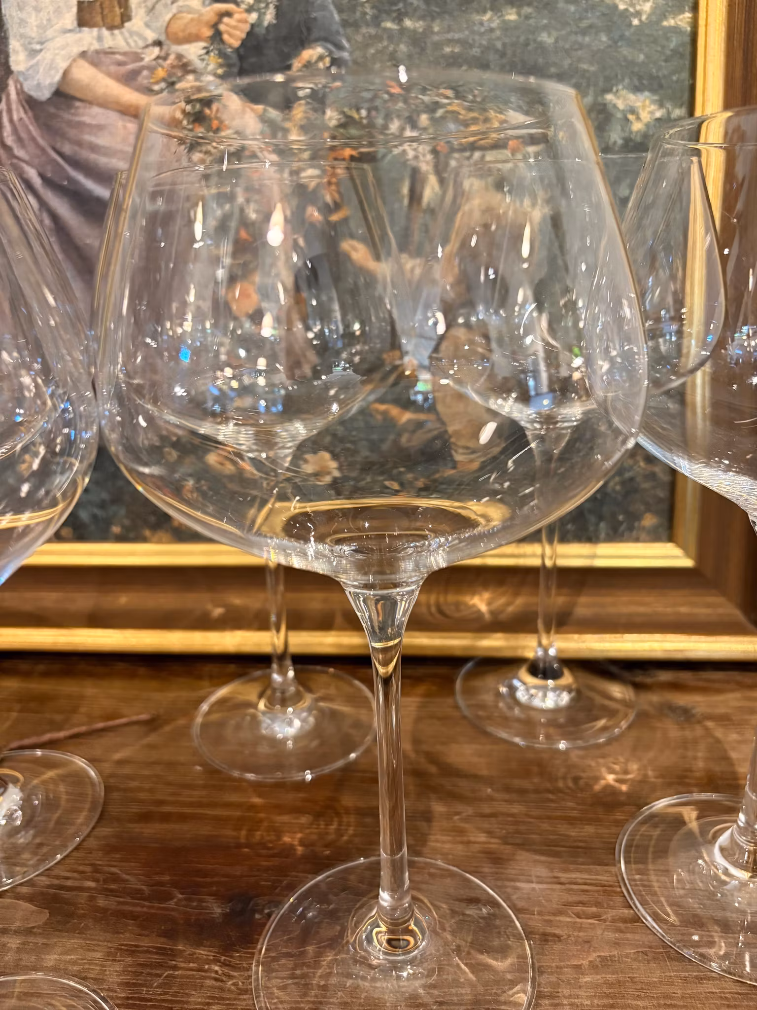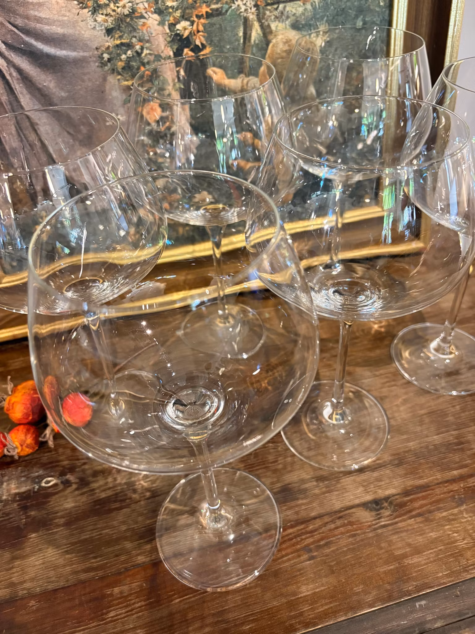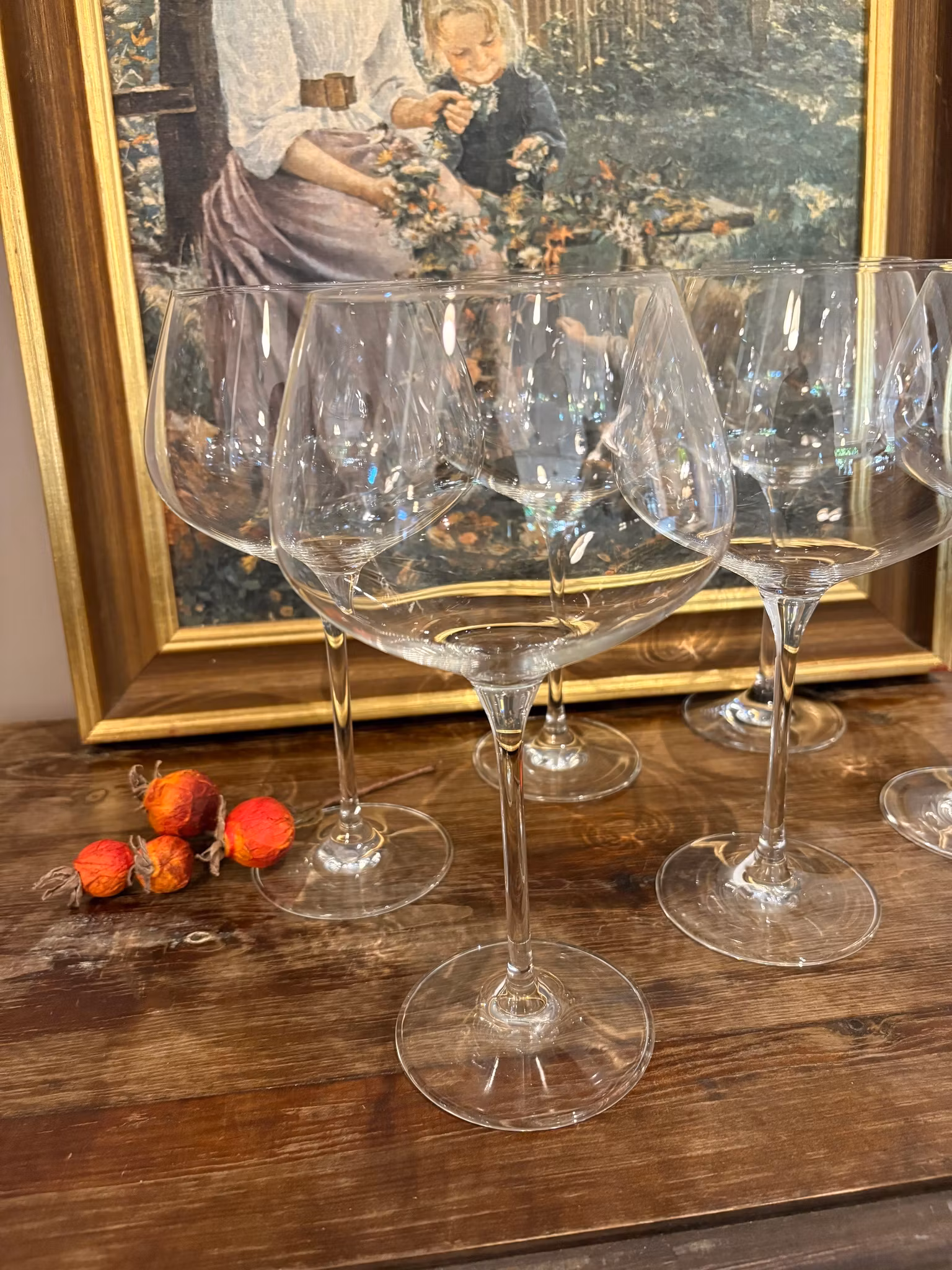 Sex vackra stora vinglas med elegant form. Fint skick – perfekta till middagar, fest och dukning med stil.