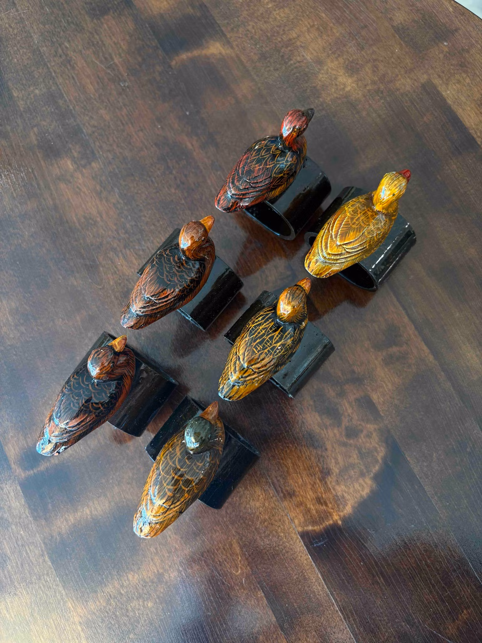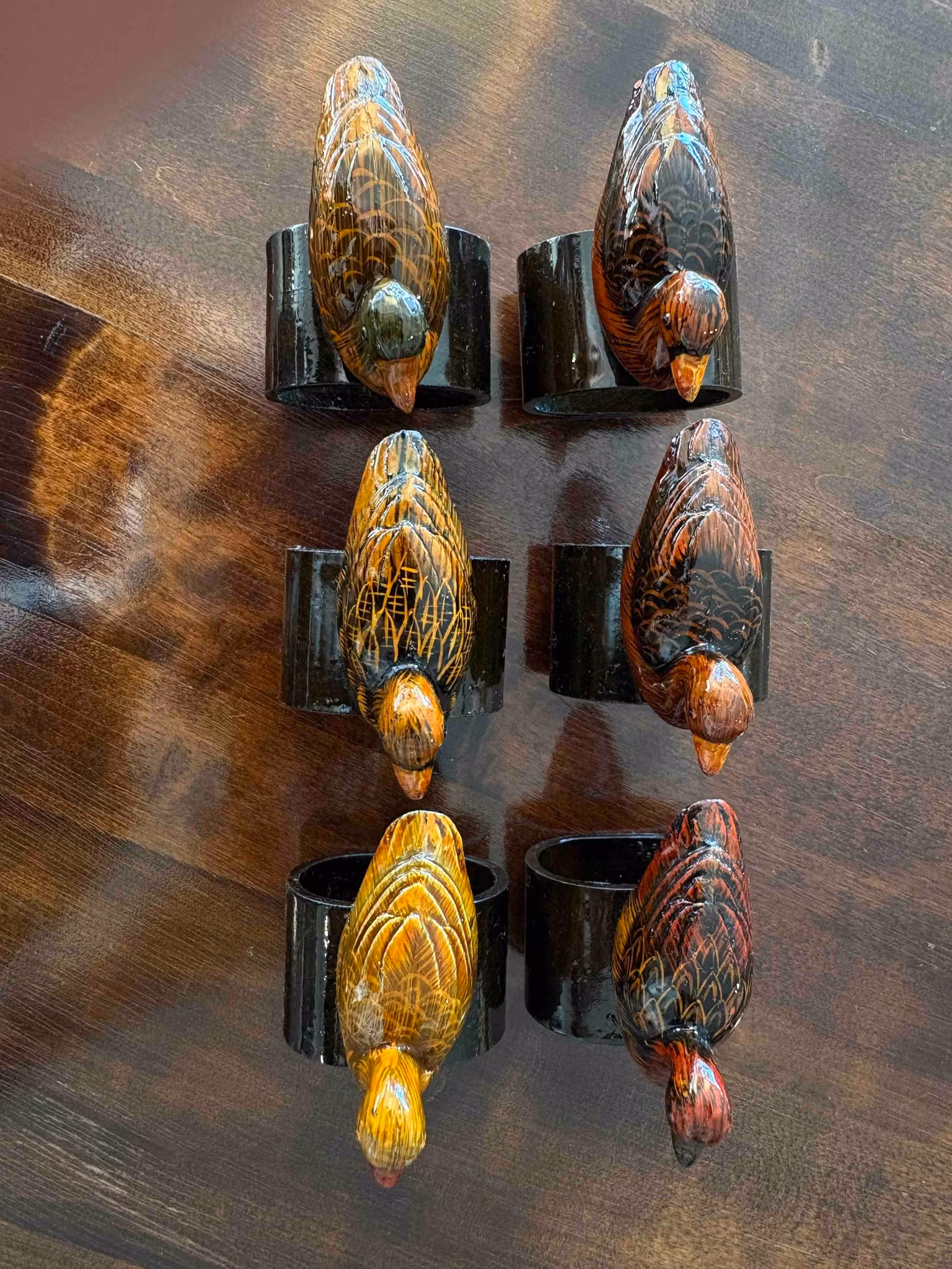 6 st servettringar i trä formade som änder. Charmig detalj till dukningen. Fint bruksskick. Höjd ca 7 cm.