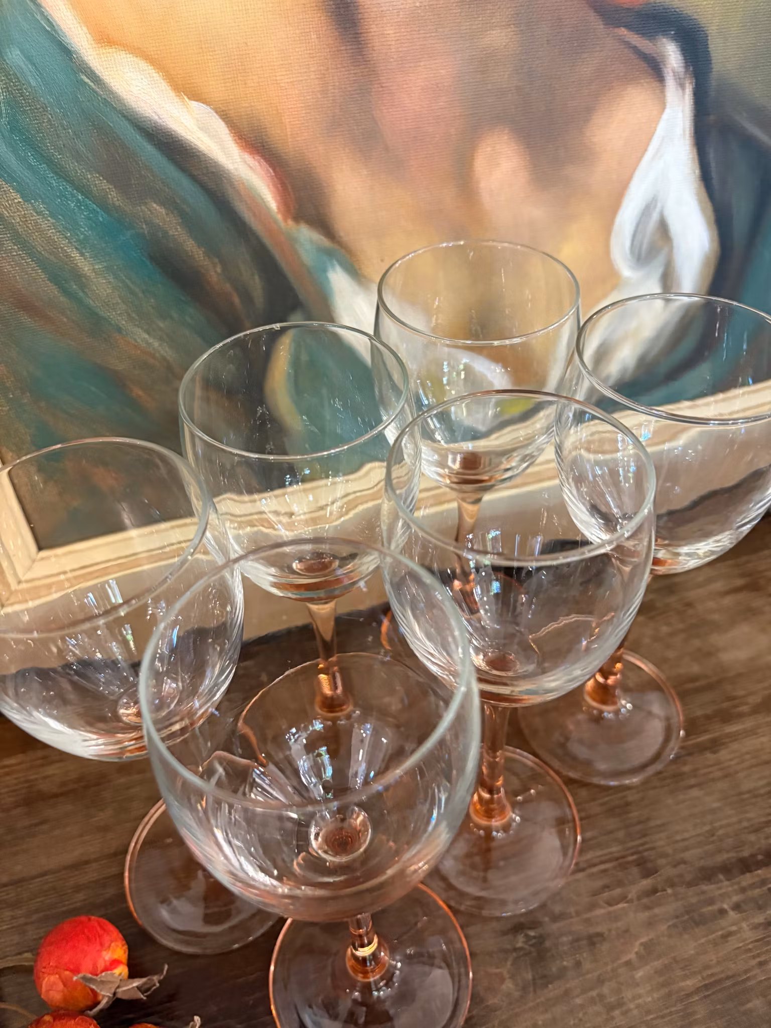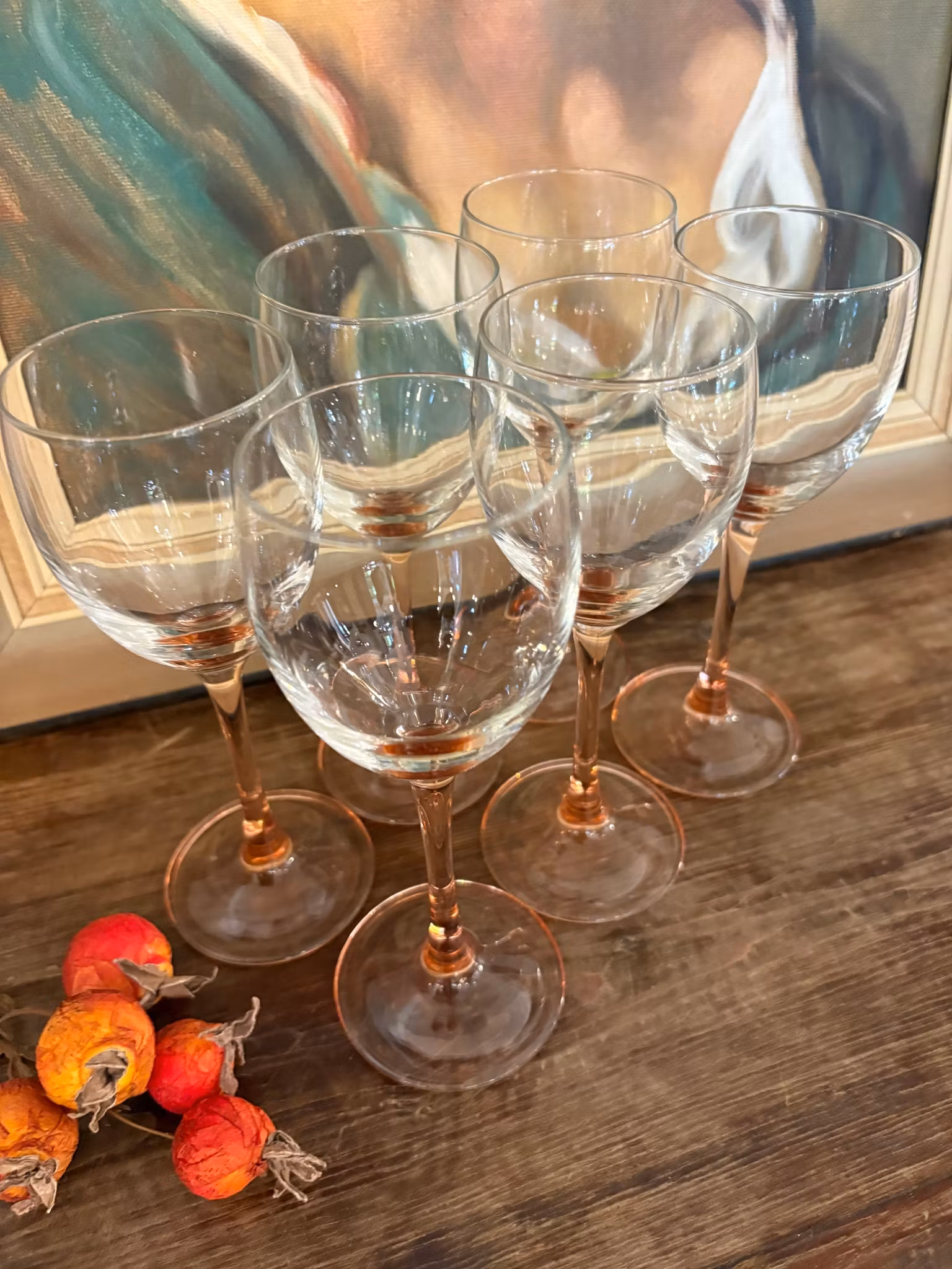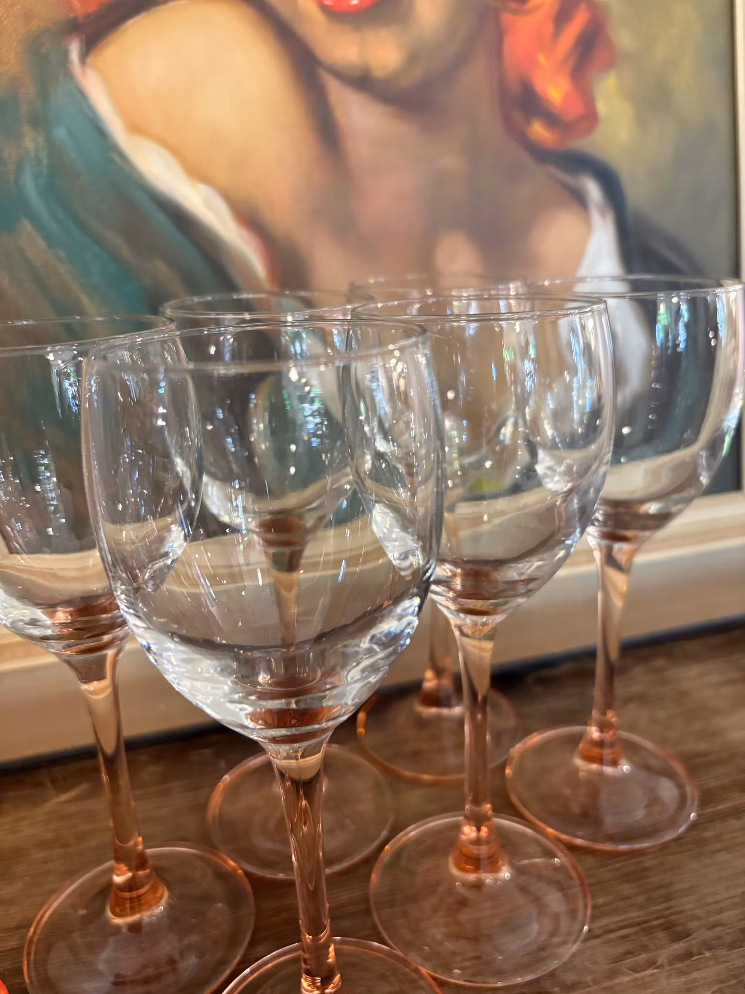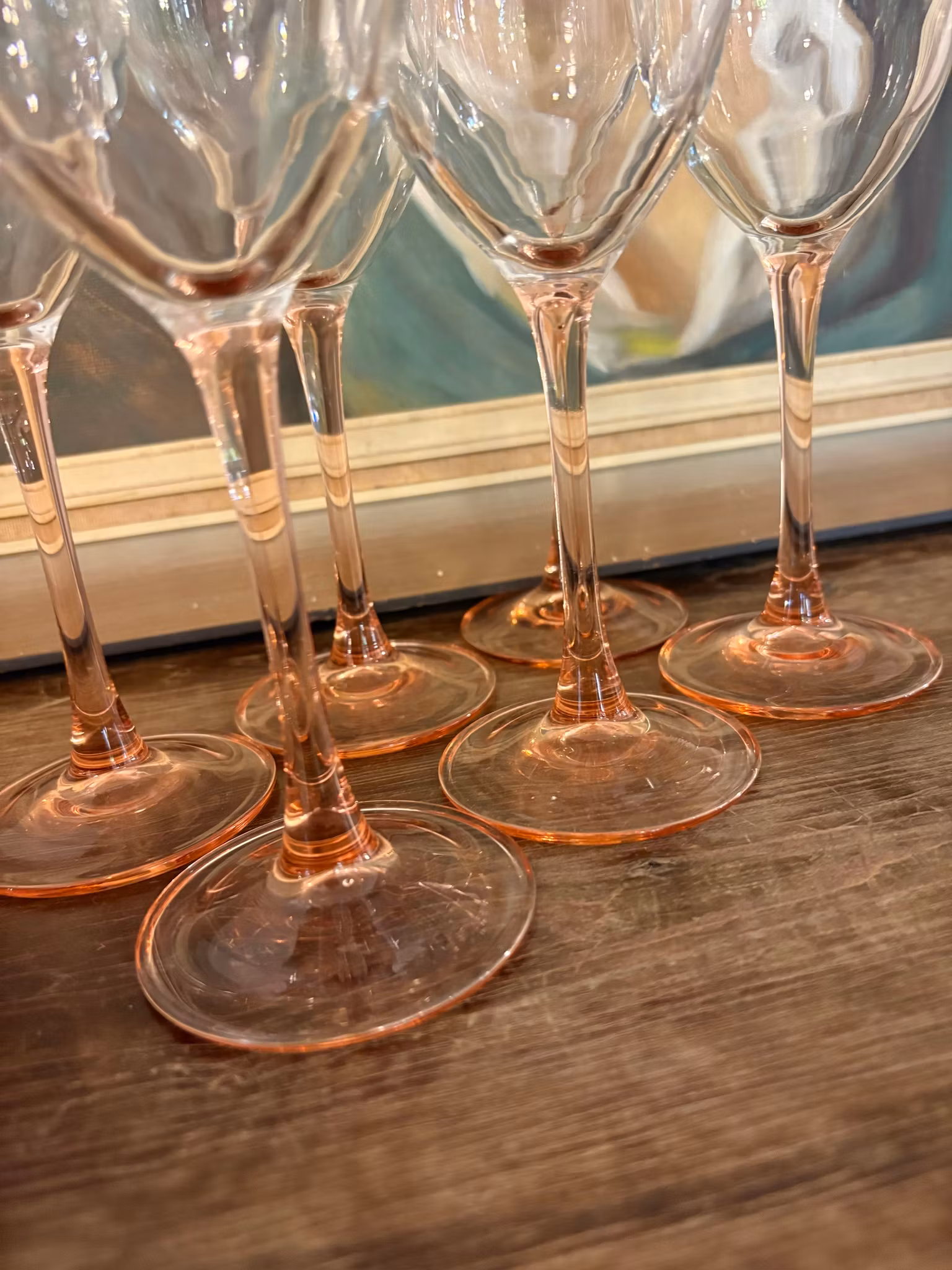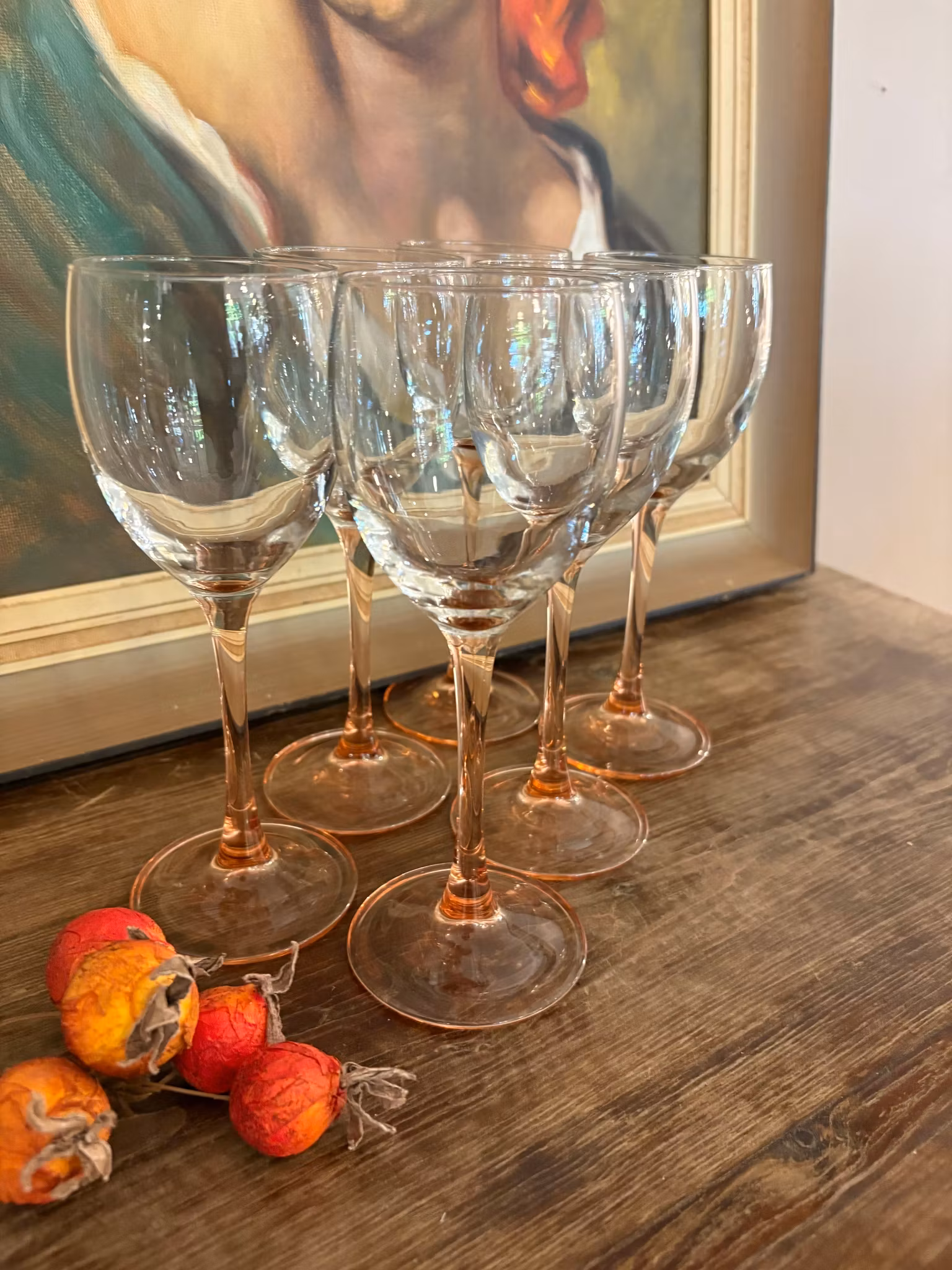 Sex vitvinsglas med mjukt rosa fot. Mycket fint skick och elegant design – perfekta till fest och dukning med personlig stil.