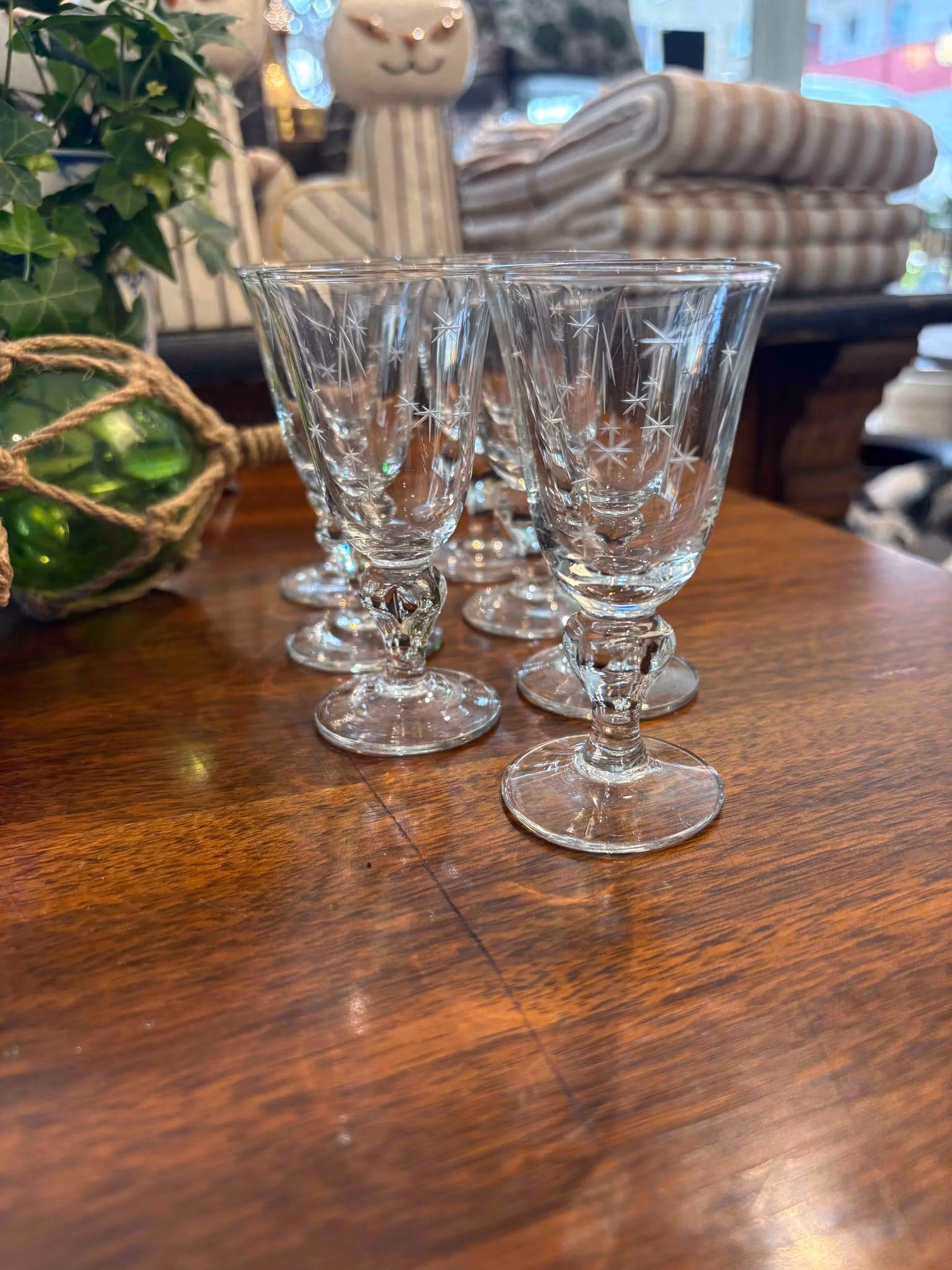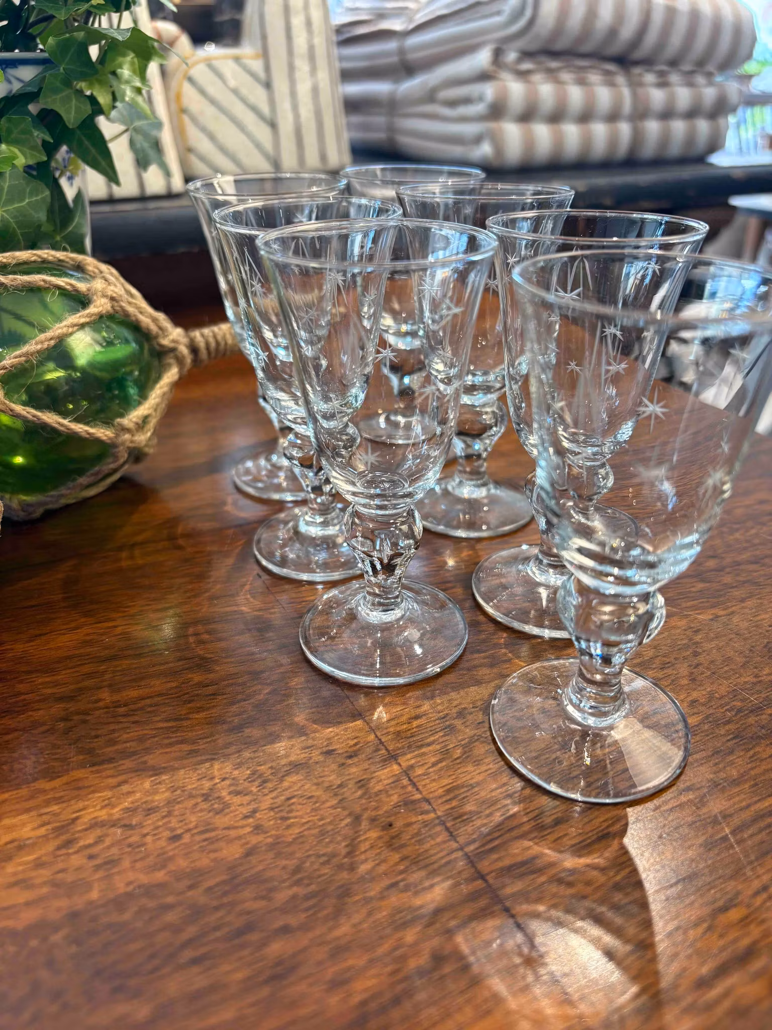7 snapsglas i glas med vacker slipad dekor. Perfekta för snaps eller avec. Höjd ca 10 cm. Fint skick.