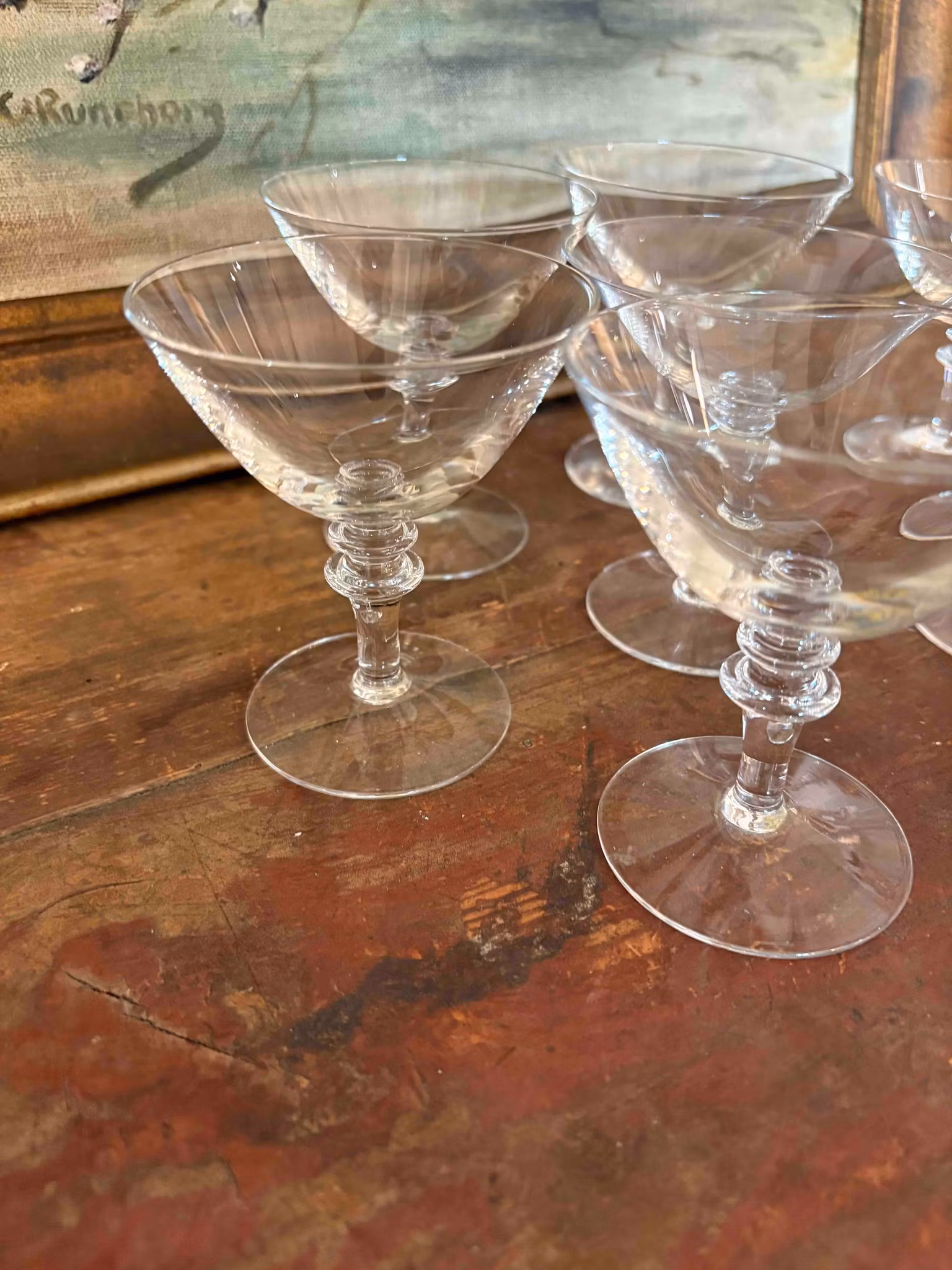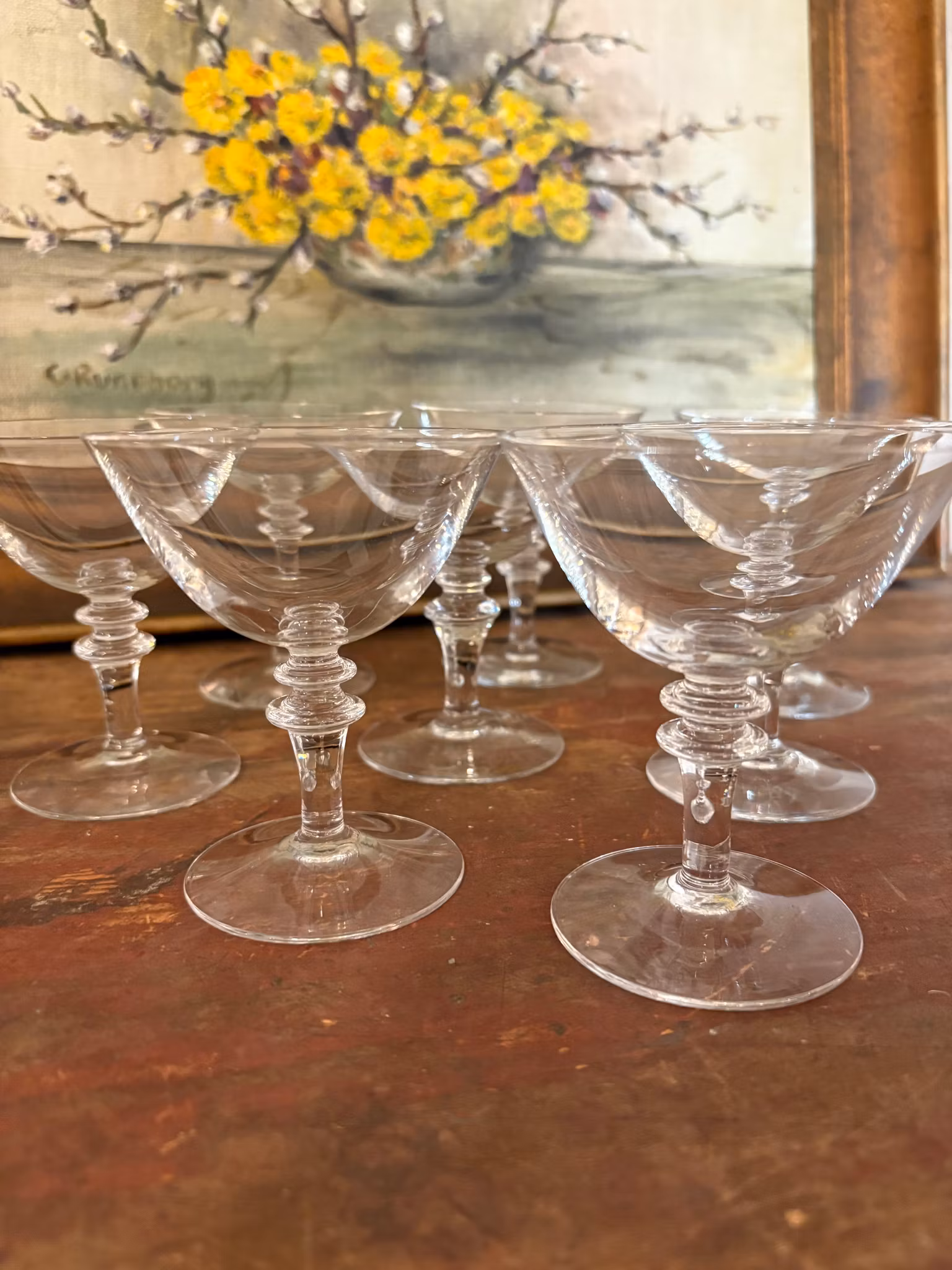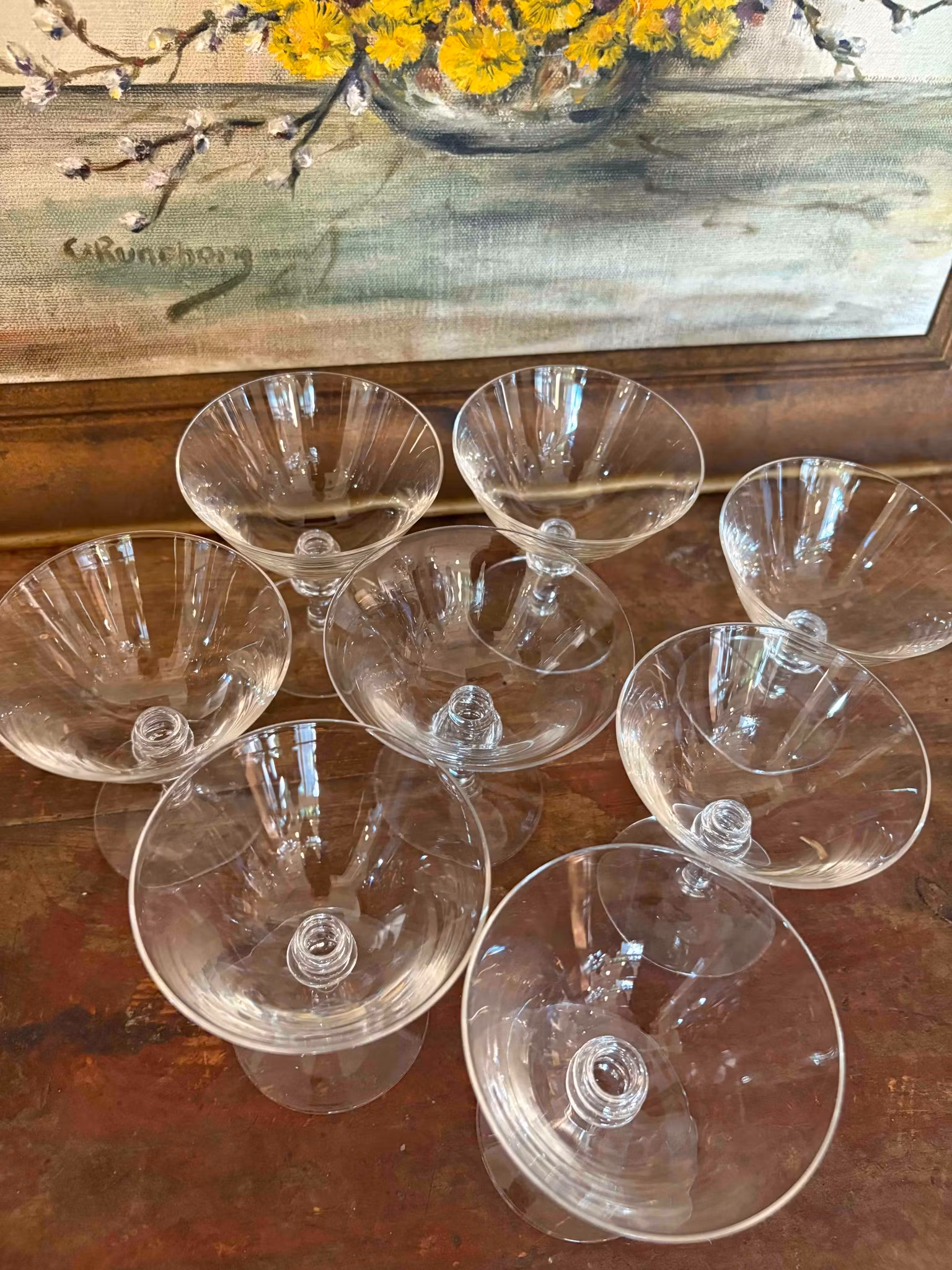 8 charmiga coupeglas, ca 9,5 cm höga och 8 cm i diameter. Perfekta för små förrätter eller desserter, i fint skick med liten unik variation.