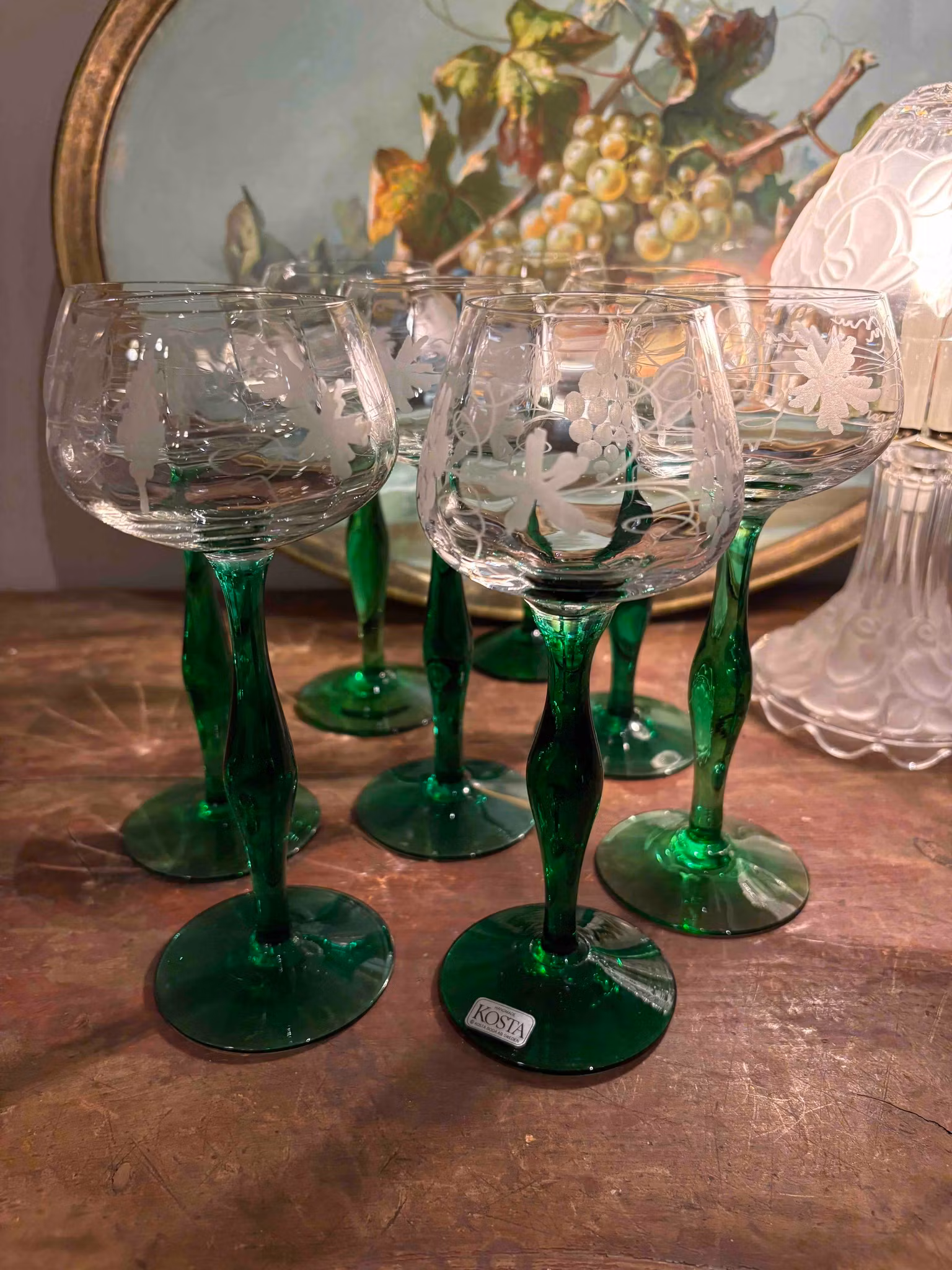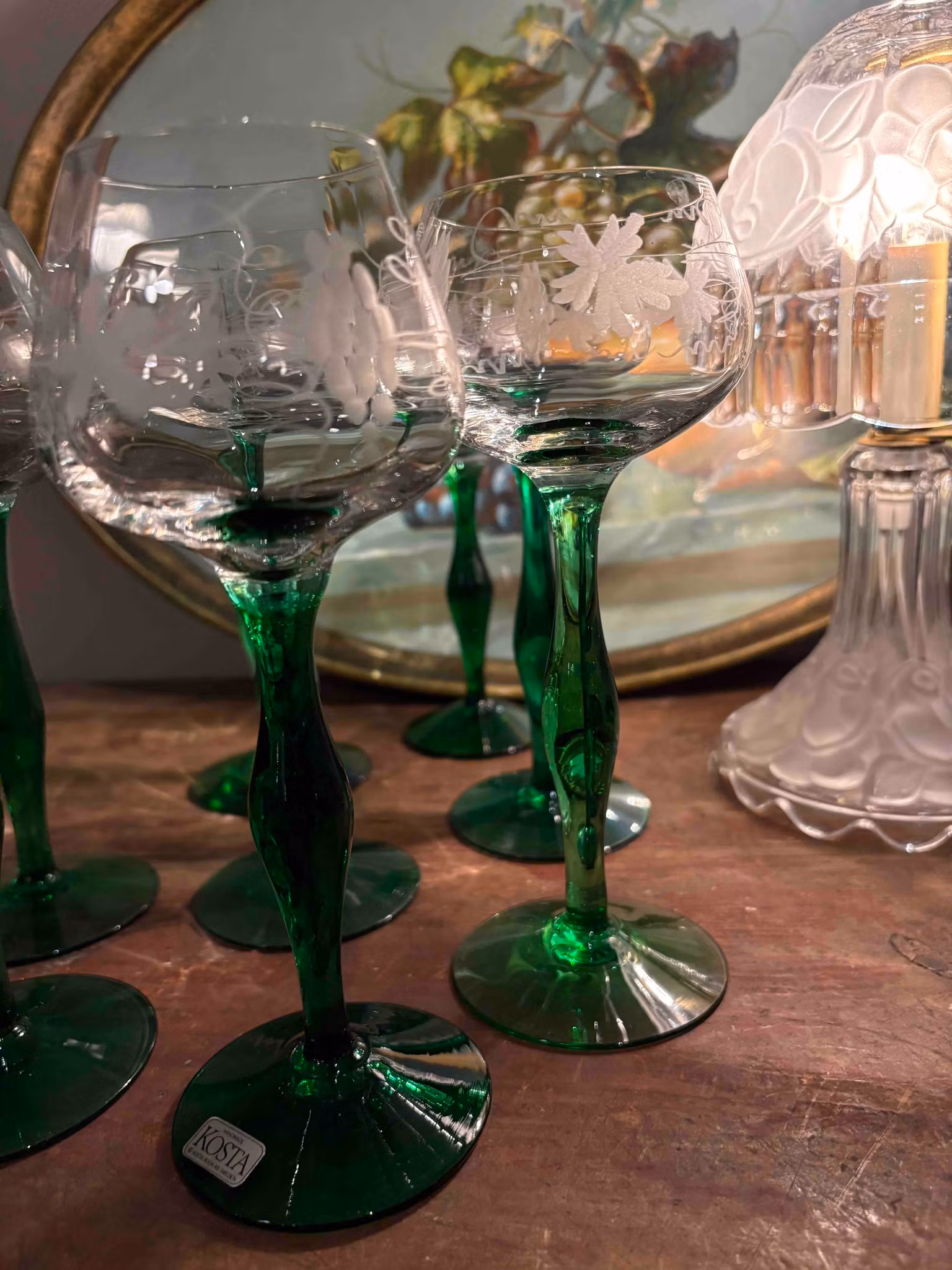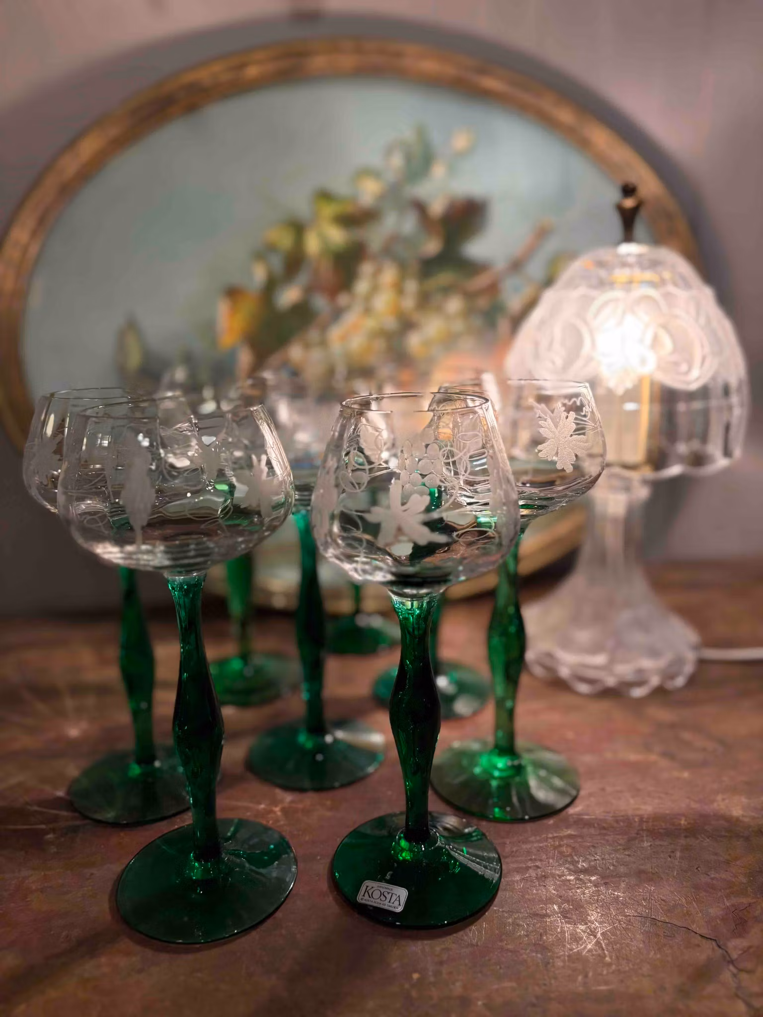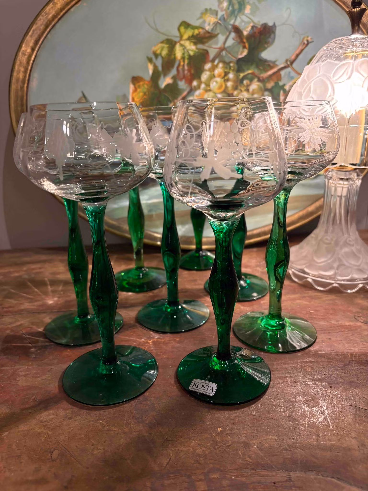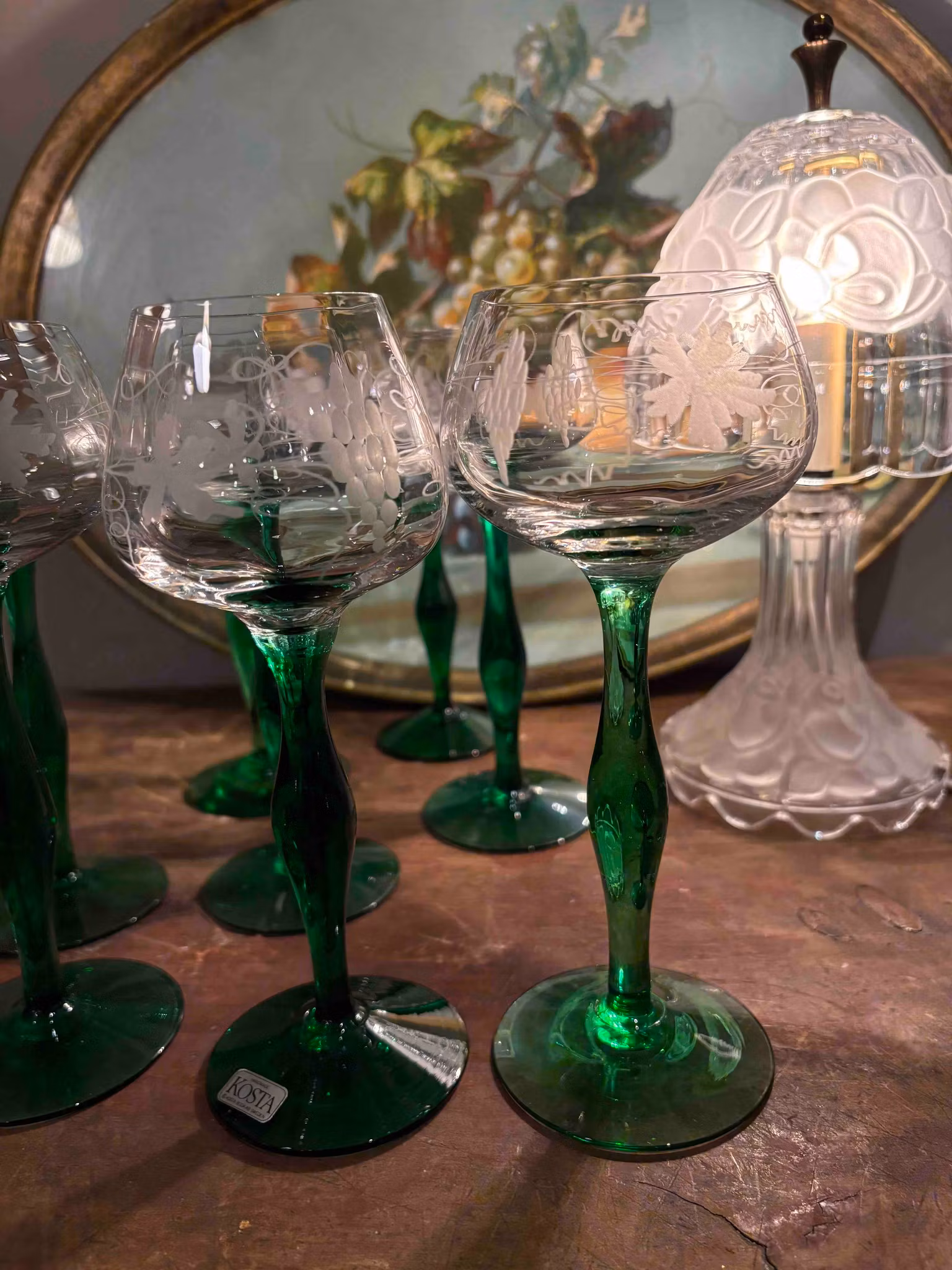 Kosta vinglas med grön fot – set om 8. Vackra glas med etsad dekor och unika variationer. Perfekta som samlarobjekt eller till dukningen. Vintage vinglas Kosta.