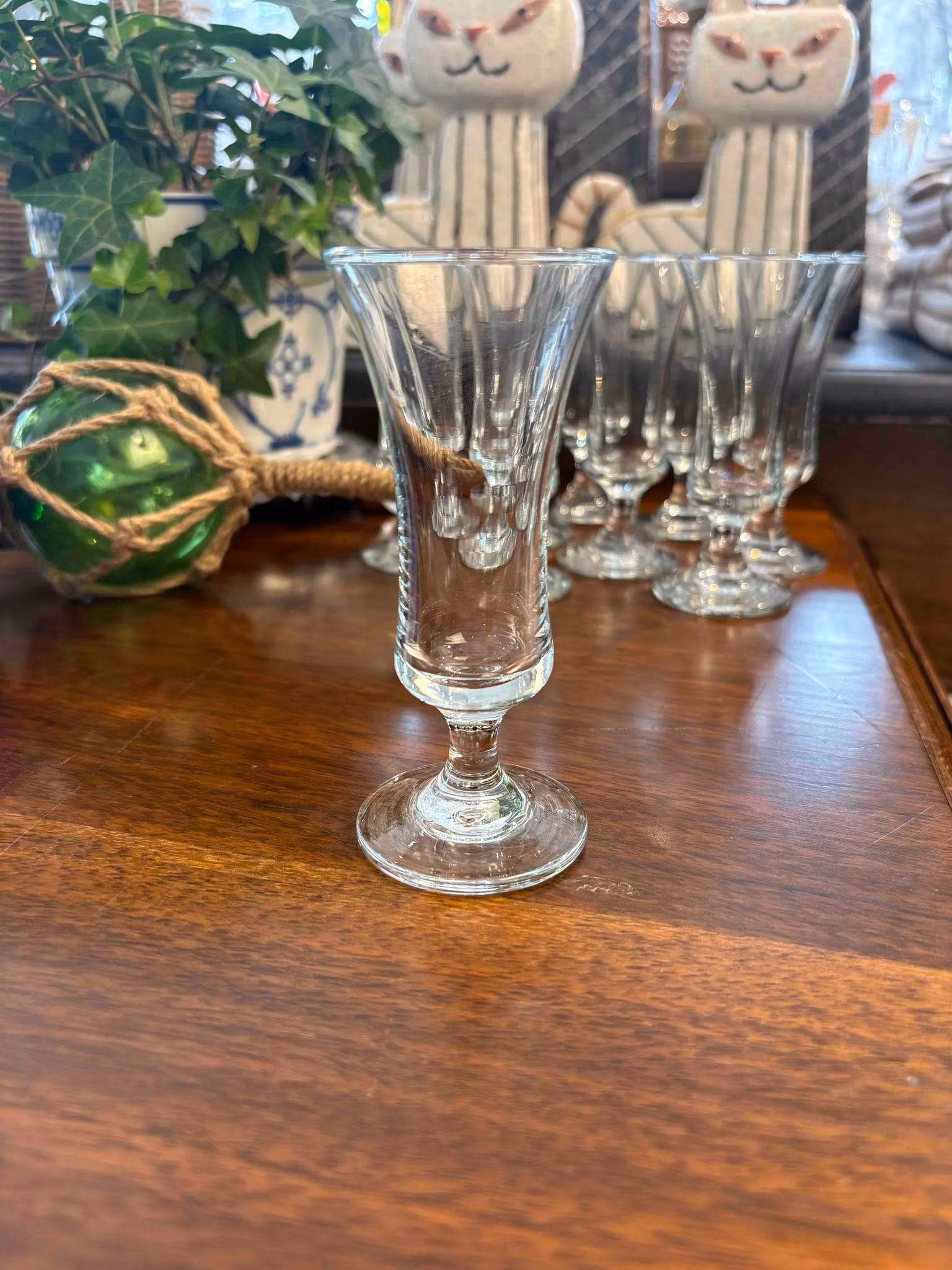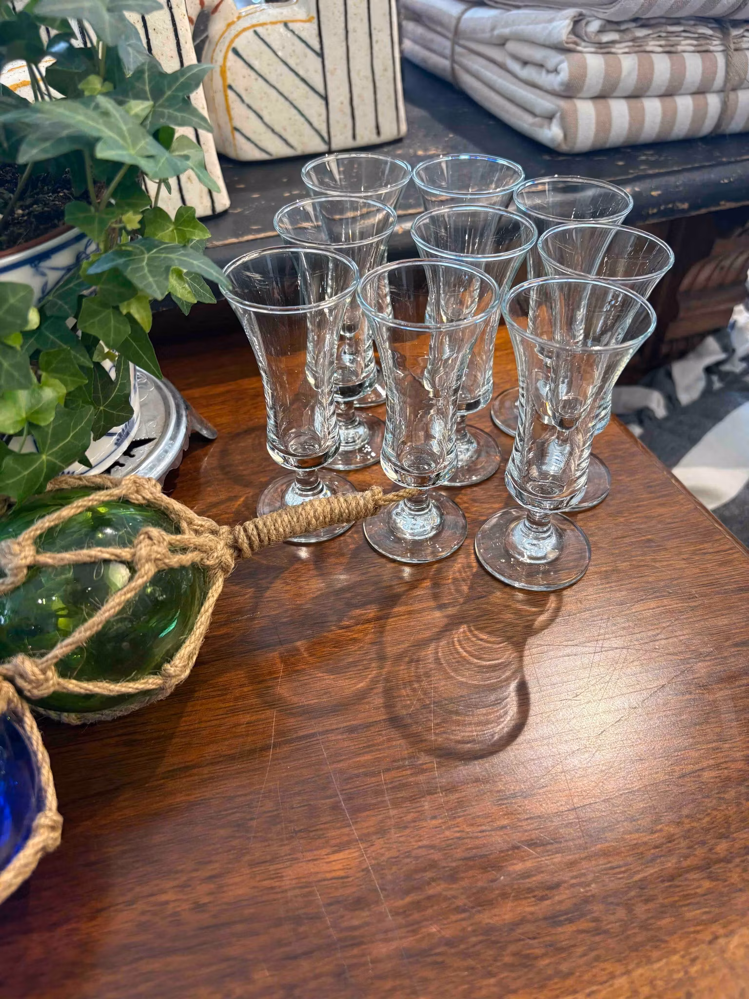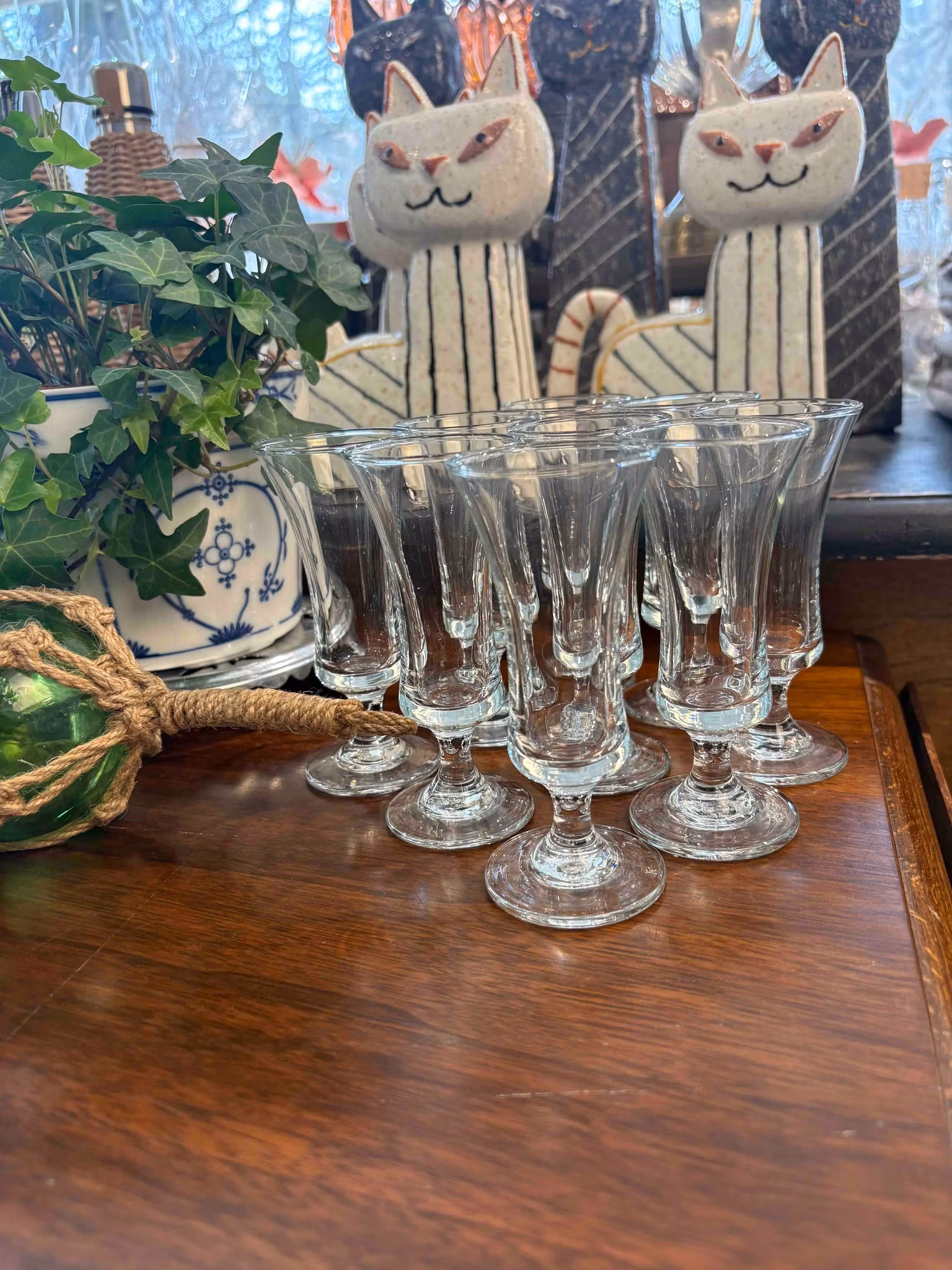 9 vackra snapsglas på fot med nätt form och tidlös känsla. Perfekta till dukning, snaps eller avec. Höjd ca 11 cm. Fint skick.