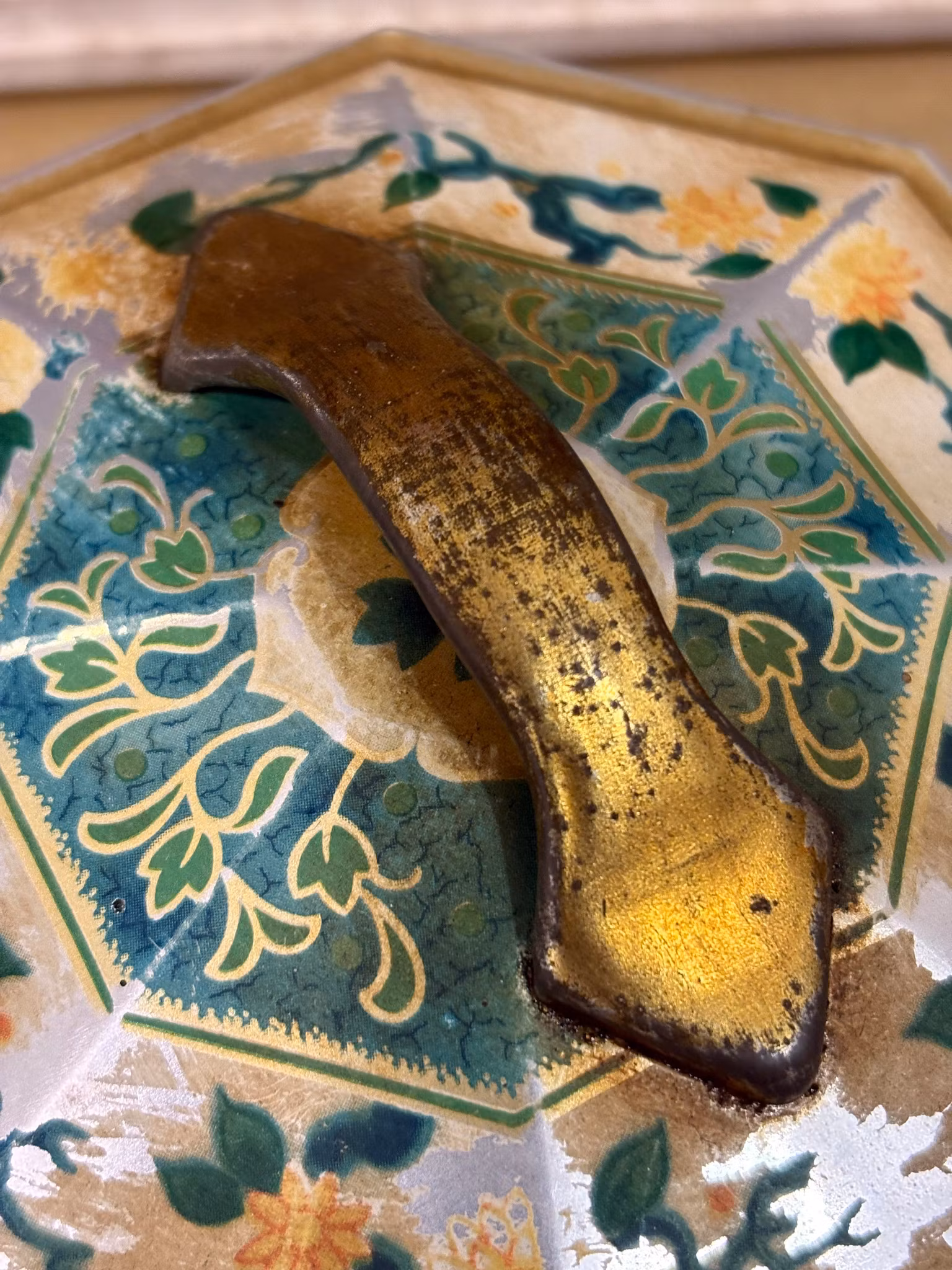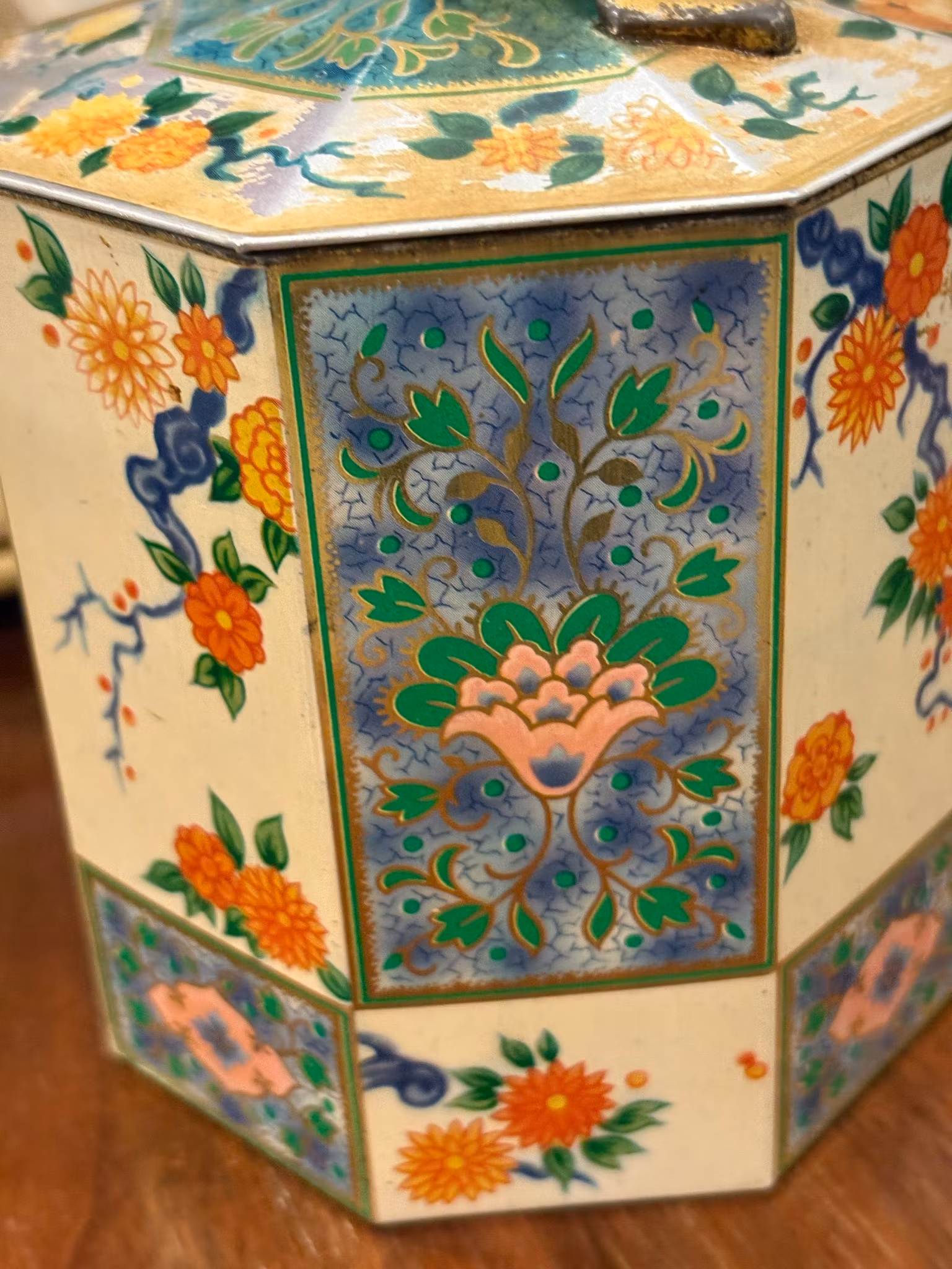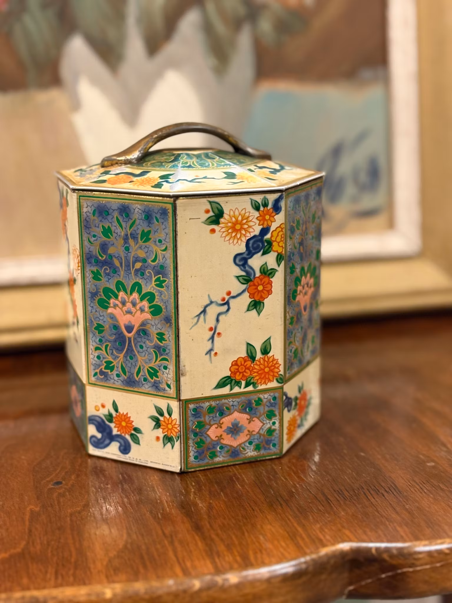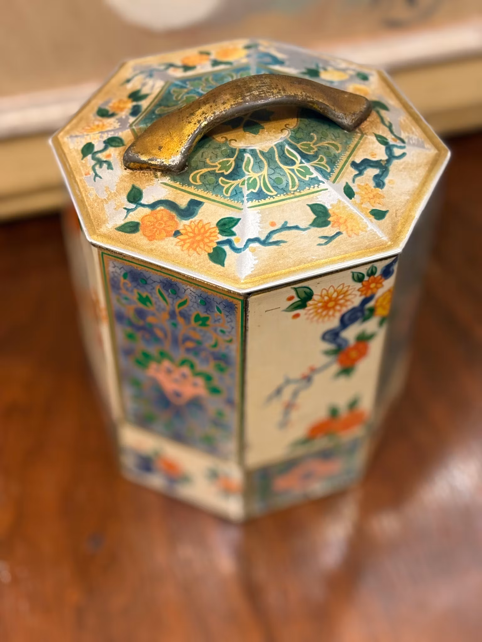 Äldre teburk i plåt med vackert mönster och patina. En charmig och tidlös detalj i bruksskick – perfekt som dekoration eller förvaring i köket.