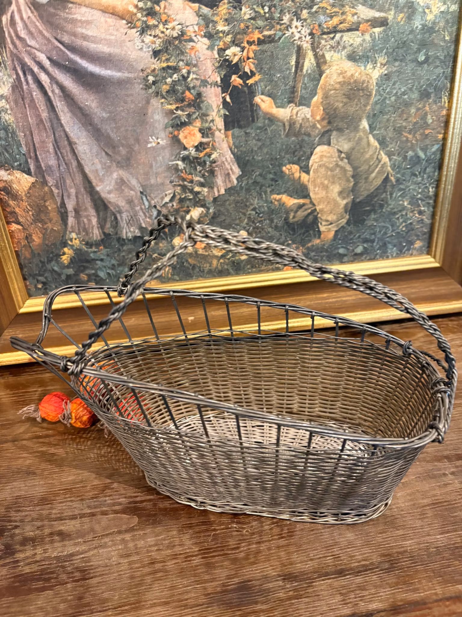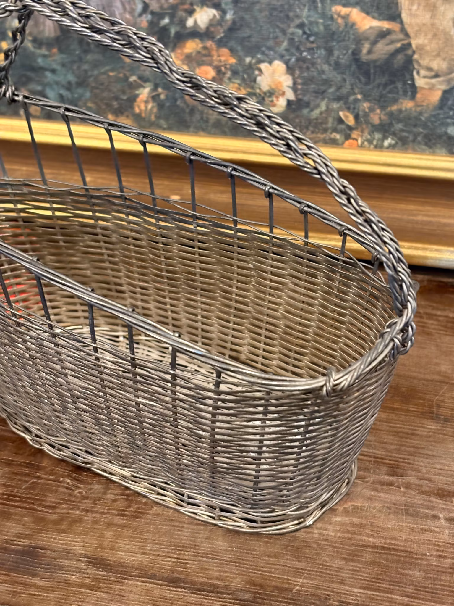 Äldre vinkorg i metall. Perfekt för servering av vin eller som dekorativ detalj i hemmet. L ca 26,5 cm, H ca 20,5 cm. Fint bruksskick.
