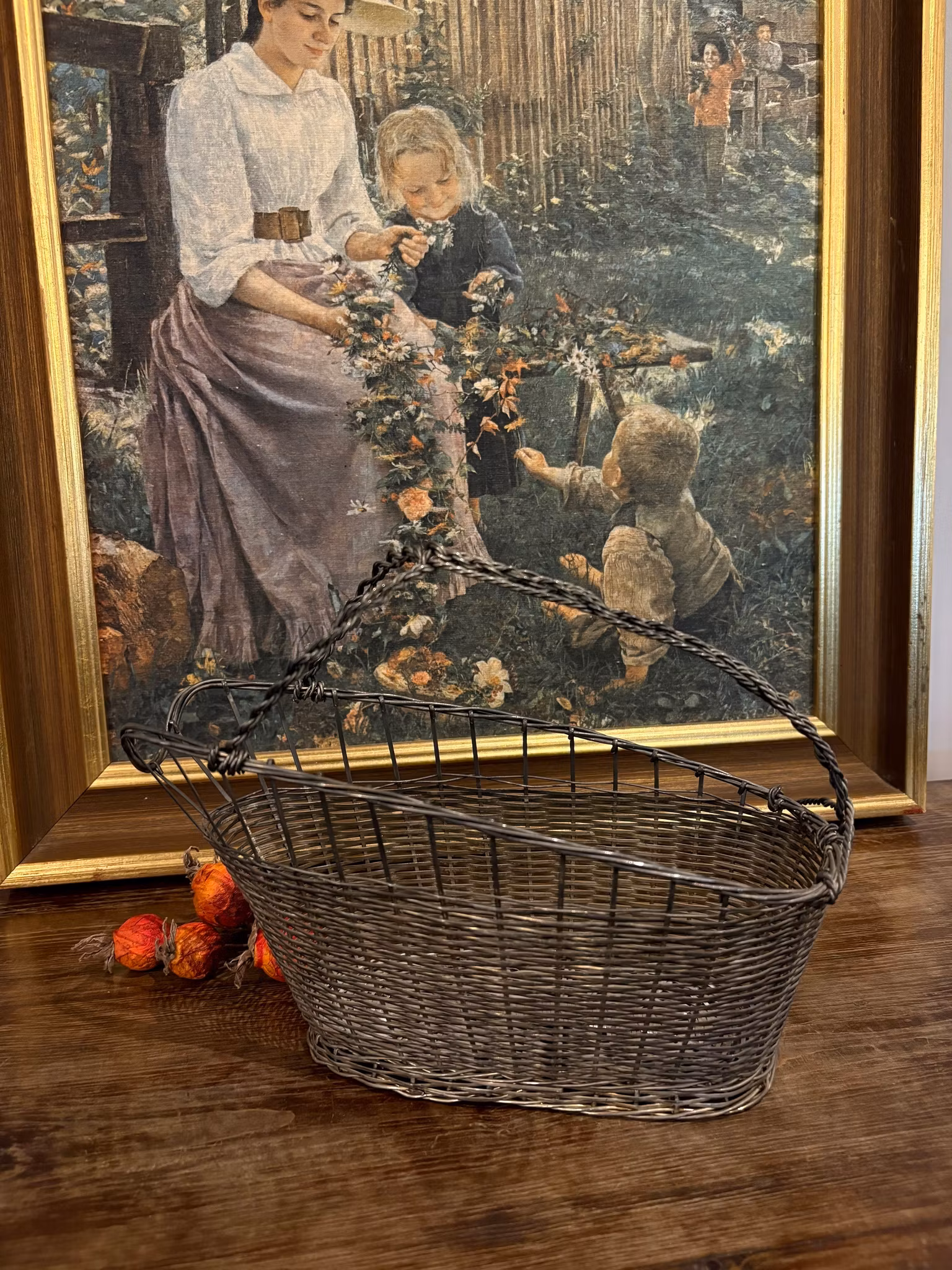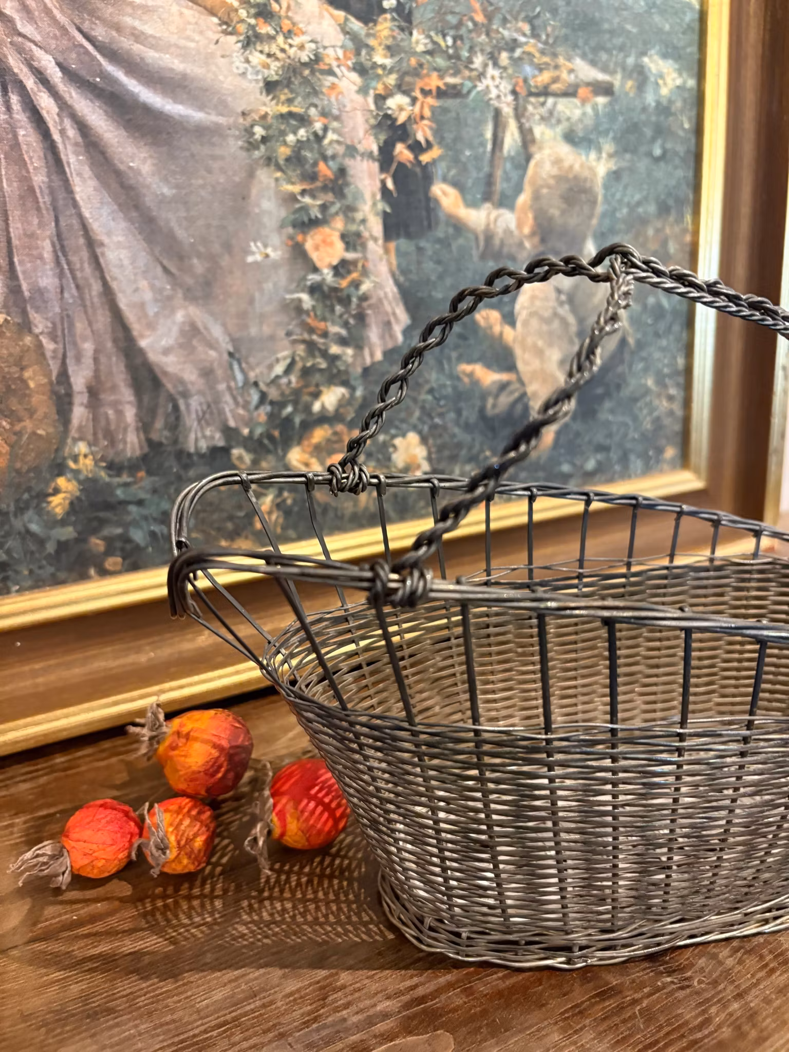 En vacker äldre vinkorg i metall – perfekt för att servera vinflaskan med stil eller som dekorativ detalj i köket eller matsalen.