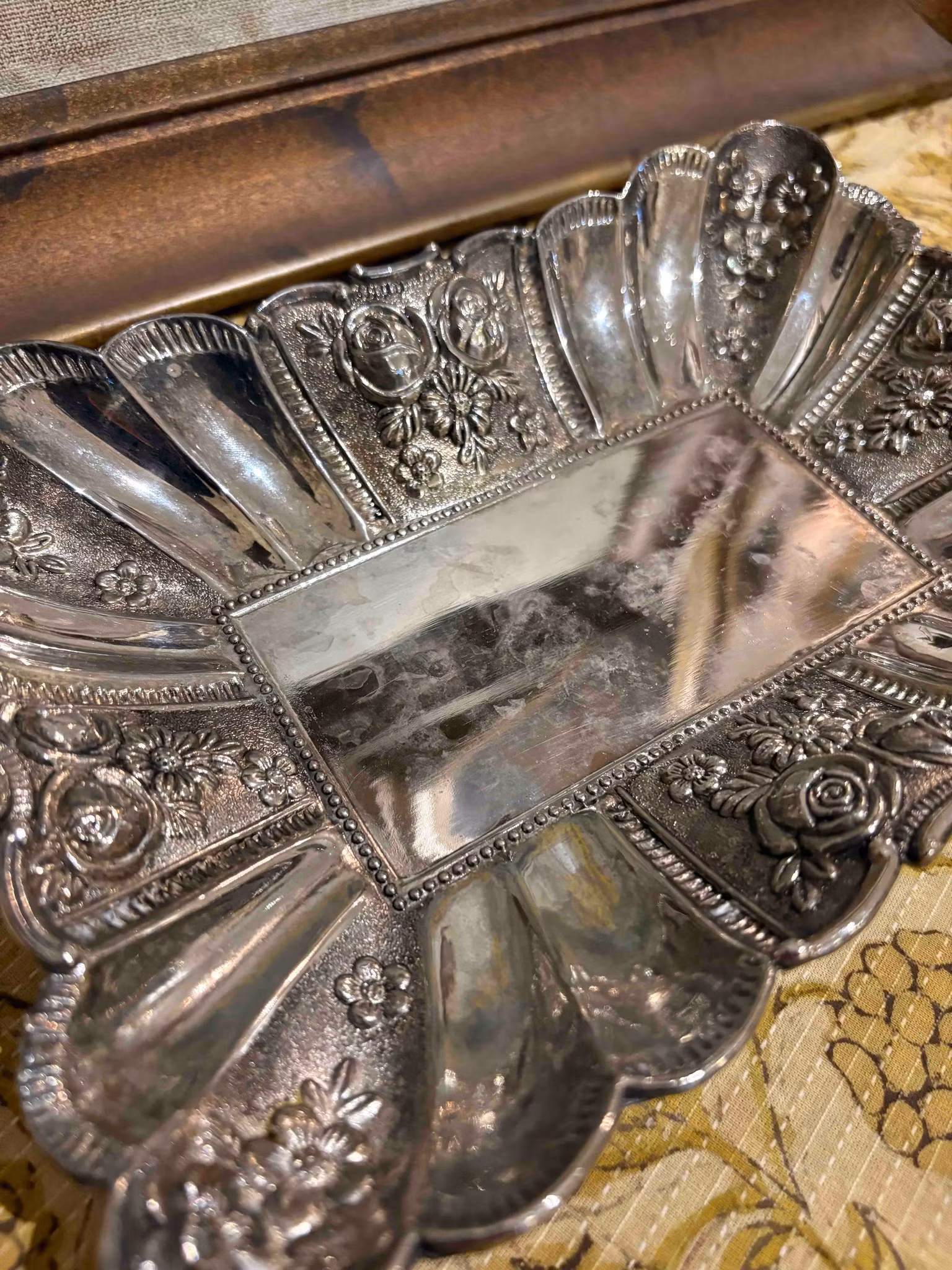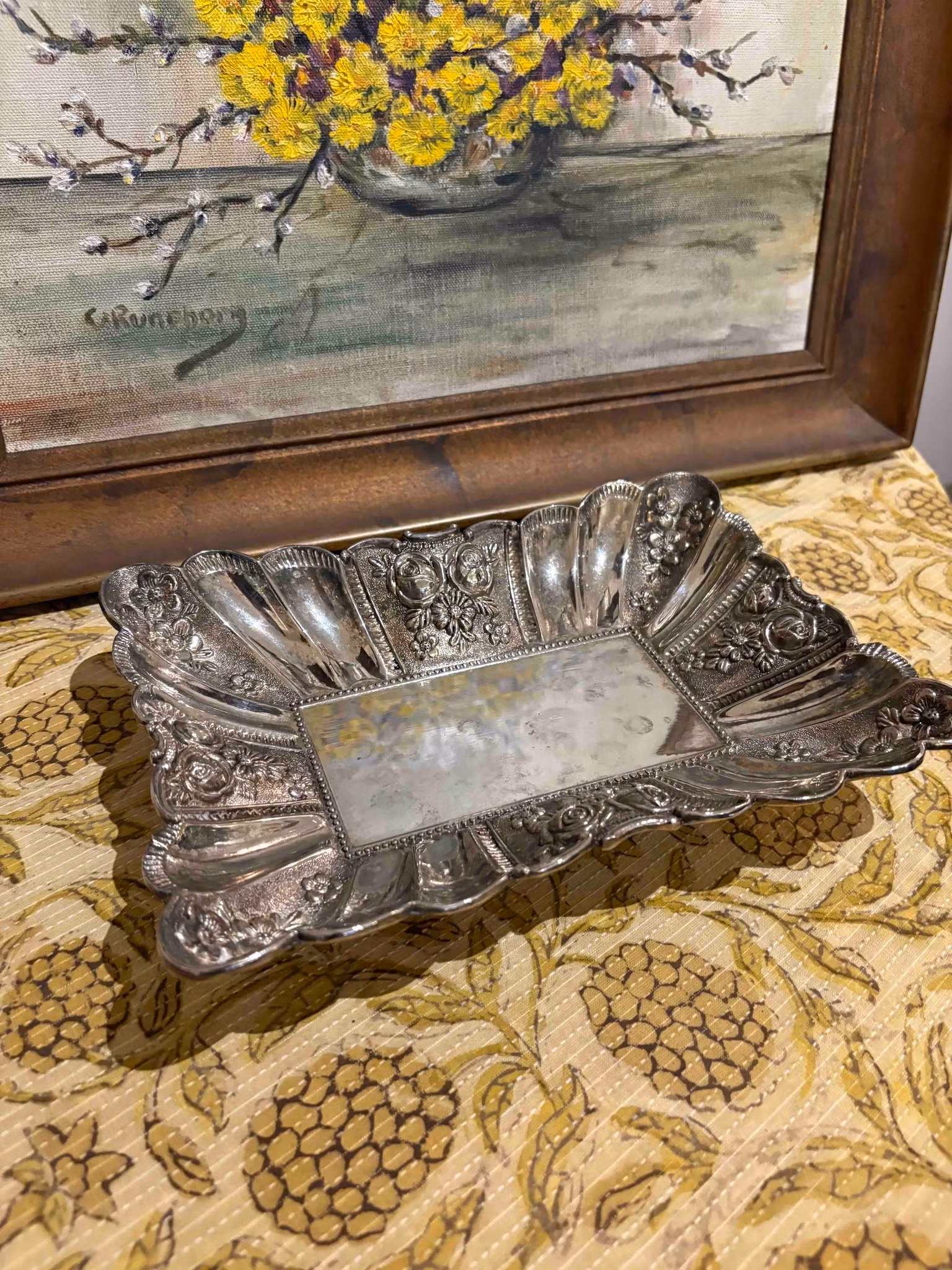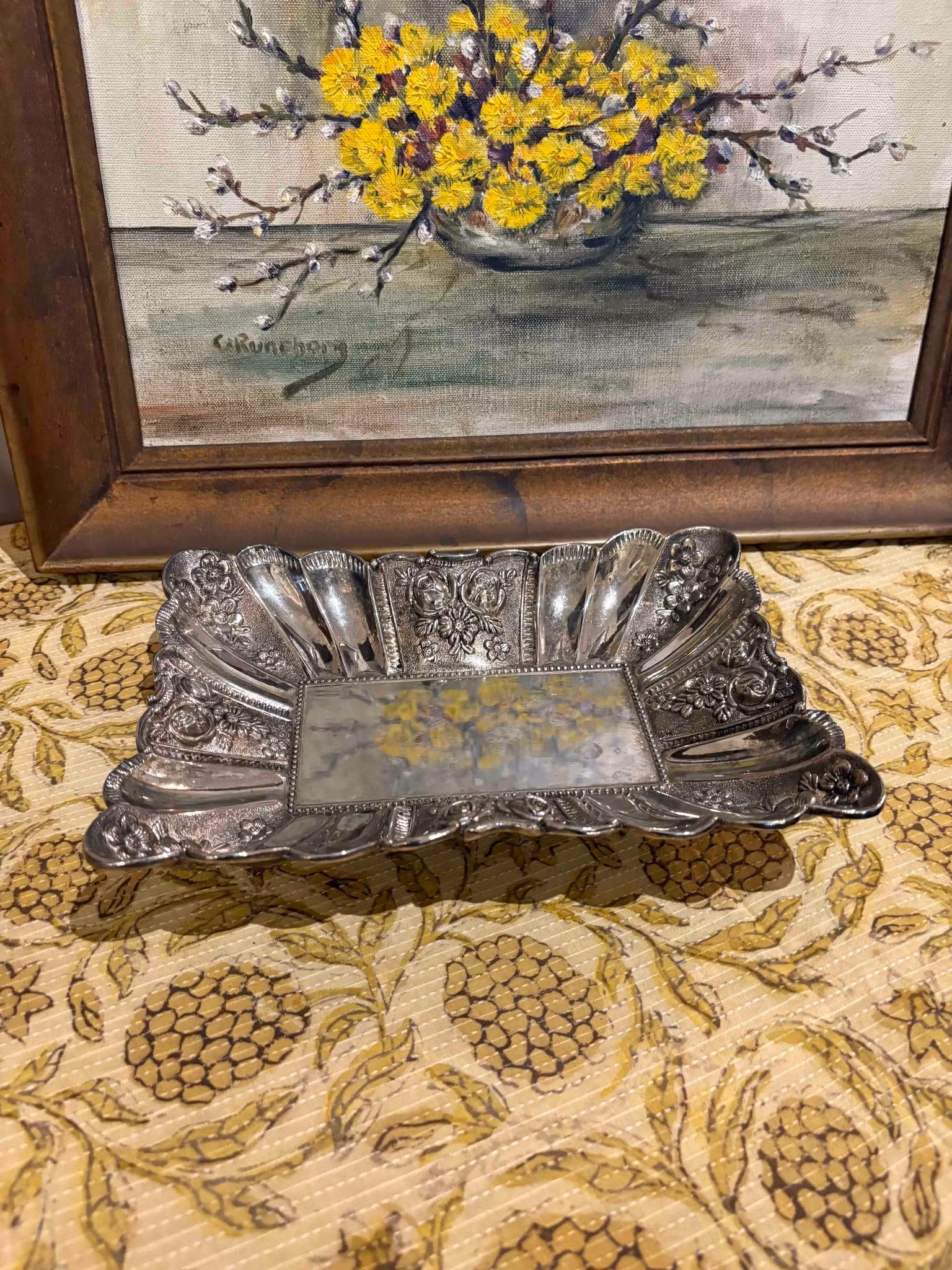 Ett charmigt fat som bär spår av tid och omsorg. Den avlånga formen vilar på fyra små fötter som lyfter det med lätthet och ger en elegant resning. Längs kanten löper vackra detaljer som fångar ljuset på ett stillsamt sätt.
