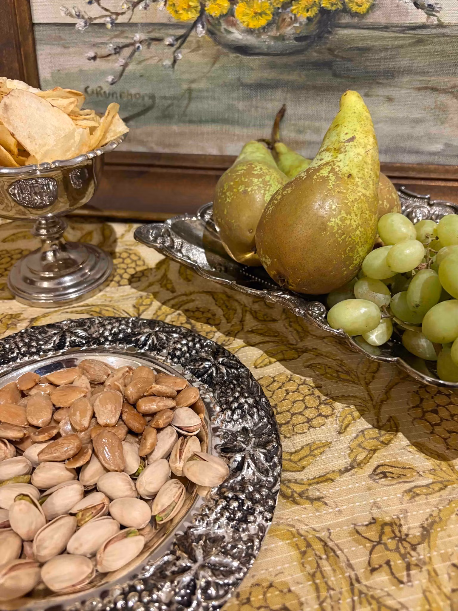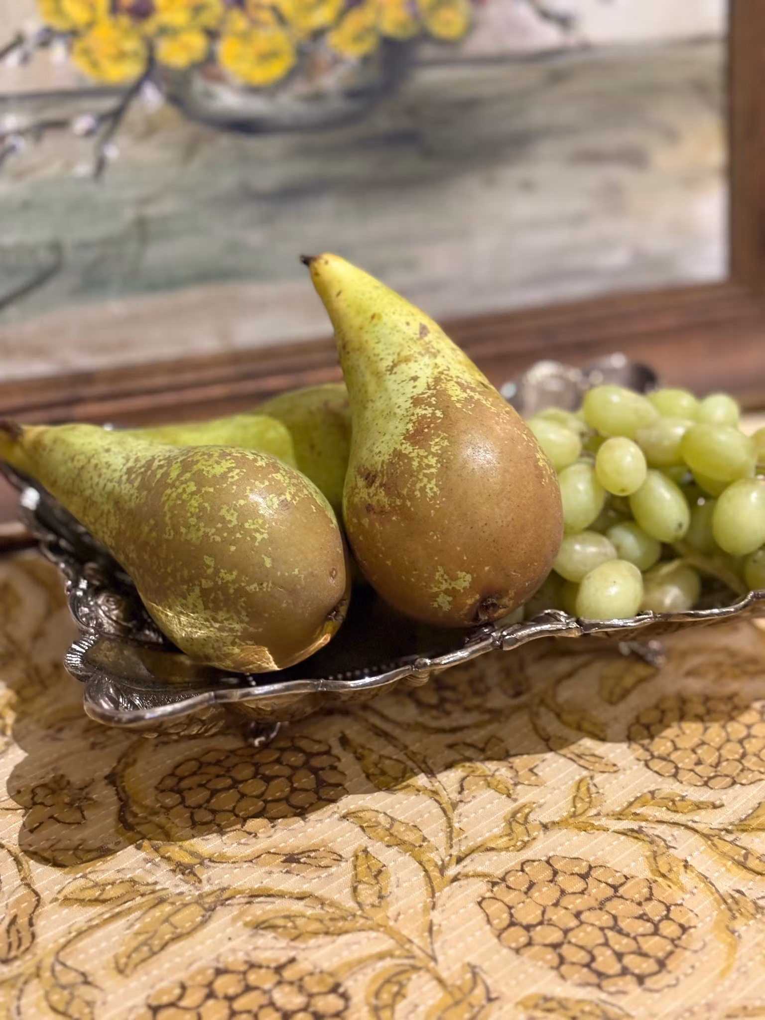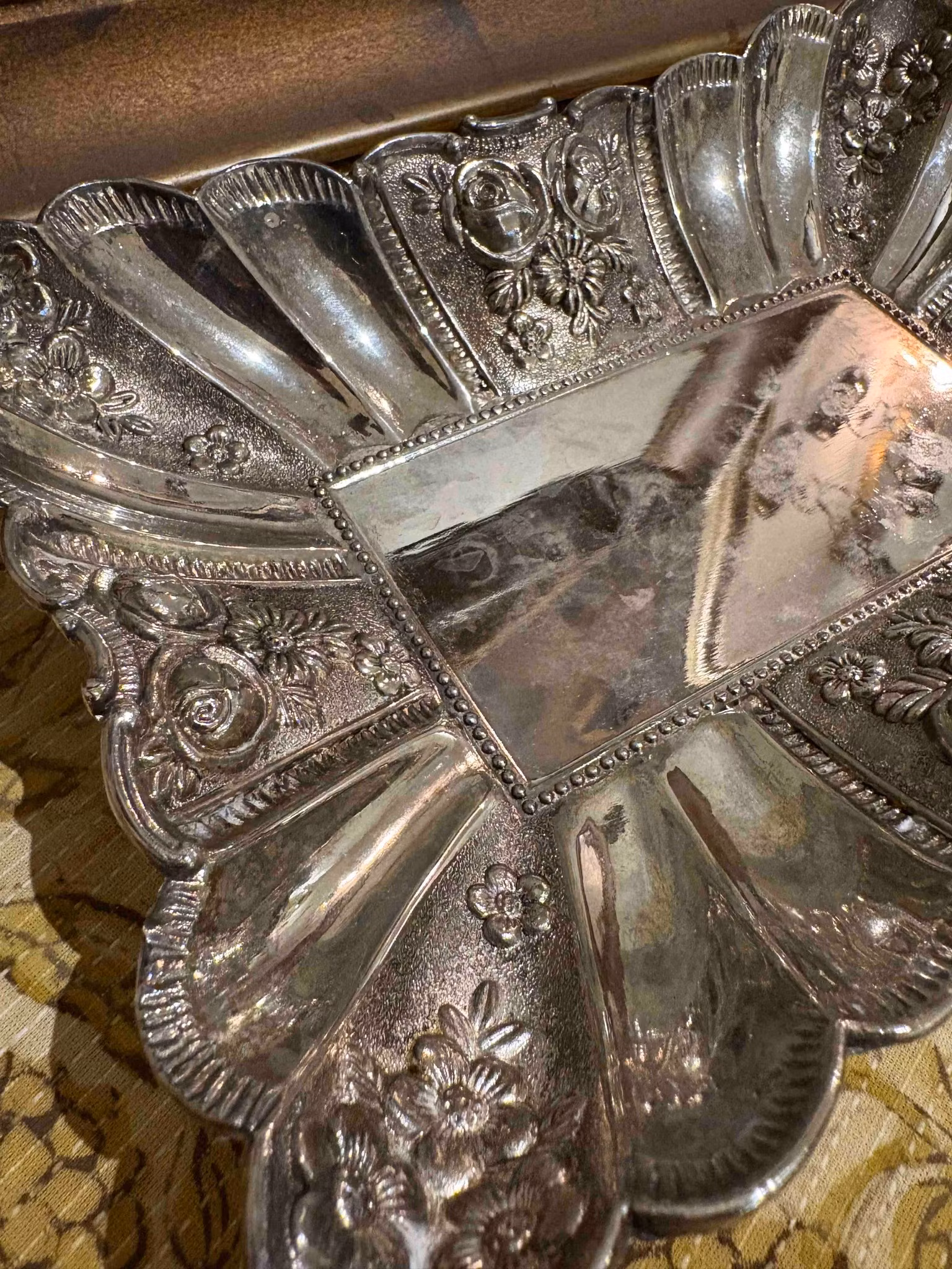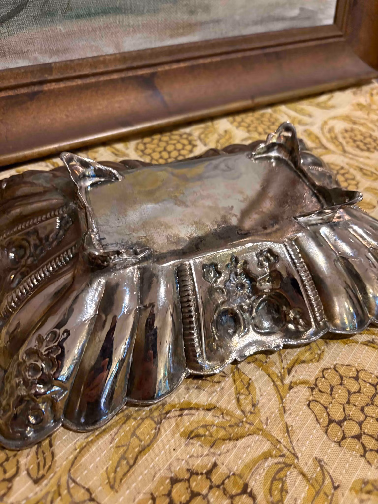 Ett charmigt fat som bär spår av tid och omsorg. Den avlånga formen vilar på fyra små fötter som lyfter det med lätthet och ger en elegant resning. Längs kanten löper vackra detaljer som fångar ljuset på ett stillsamt sätt.