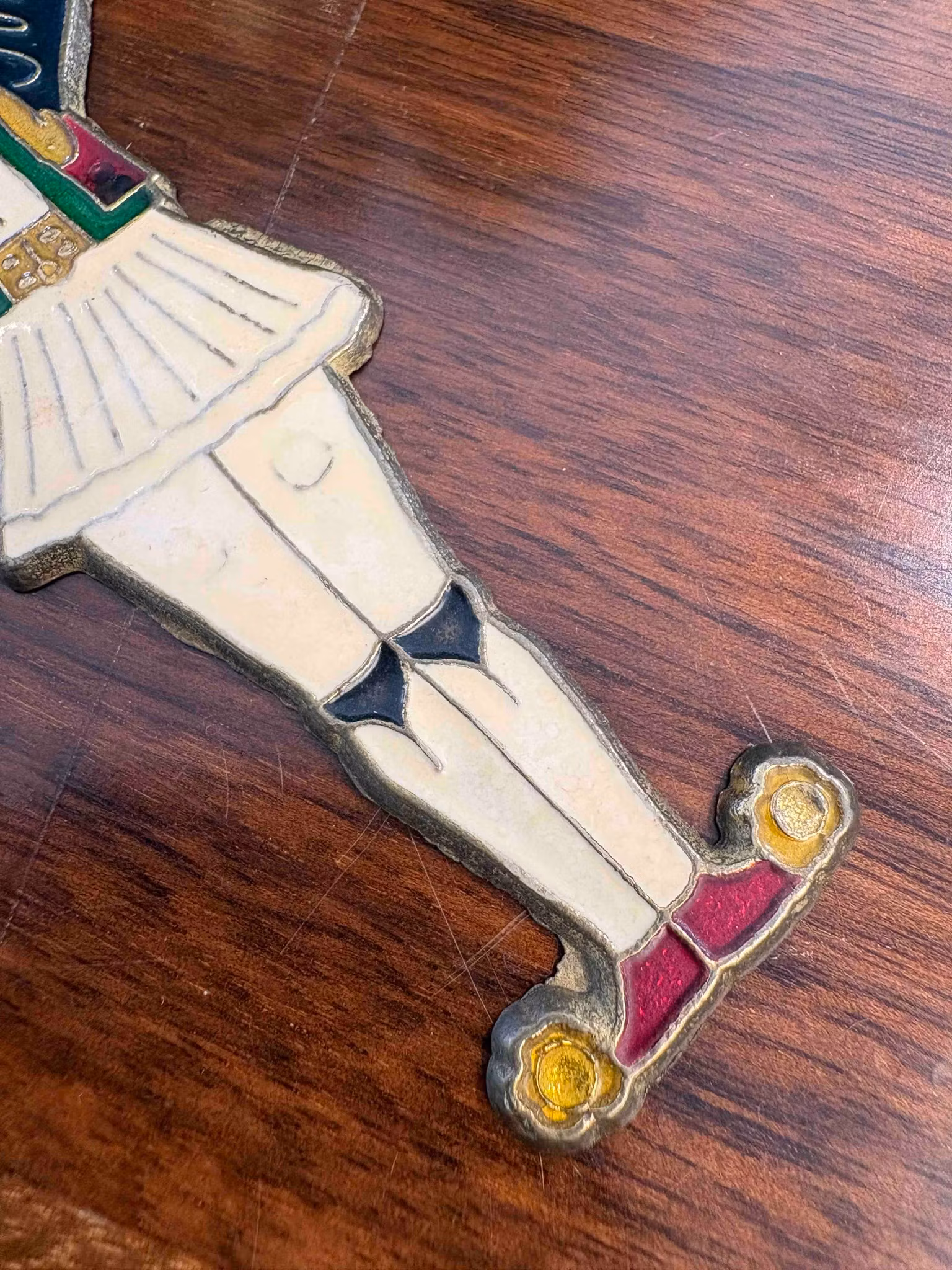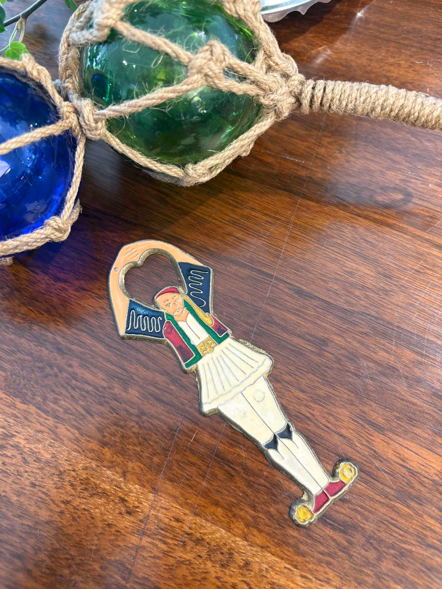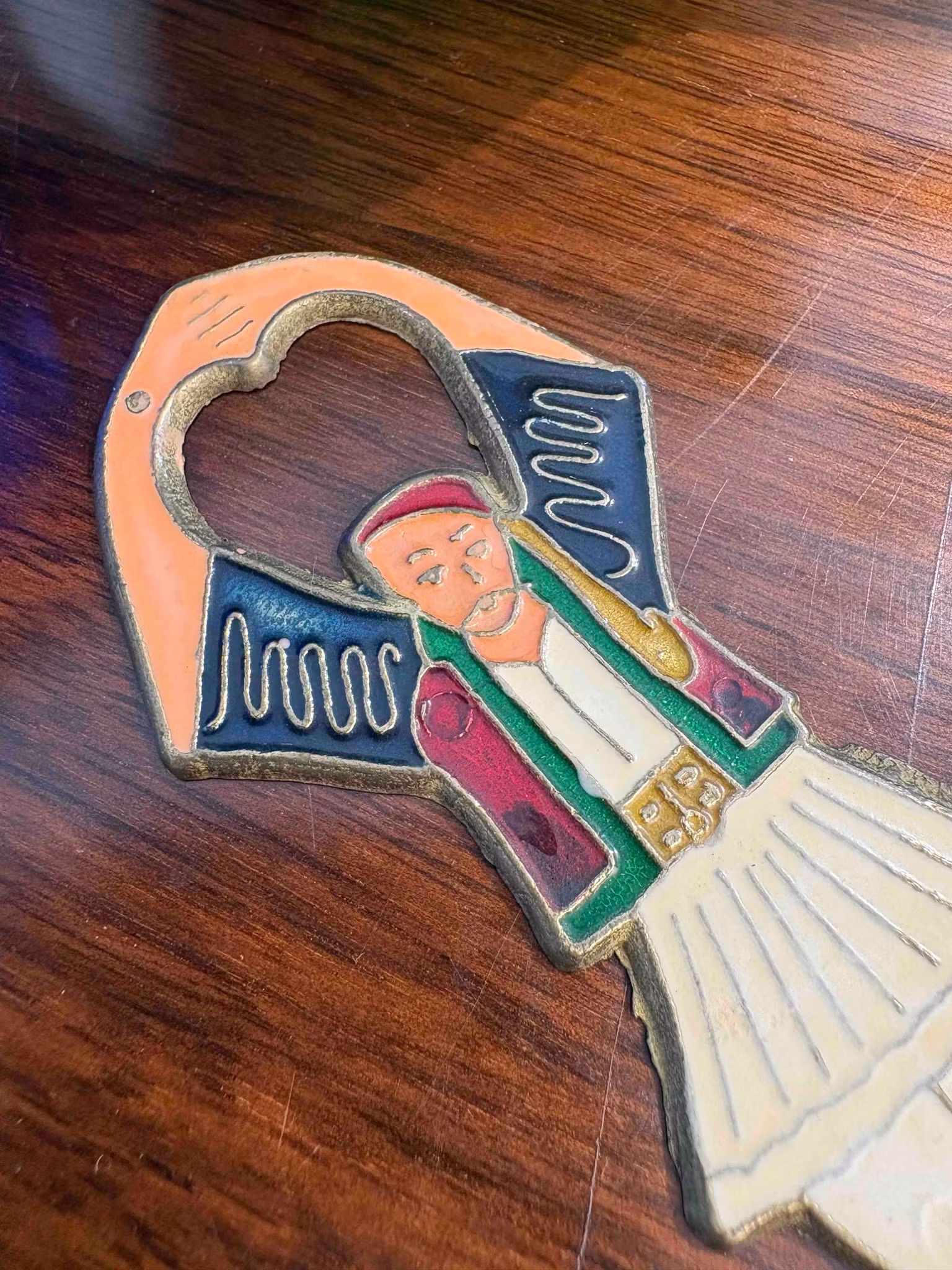 Charmig öppnare i metall med emaljerad yta. Praktisk och dekorativ detalj för hemmet. Längd ca 13 cm. Fint skick.