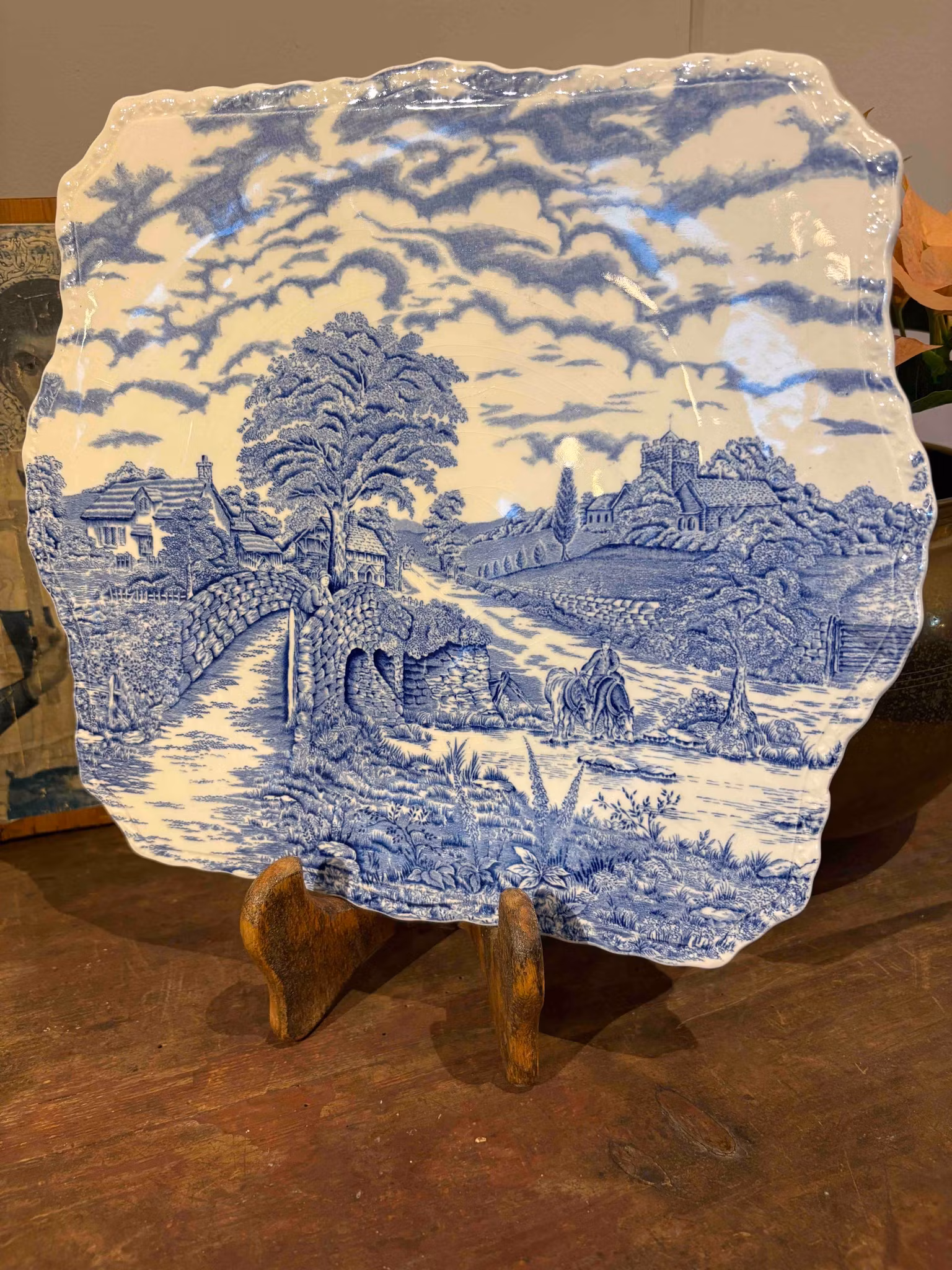 Ett vackert fat från Myott, England, i klassiskt blåvitt porslin. Det har ett harmoniskt mönster och en form som gör det lika dekorativt på väggen som användbart vid servering. Ett riktigt fint tillskott för dig som gillar blåvitt eller engelskt porslin.