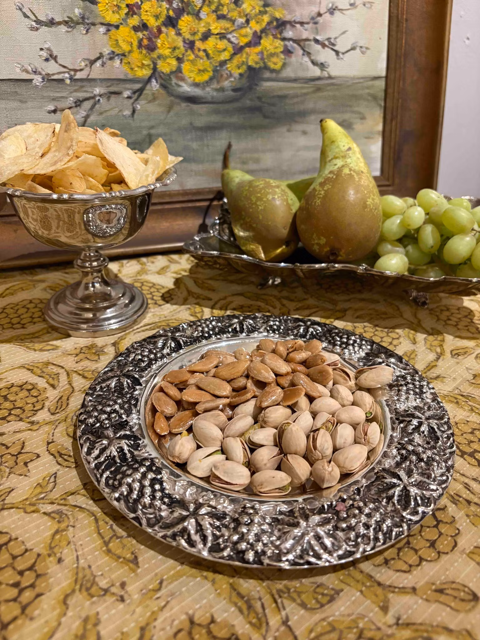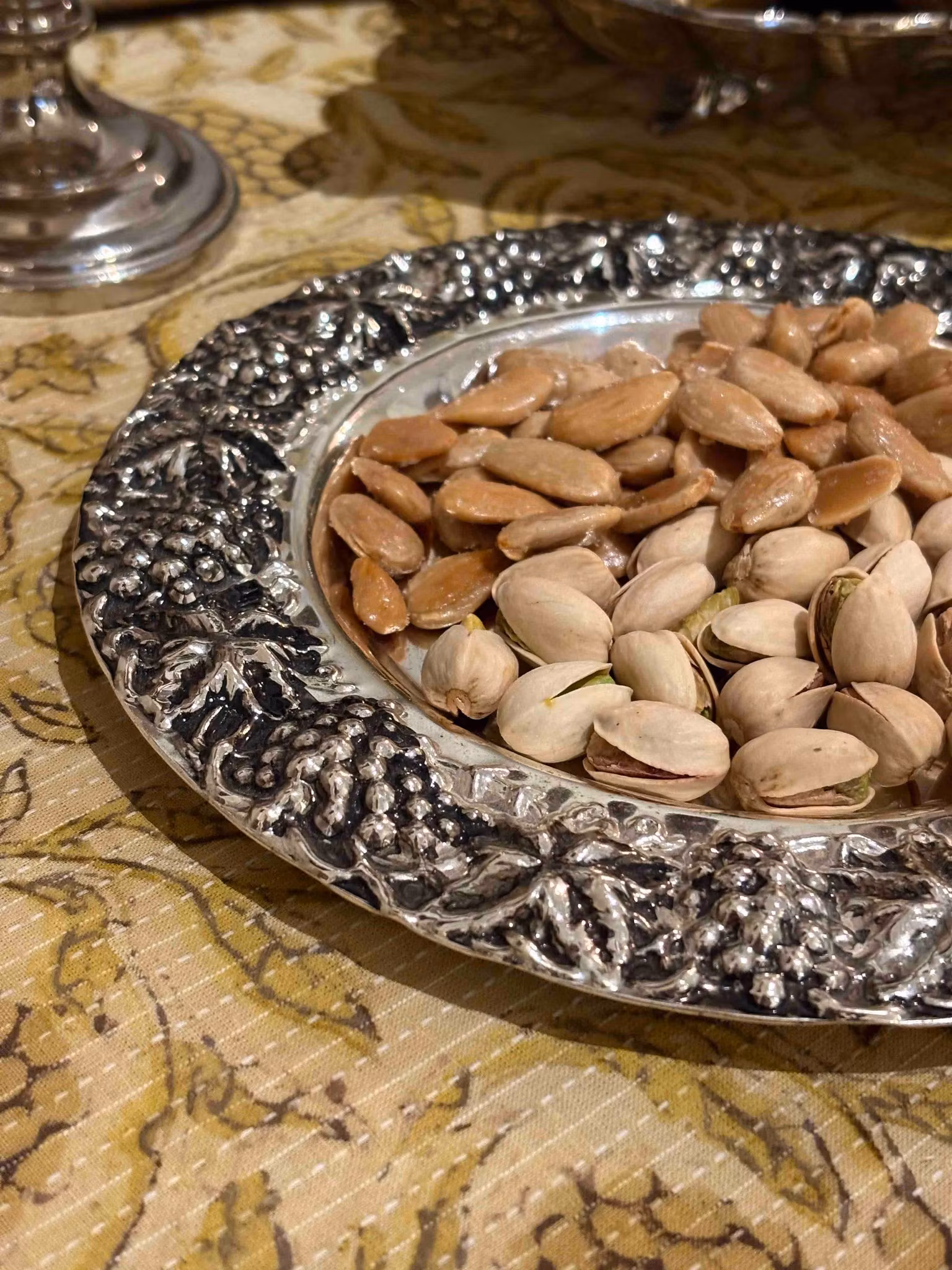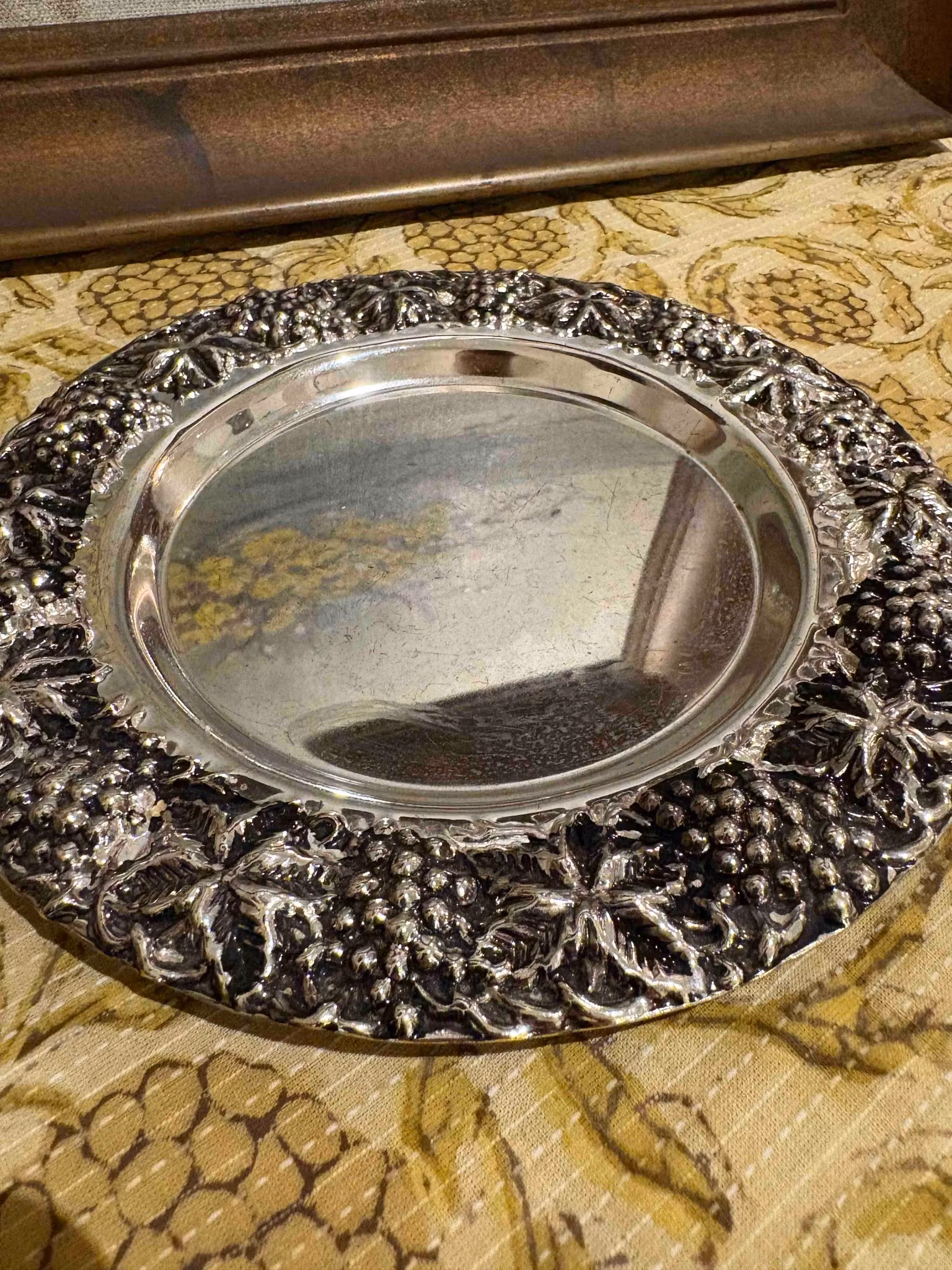 Fat eller underlägg med vackra detaljer. Perfekt till nötter eller som underlägg för en vinflaska. Dekorativt vintagefat med fint bruksskick, diameter ca 20,5 c