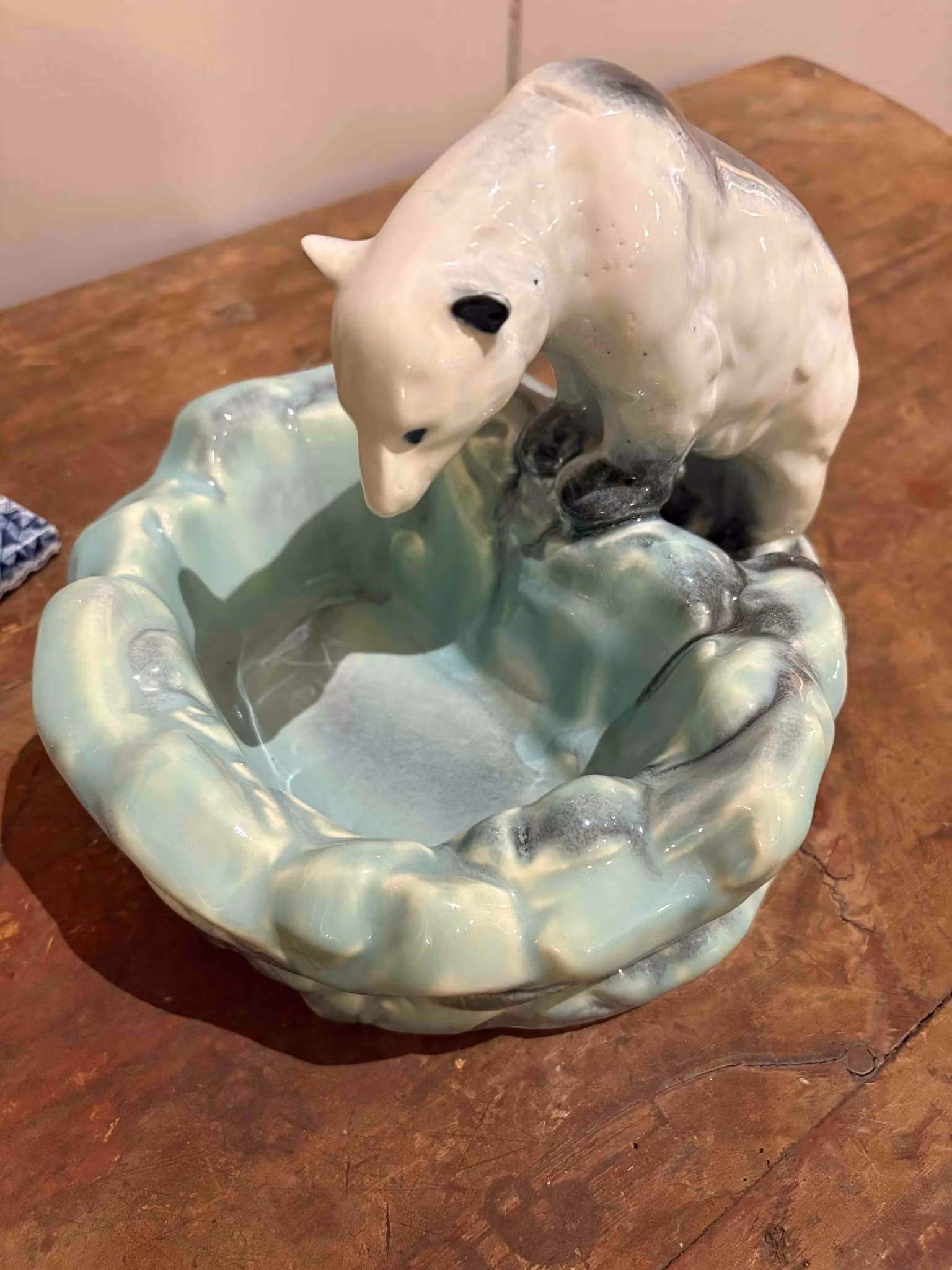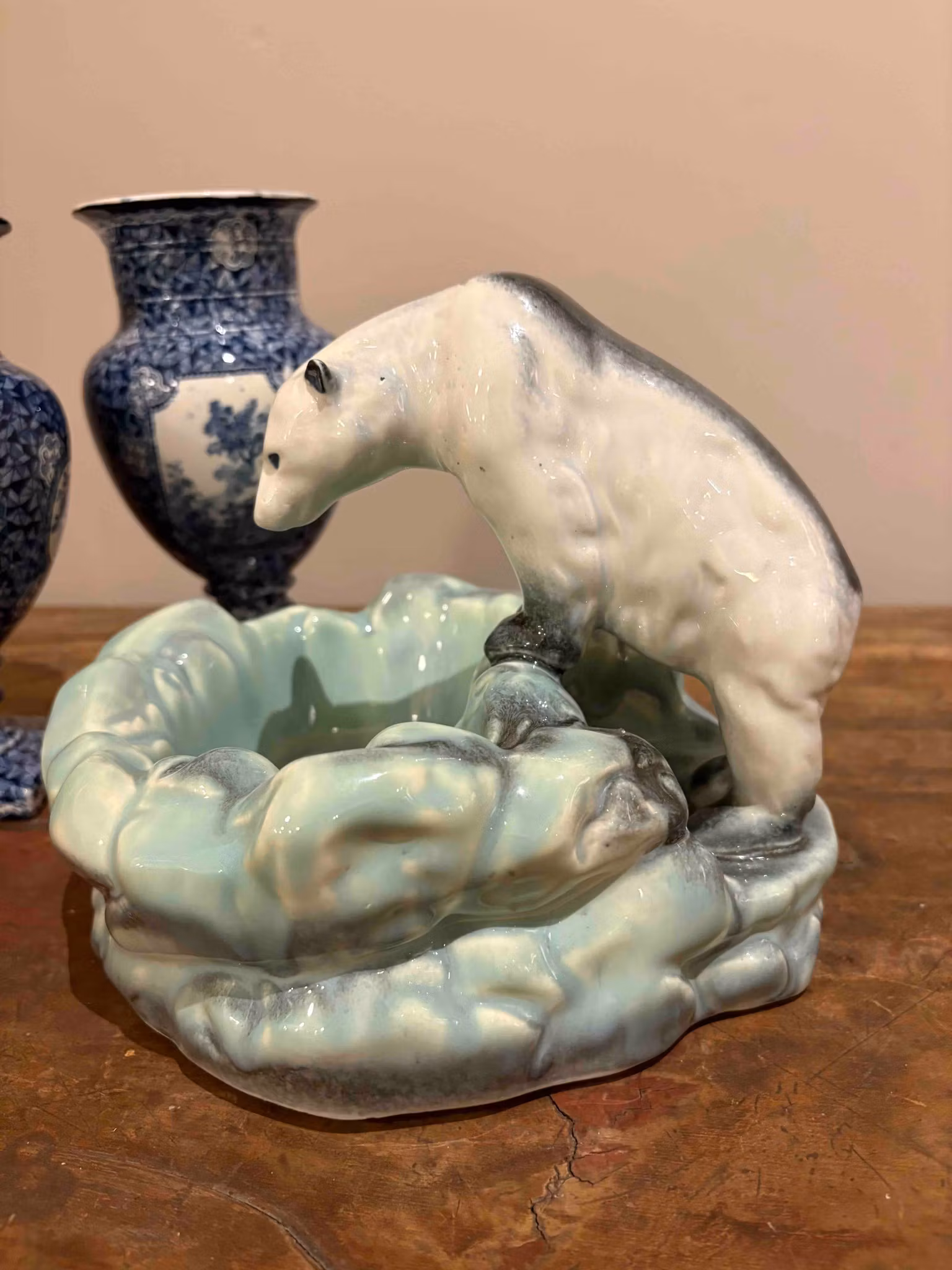Ett charmigt isbjörnsfat i porslin från 1900-talets senare del – ett föremål som fångar både vinterljus och stillheten i arktiska landskap. Formen är mjukt modellerad, med en björn som liksom vakar över det runda fatet, och den blanka glasyren ger hela pjäsen en känsla av sval elegans.